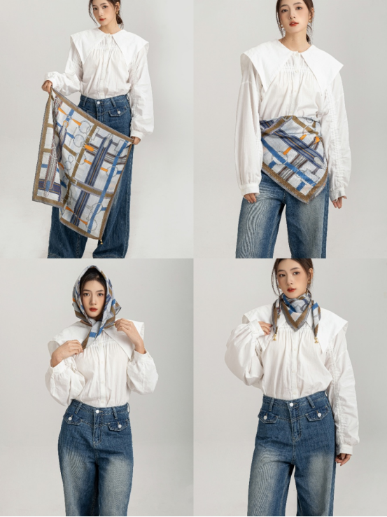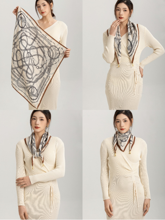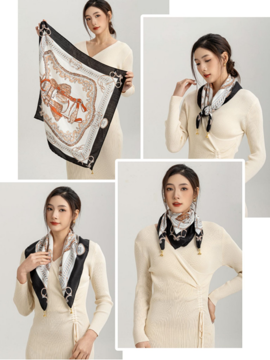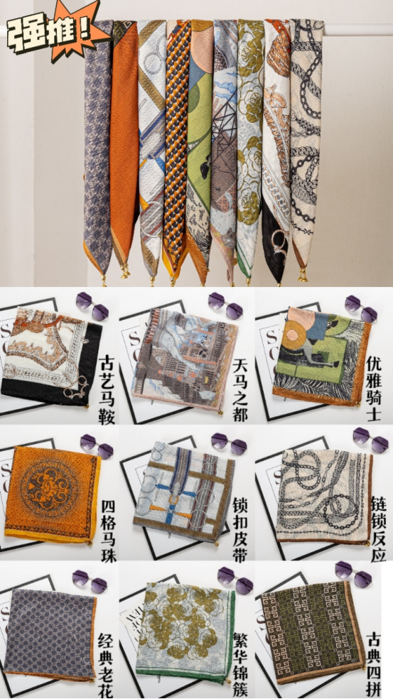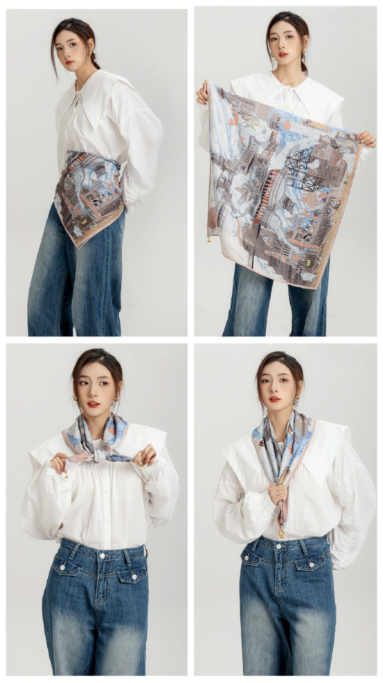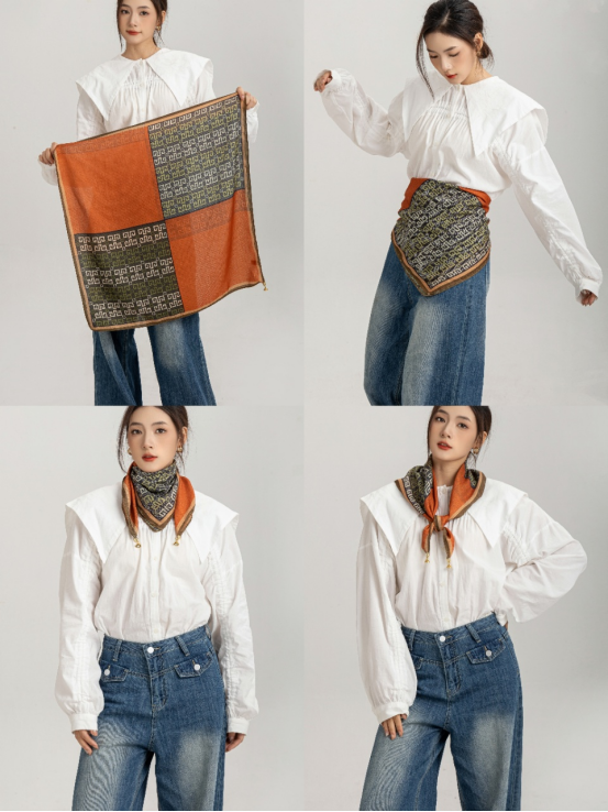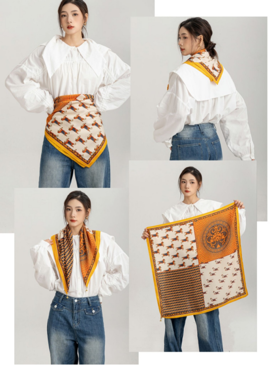 法式风情丝巾搭配|氛围感神器Get 一条优雅的丝巾提升整体的LOOK搭配优雅又简单的图案 大牌丝巾的特点都是有一些马、马具、马鞍等等元素搭配亮丽的橘色 “四格拼接马”围巾款式增加了围巾的艺术感 具有浓郁的复古风格,不仅适合搭配休闲装, 也适合搭配正装,展现出独特的品味和气质。 无论是系在头上 还是点缀在颈脖 都是满满的高级感 春日穿搭小Tips