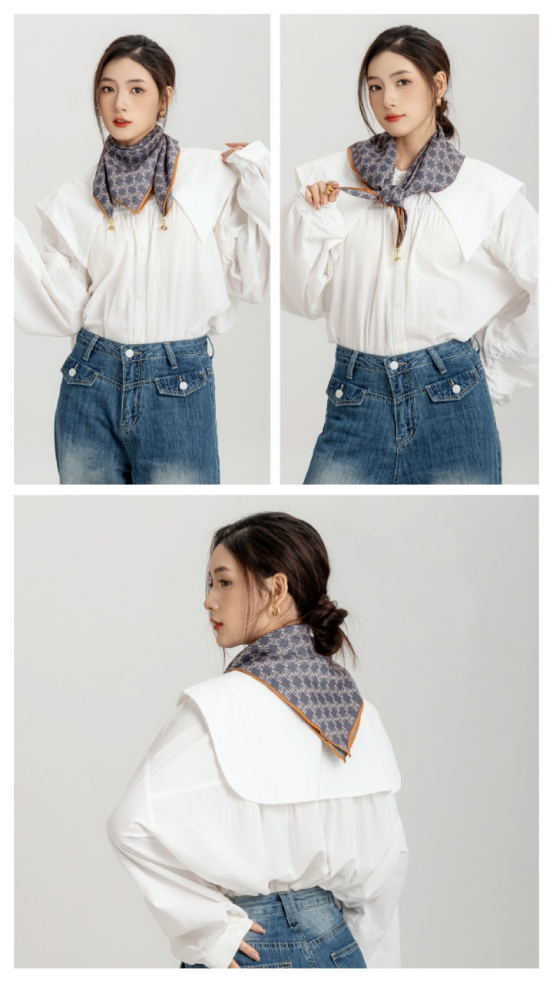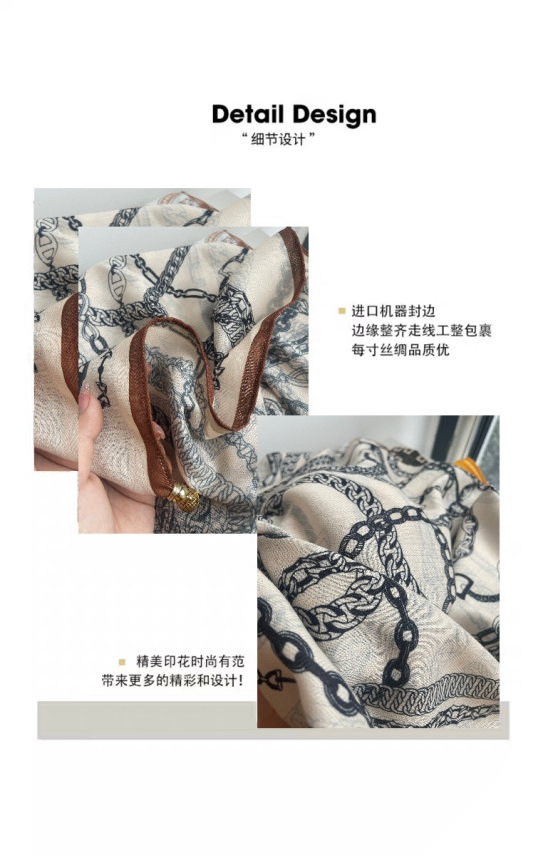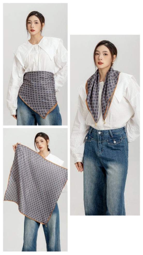 此外,围巾的质地细腻,触感非常好,佩戴时更加舒适自在。 除了款式和材质,这款围巾还有很好的装饰效果。 它可以搭配各种服装风格,无论是休闲装还是正式场合的着装, 都能让您的造型更加出彩。围巾的长度适中, 既可以绕在脖子上,也可以系在头上或腰部,展现出您的时尚品味。