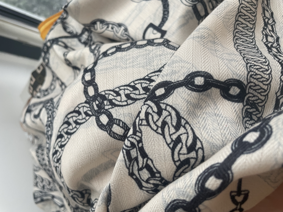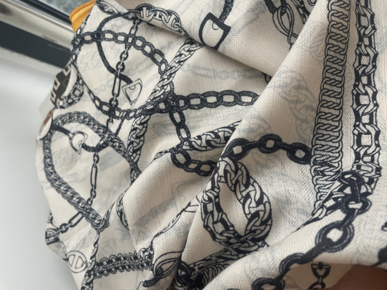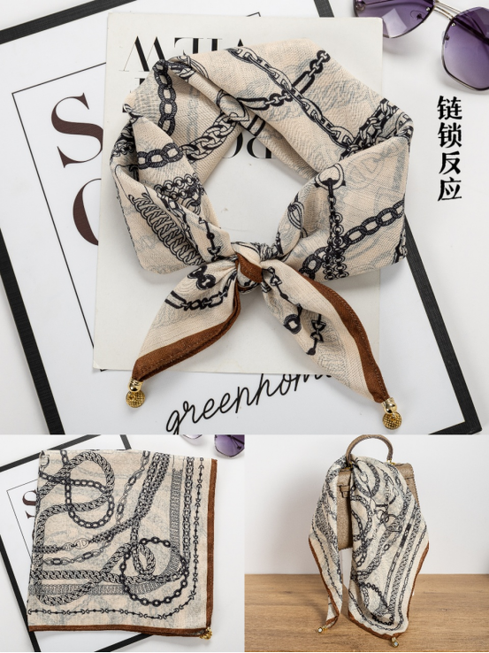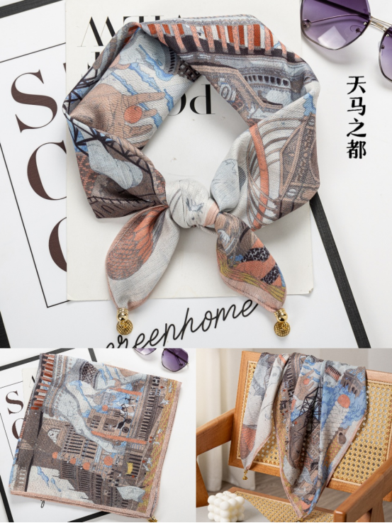 “丛林”“马”等都是大牌丝巾的元素, 抽象款式以及亮丽的配色是时尚优雅的, 它采用了柔软的丝质材料,轻盈飘逸, 非常适合春夏季节佩戴。 围巾的长度适中, 可以系在脖子上或系在腰间,展现出不同的风格。 这款围巾款式简约大方,非常适合日常穿搭。 无论是搭配衬衫、T恤还是牛仔裤, 都能轻松打造出时尚休闲的风格。