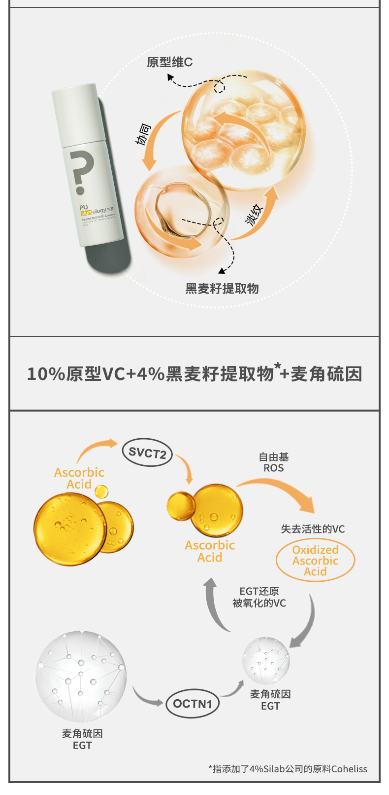 【九肽-1】+【抗坏血酸葡糖苷】+【烟酰胺】,构成了Topicrem这支精华完整的美白通路,分别从黑色素形成的前、中、后期着手,预防并淡化已有黑色素。