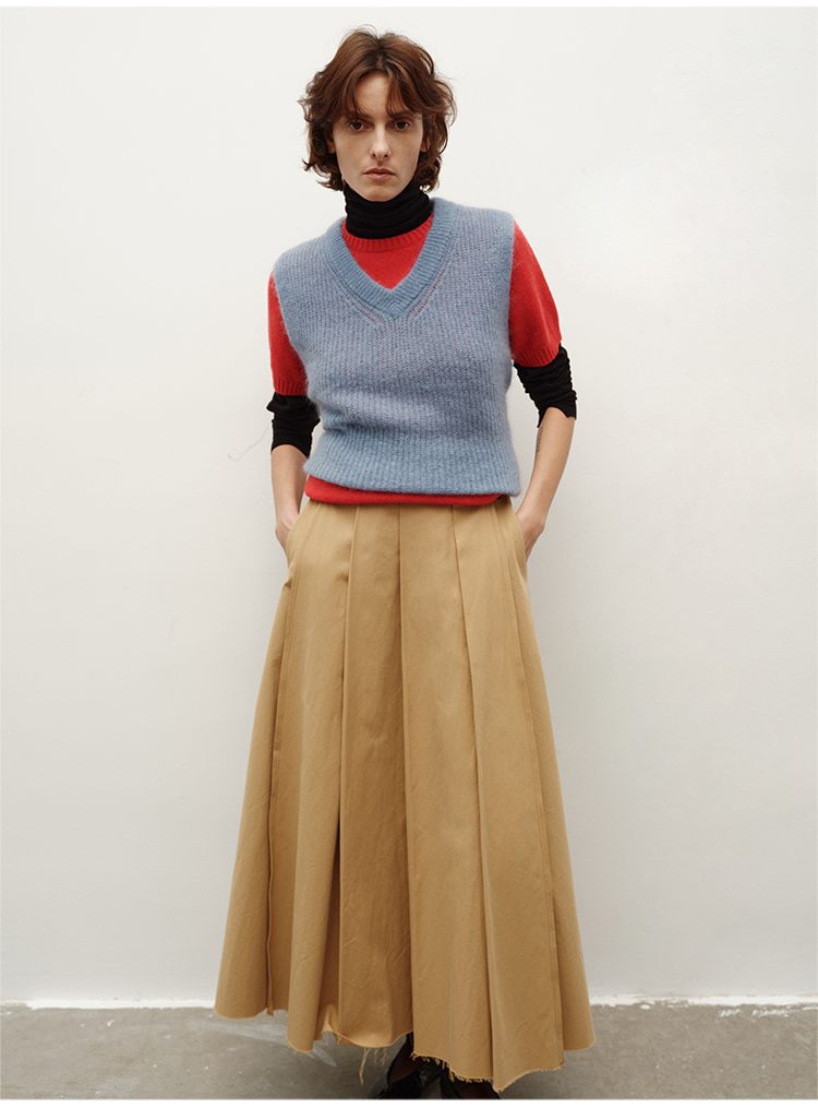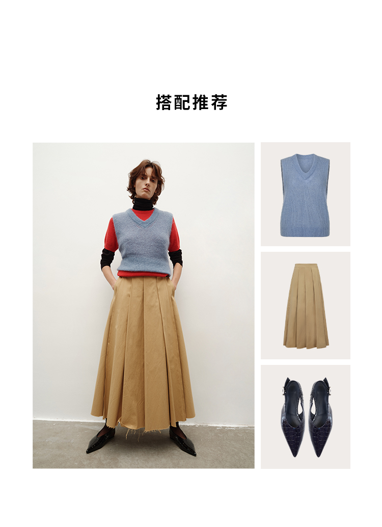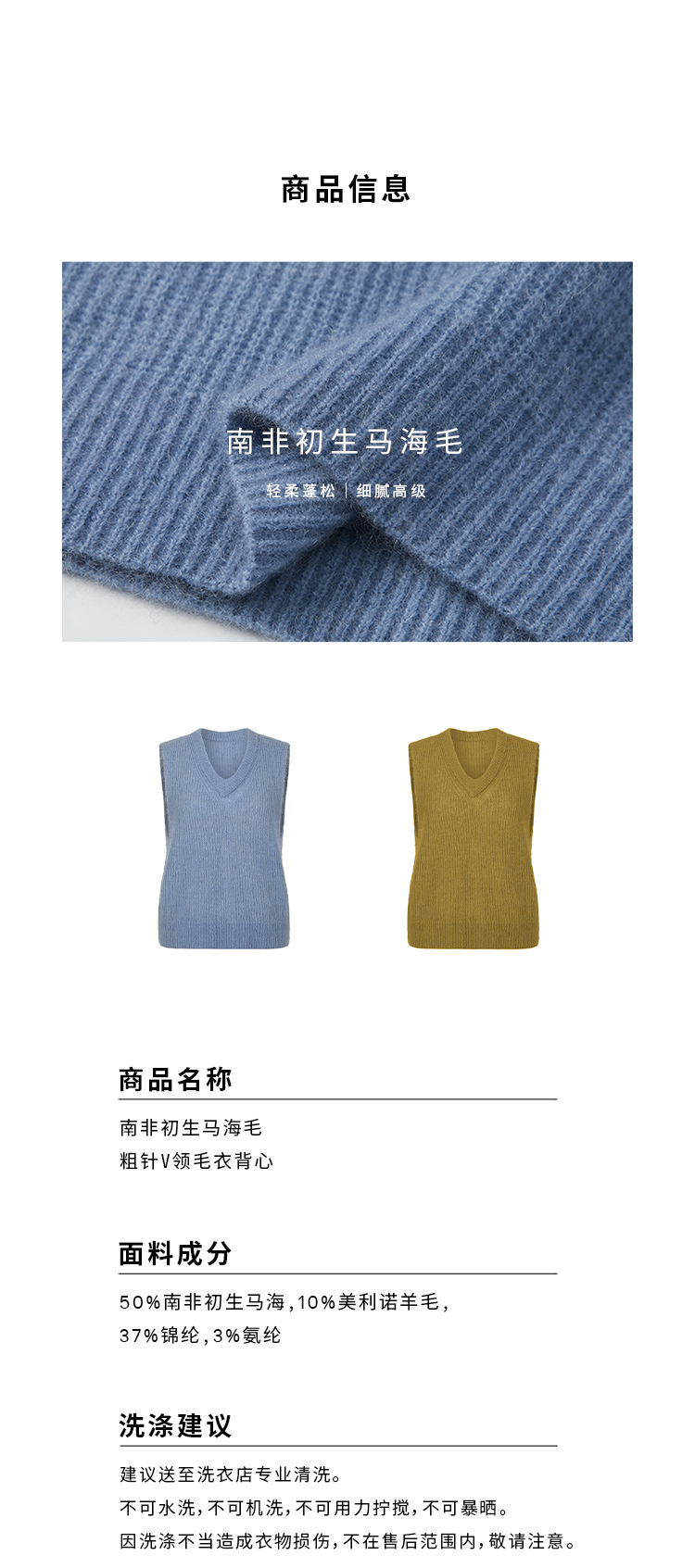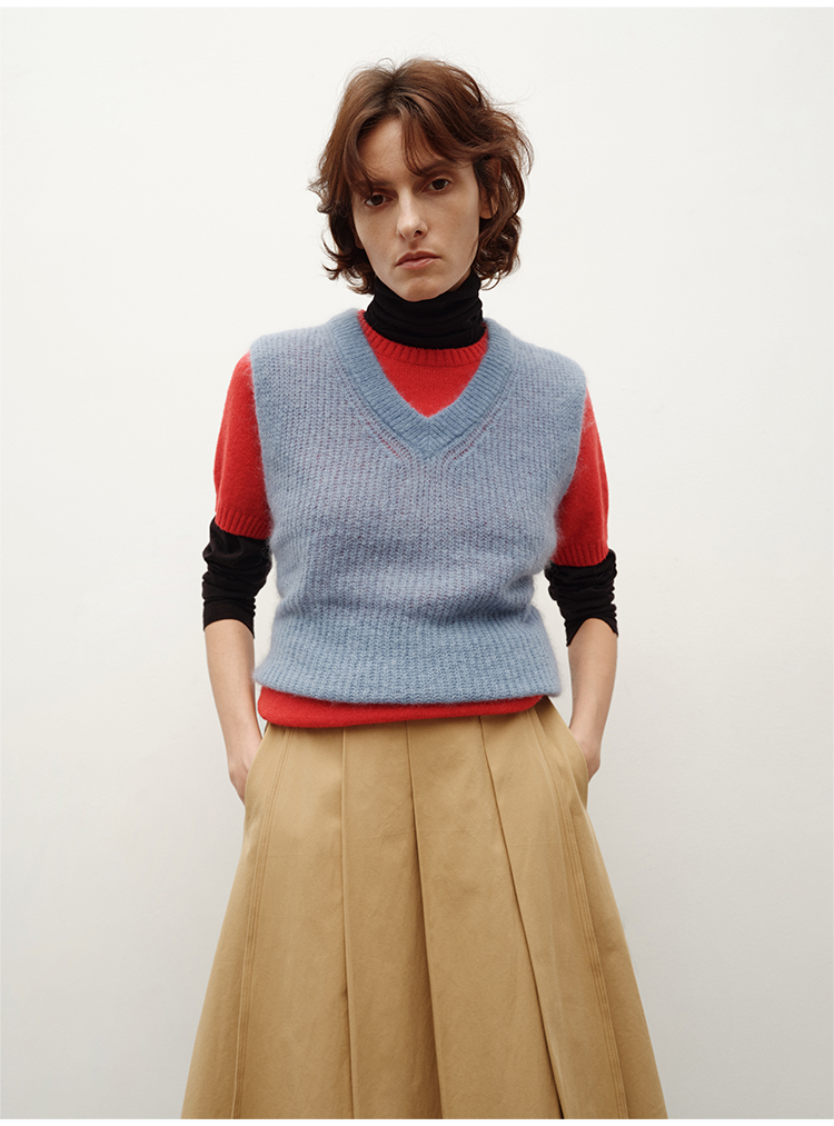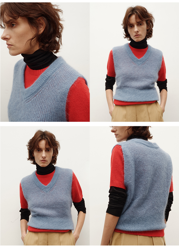 HIDEMI 南非初生马海毛粗针V领毛衣背心 橄榄绿/天空蓝