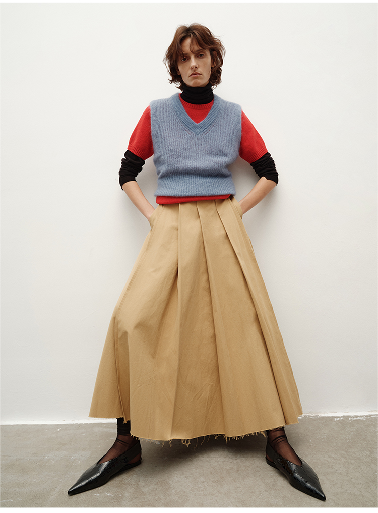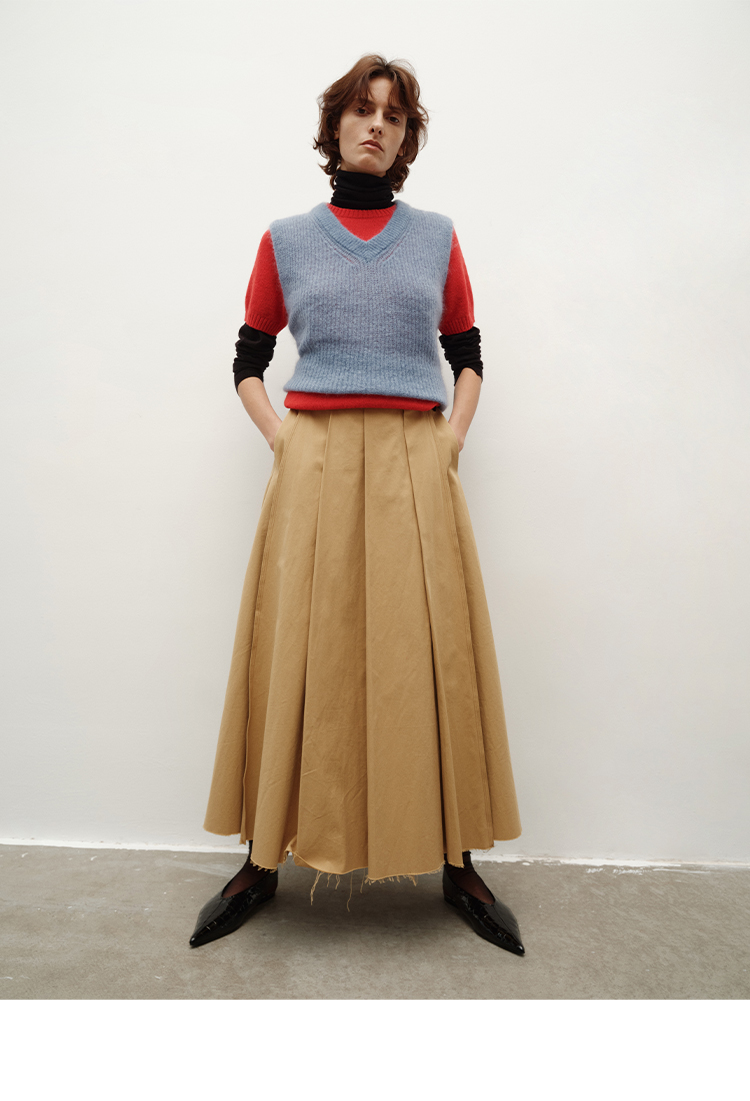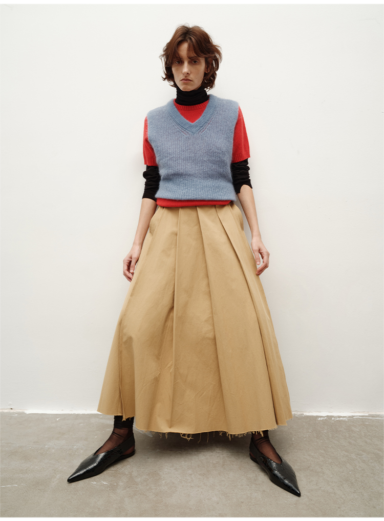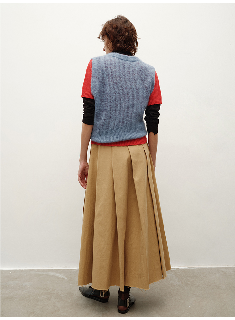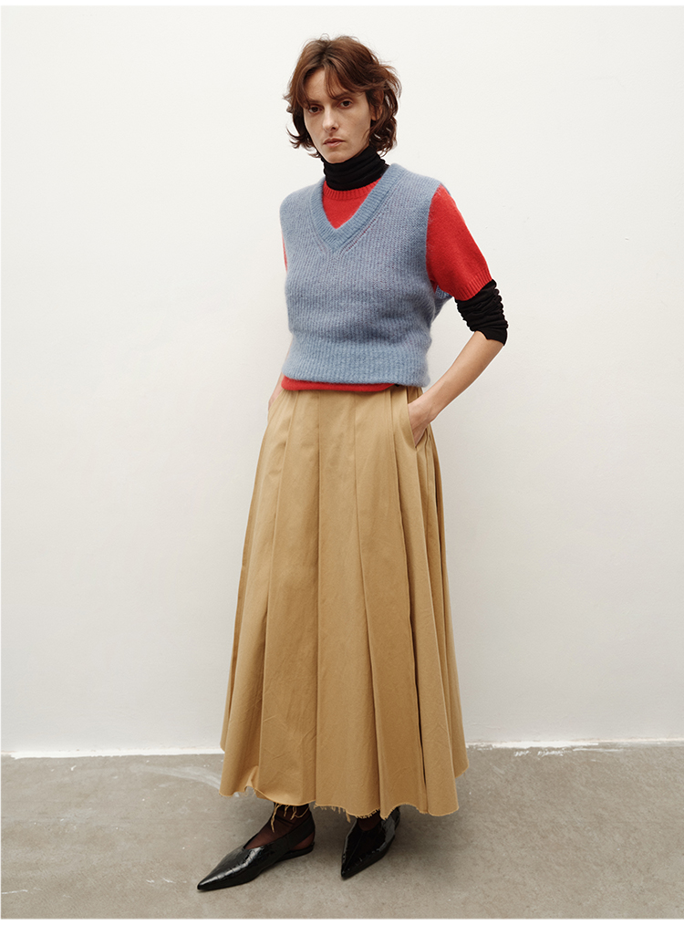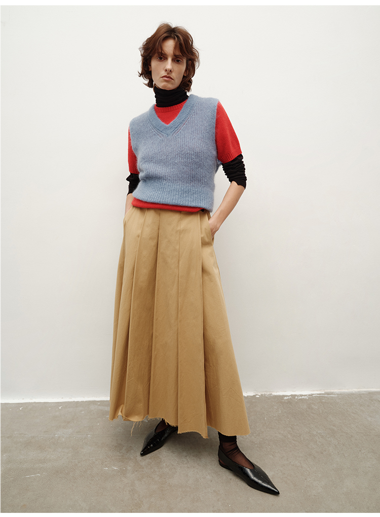 HIDEMI 南非初生马海毛粗针V领毛衣背心 橄榄绿/天空蓝