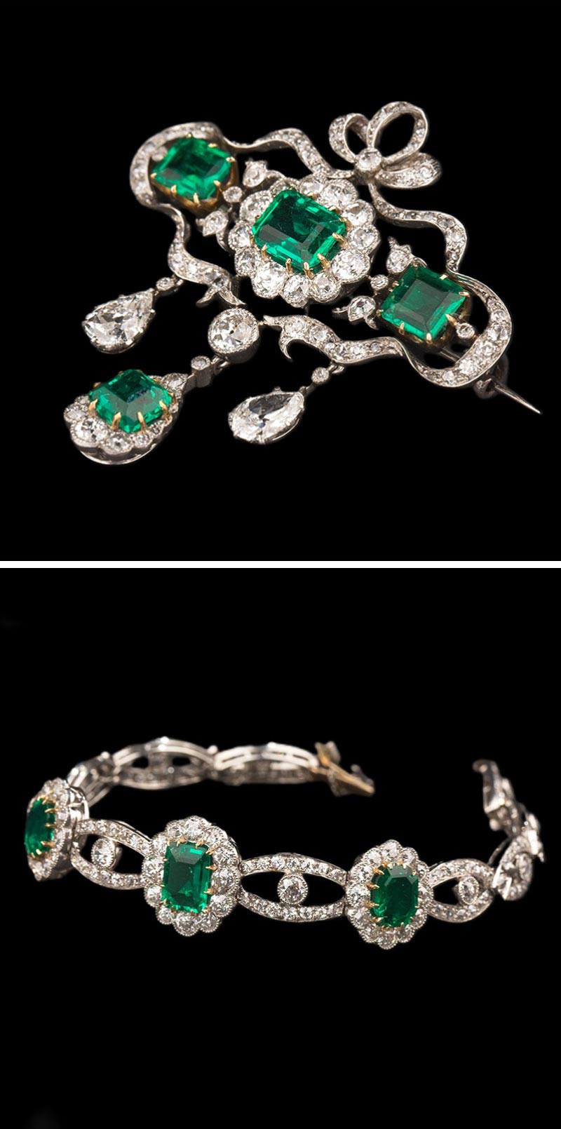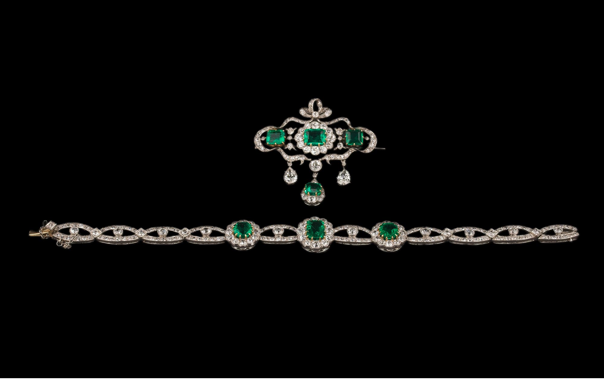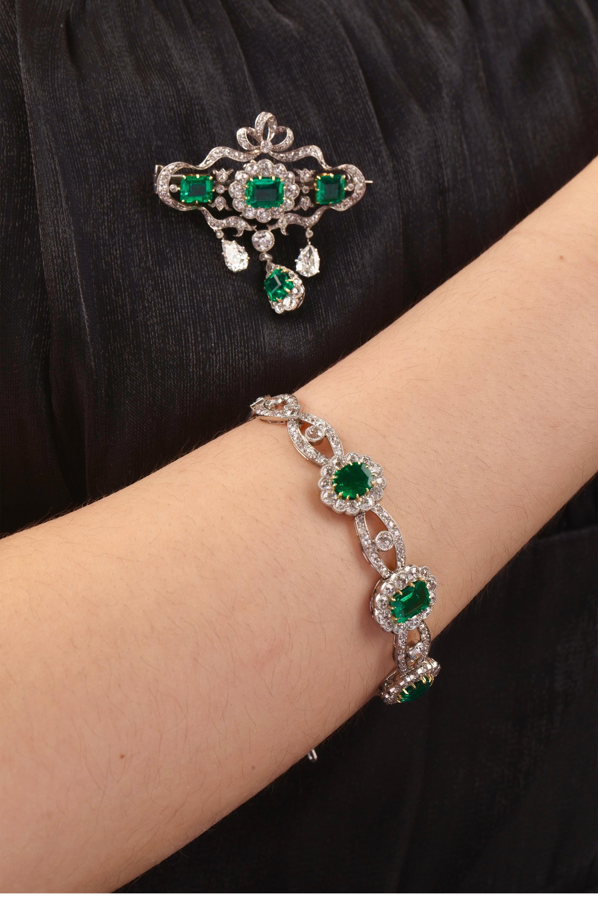 20世纪初欧洲出品缎带花蔓造型铂金及黄金镶嵌钻石哥伦比亚祖母绿手链及胸针套件