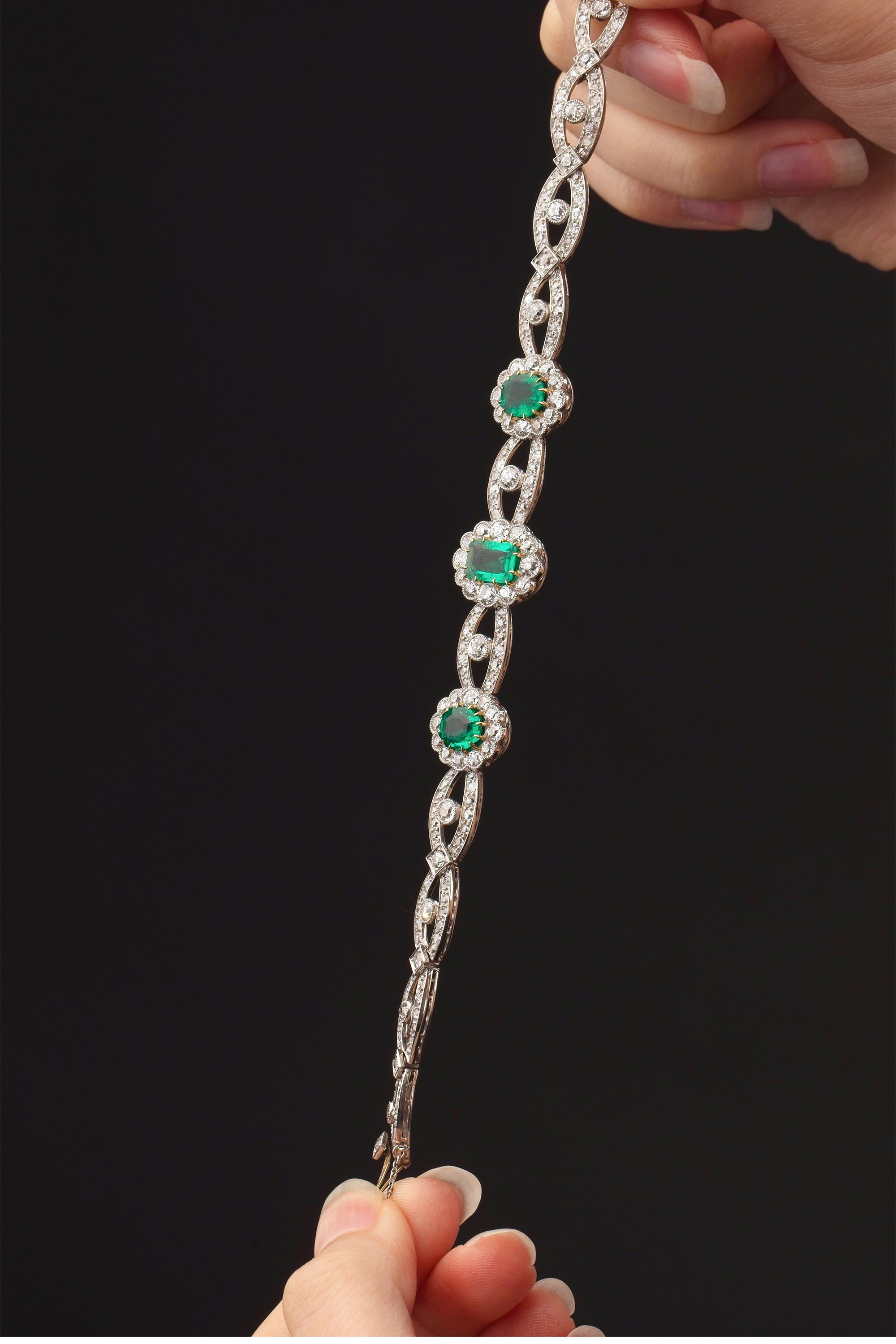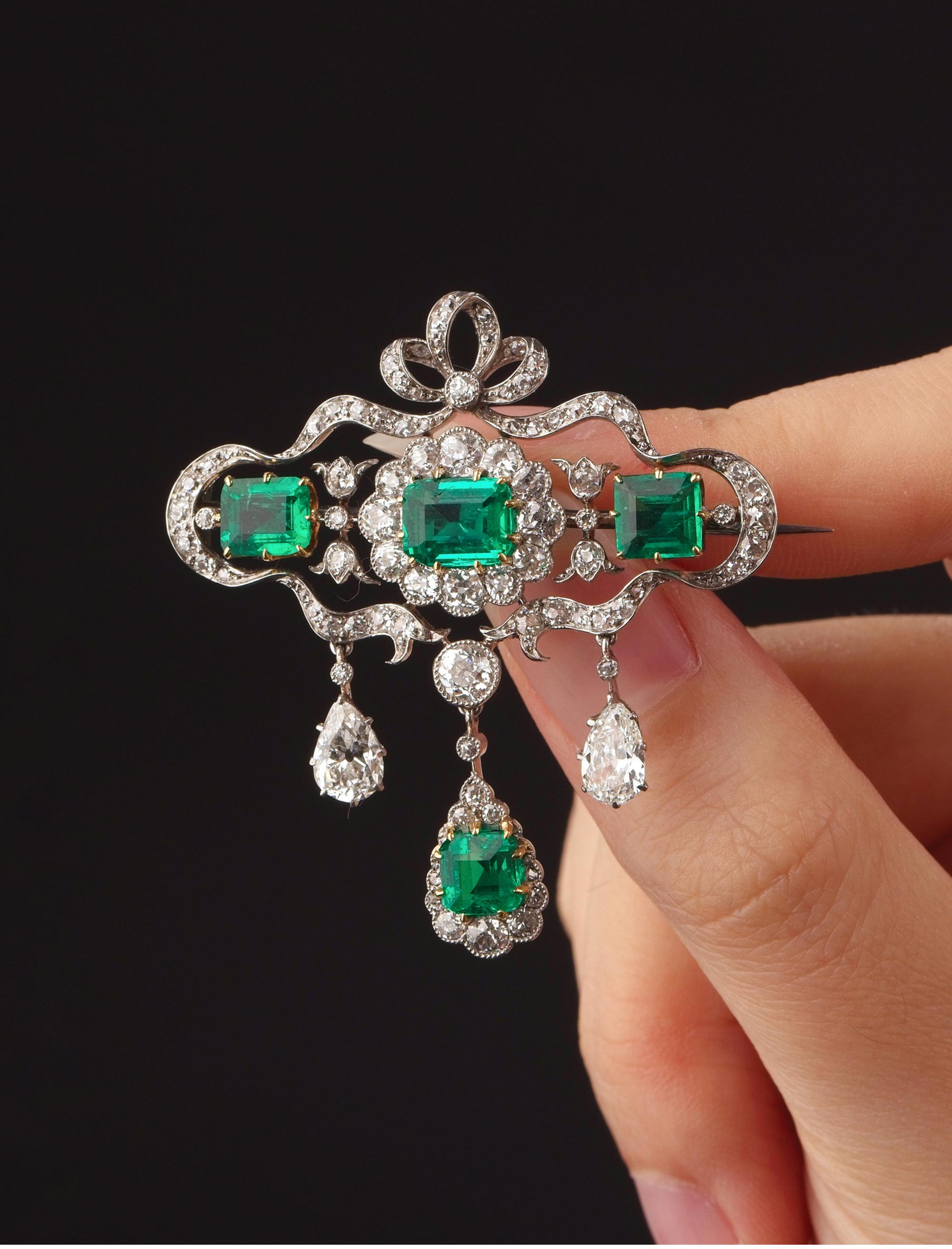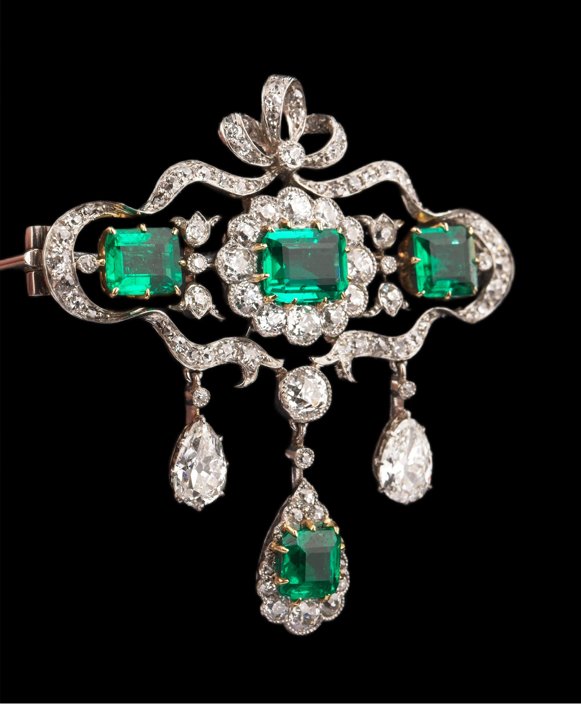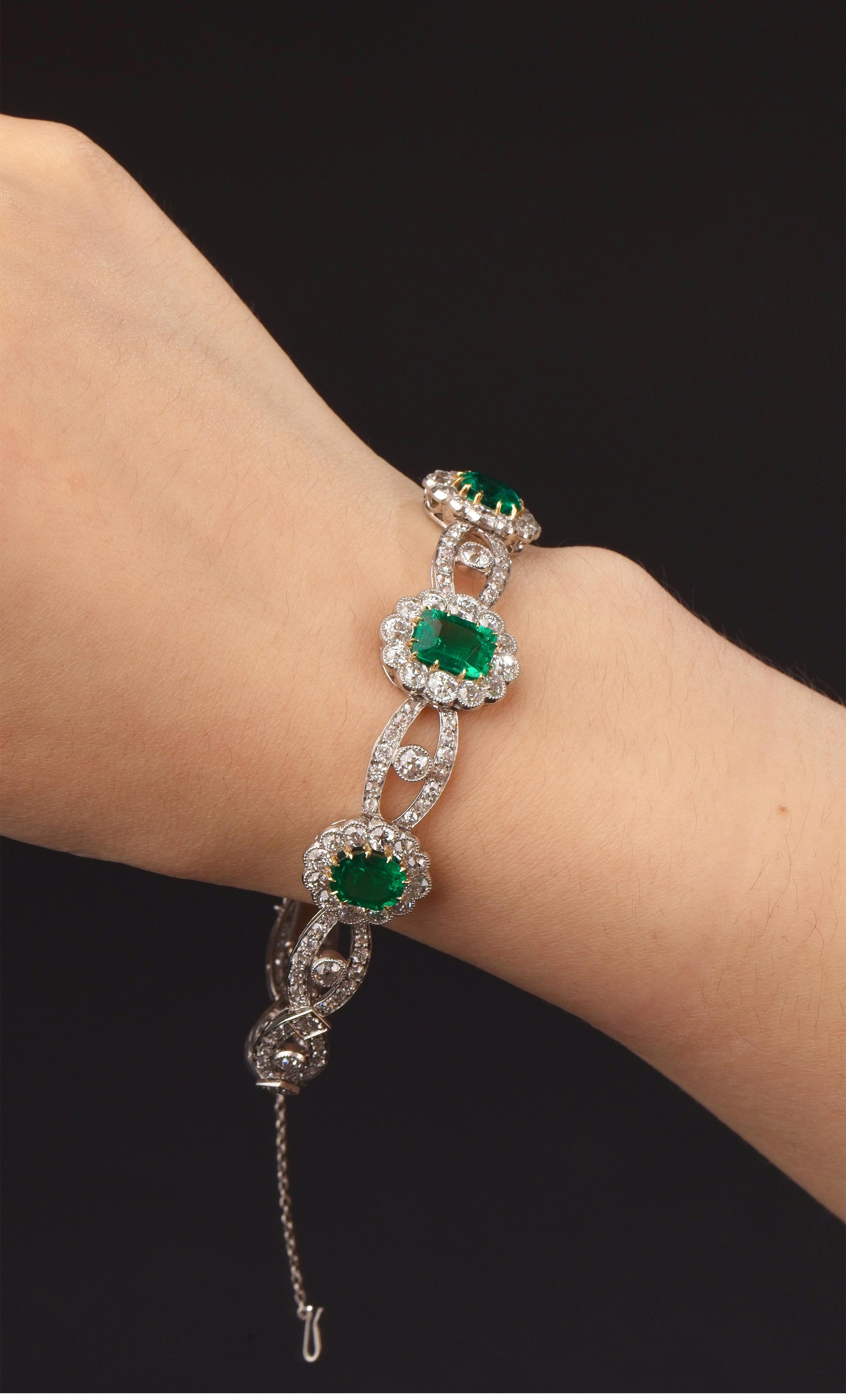 20世纪初欧洲出品缎带花蔓造型铂金及黄金镶嵌钻石哥伦比亚祖母绿手链及胸针套件