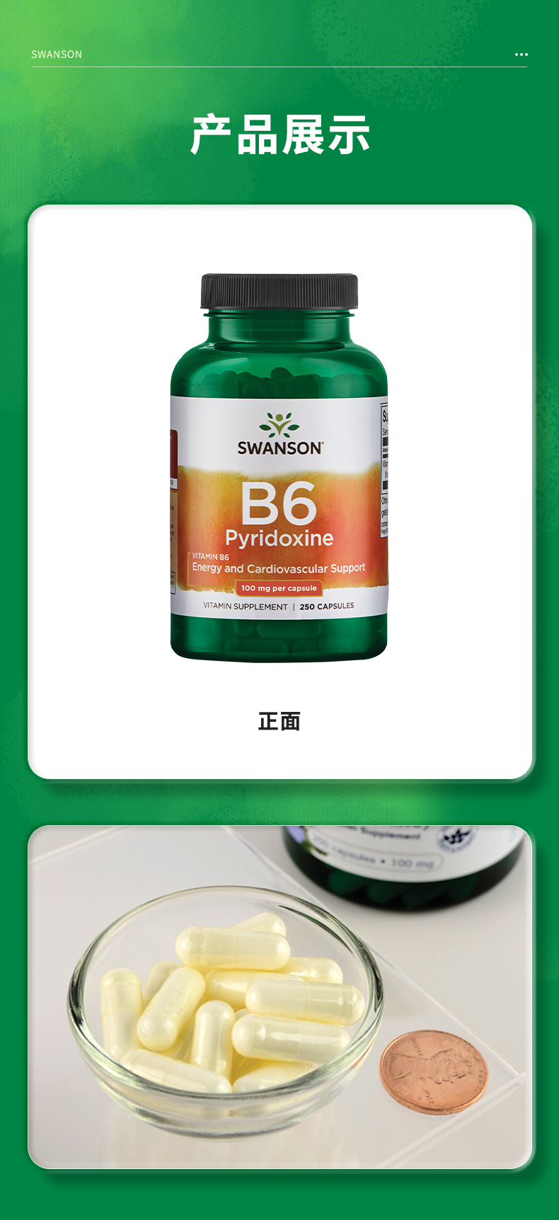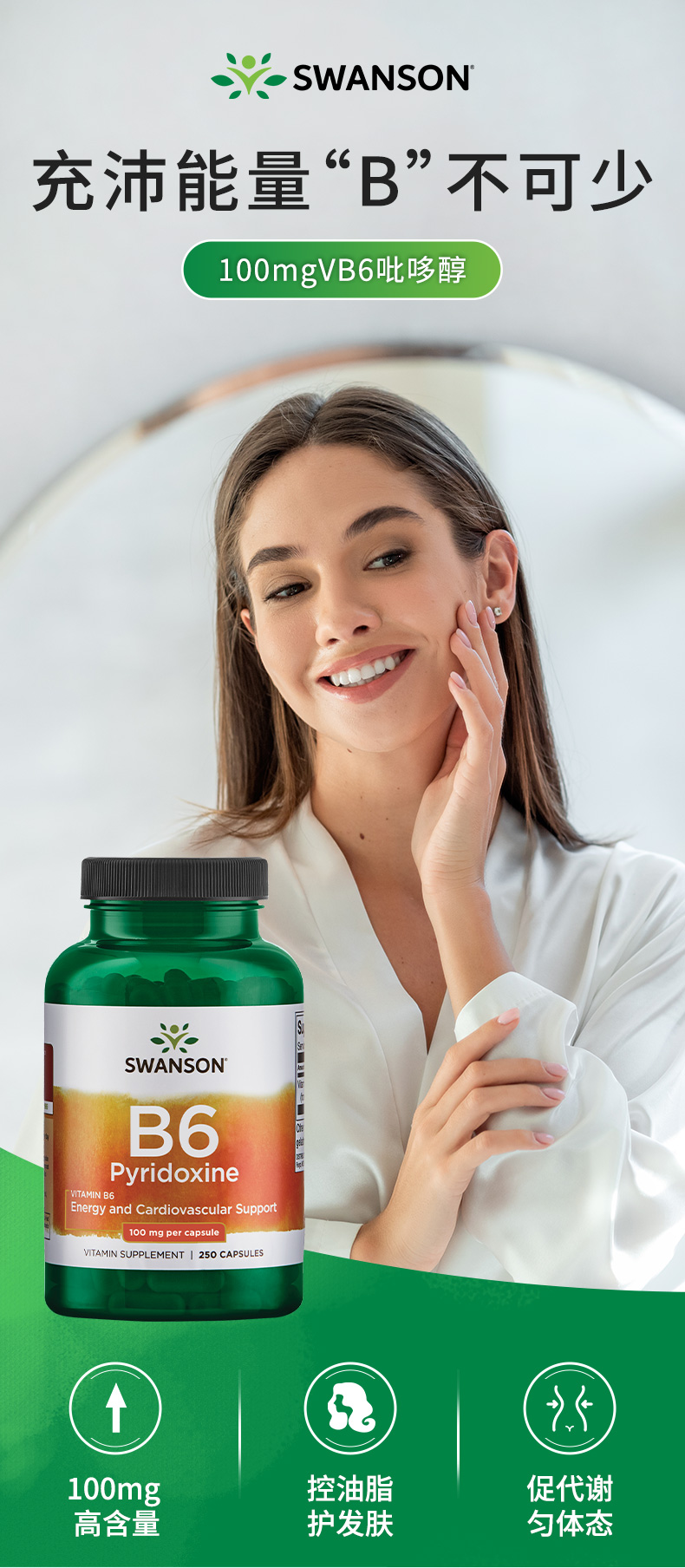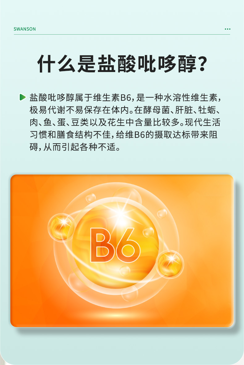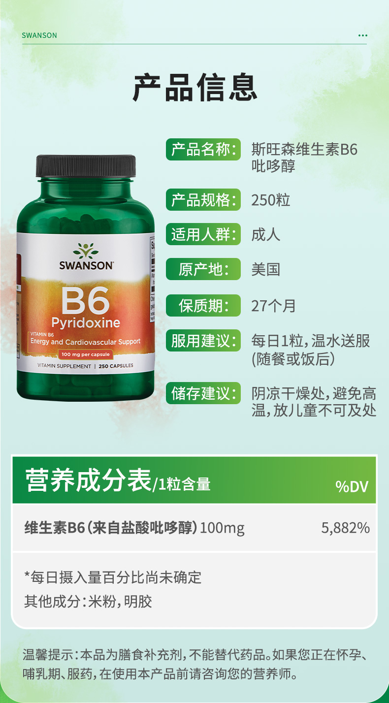 【海免】美国进口swanson斯旺森维生素B6胶囊脱发掉发白头发维生素B250粒