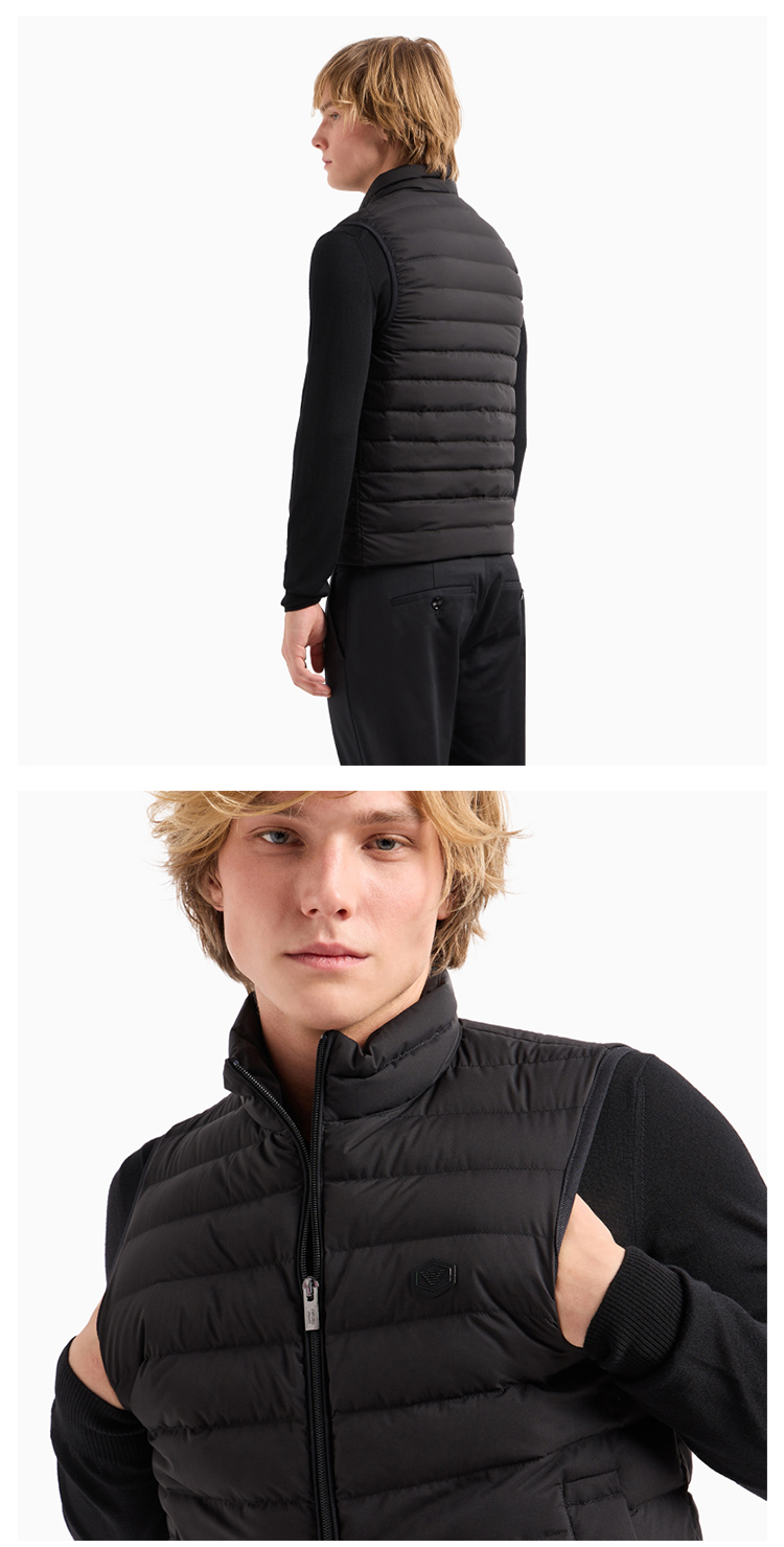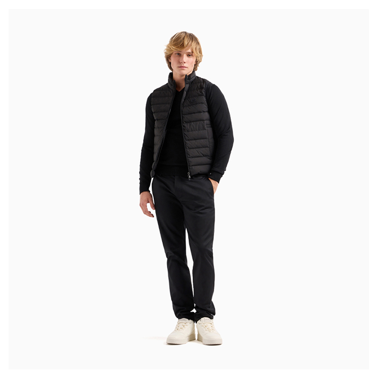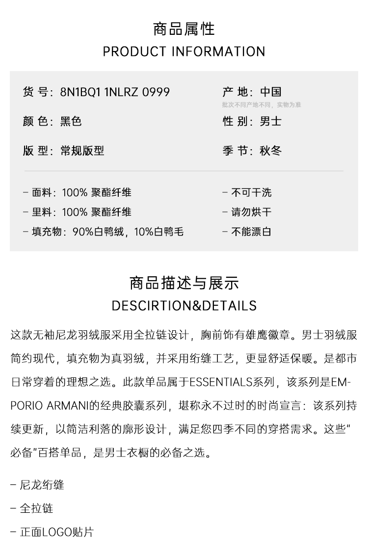 【一】EMPORIO ARMANI 阿玛尼 男士鹰形徽标贴片绗缝尼龙无袖全拉链羽绒服 黑色 8N1BQ1 1NLRZ 0999