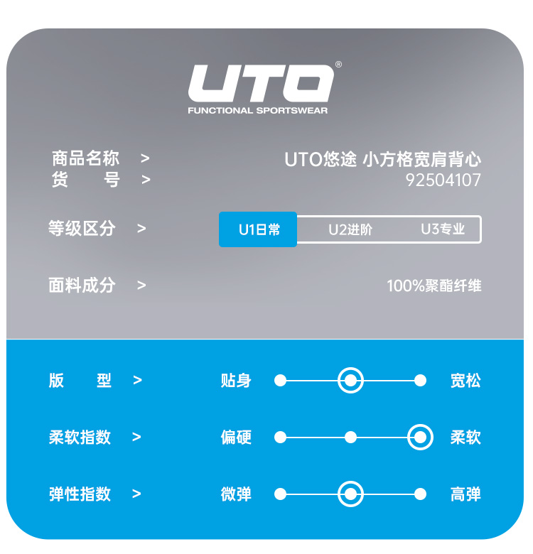 UTO悠途潜心于贴身运动装备的研发、设计和生产。从纤维到组织,从设计到工艺,在无缝贴身运动装备领域,树立国内标杆。 UTO着力于品牌互联网化,不断采集大量运动数据,为跑步、健身、滑雪等不同类型的运动爱