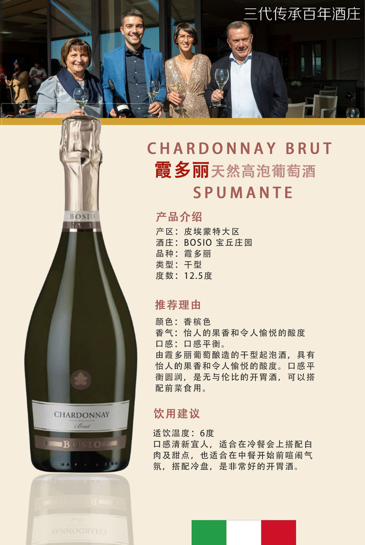 推荐理由:用皮埃蒙特大区的霞多丽葡萄酿造,天然发酵带来的优雅而丰富的气泡,仿佛庆典上飘动的彩带,让饮用的人激情澎湃。小型庆功宴、客户答谢宴、乔迁之喜、升学宴... 但凡需要仪式感的场合,这款高泡起泡酒是你的不二之选。口感清新宜人,适合在冷餐会上搭配白肉及甜点,也适合在中餐开始前喧闹气氛,搭配冷盘,是非常好的开胃酒。