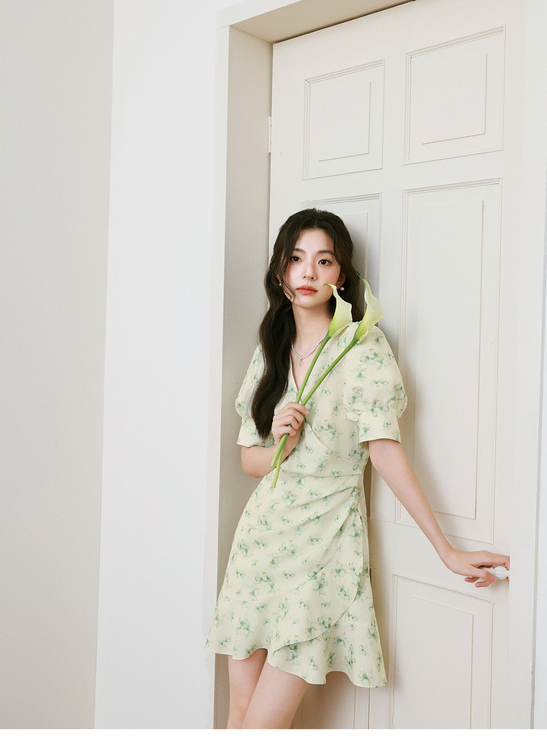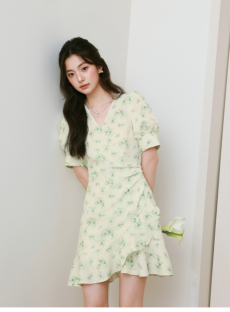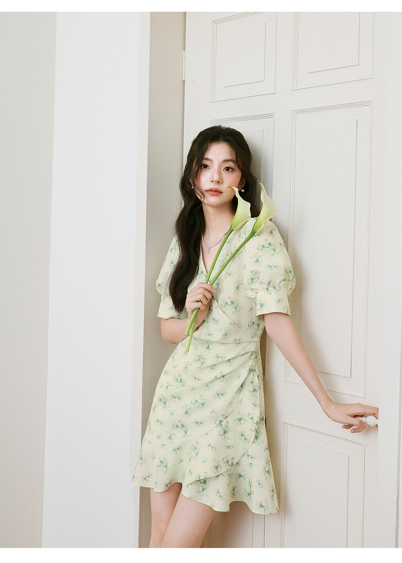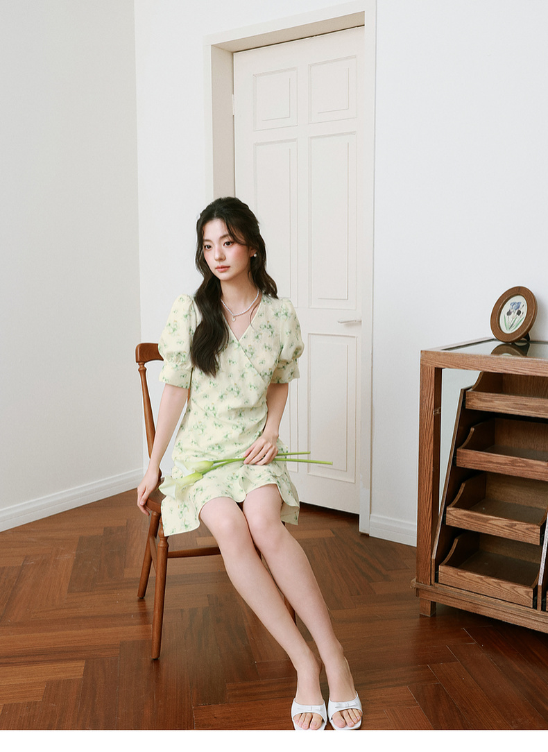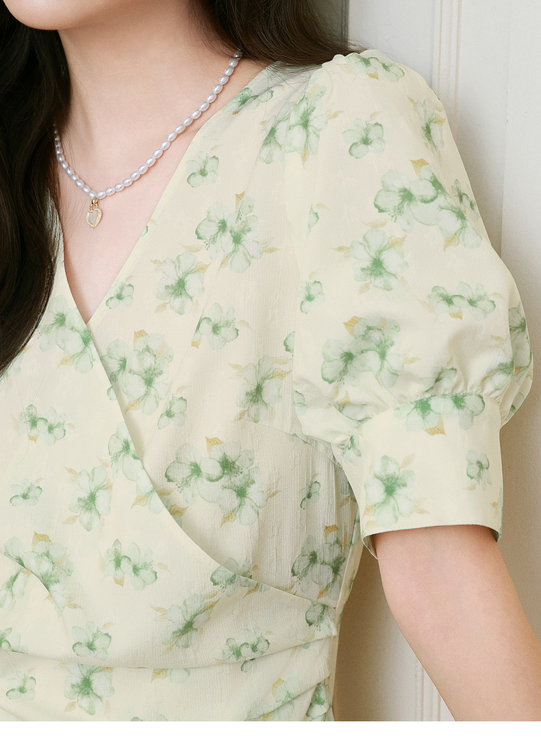 【严选】诗凡黎碎花连衣裙2025春季显瘦甜美暗纹提花泡泡袖围裹式茶歇裙7G3190221