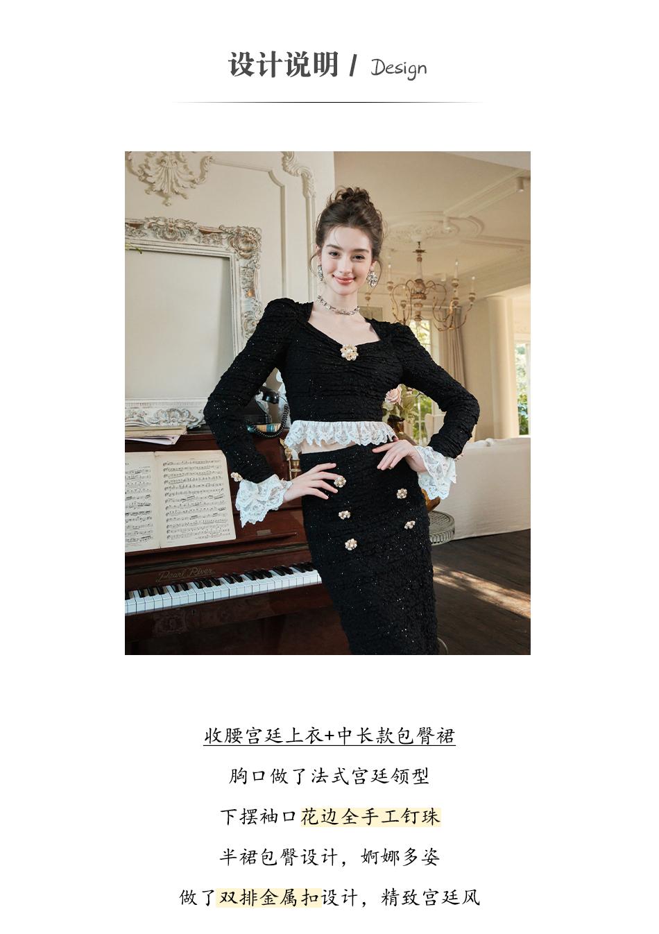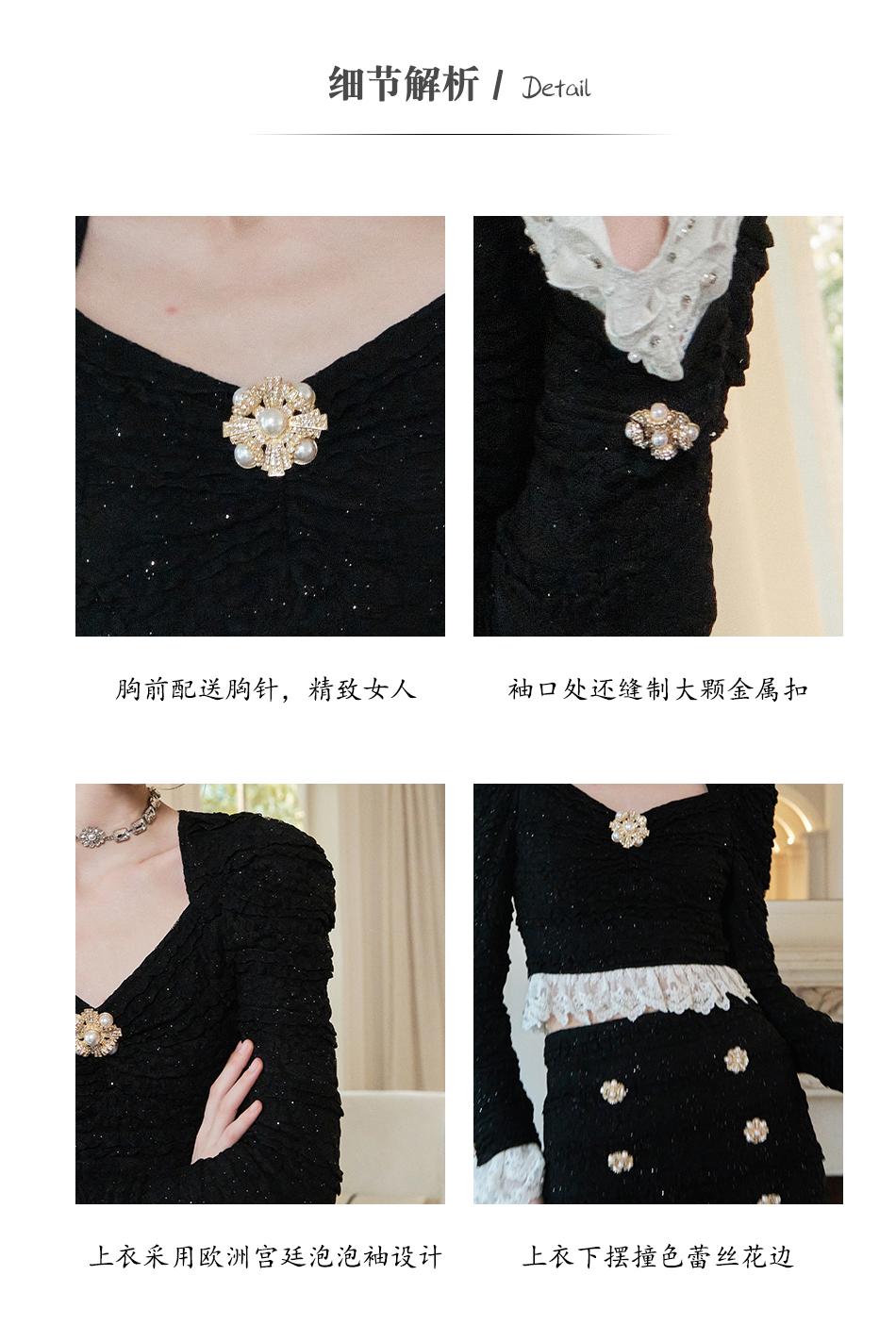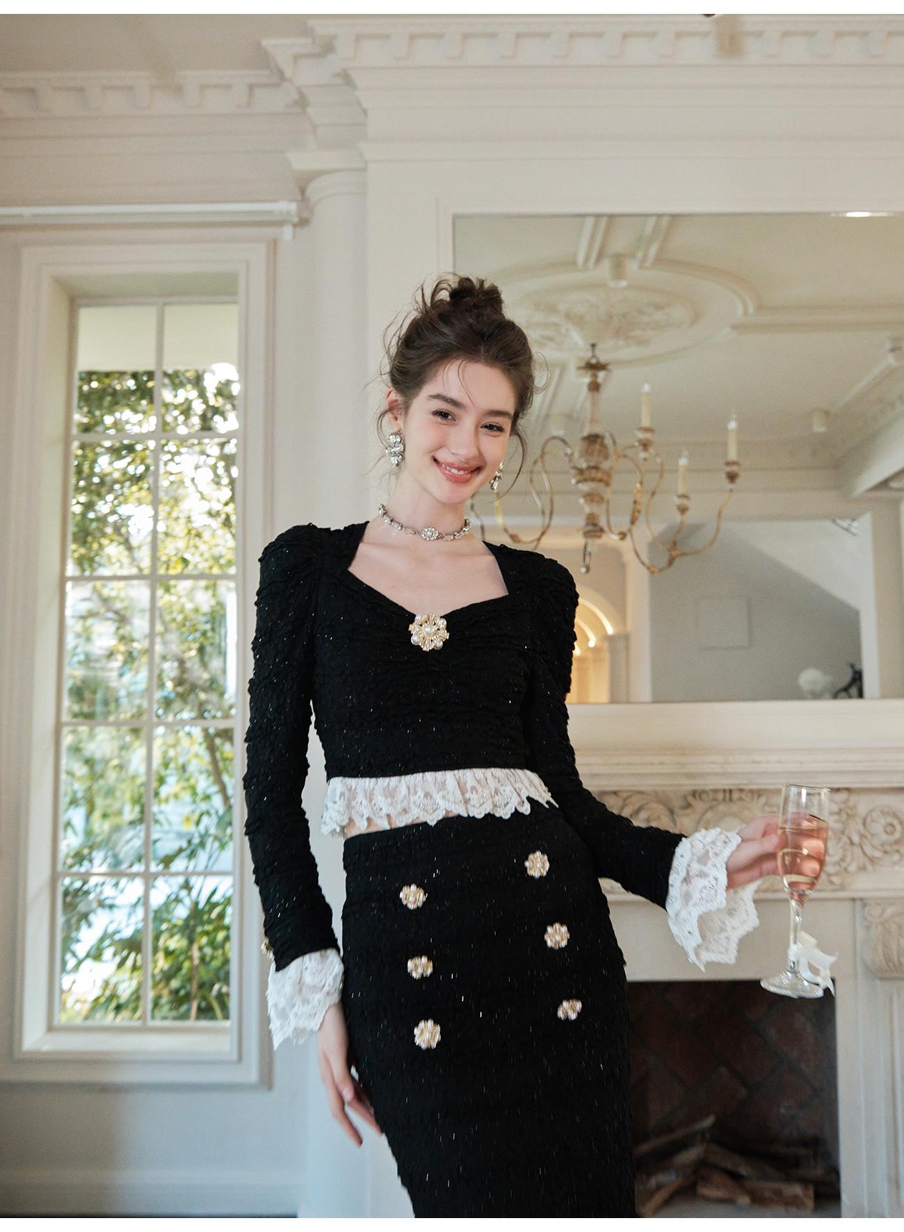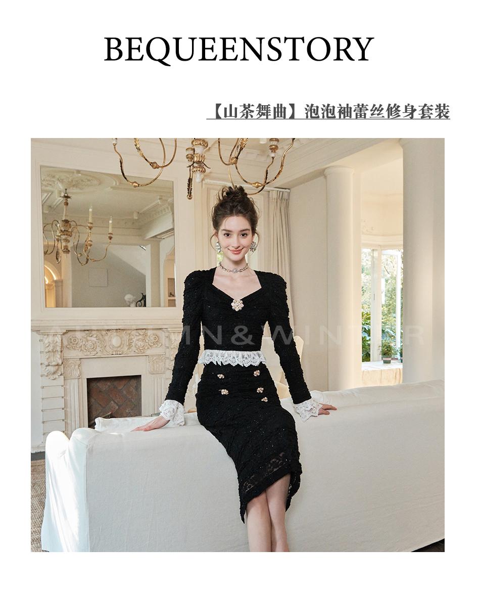 BeQueenStory【山茶舞曲】时髦宫廷风泡泡袖蕾丝秋冬修身显瘦套装裙