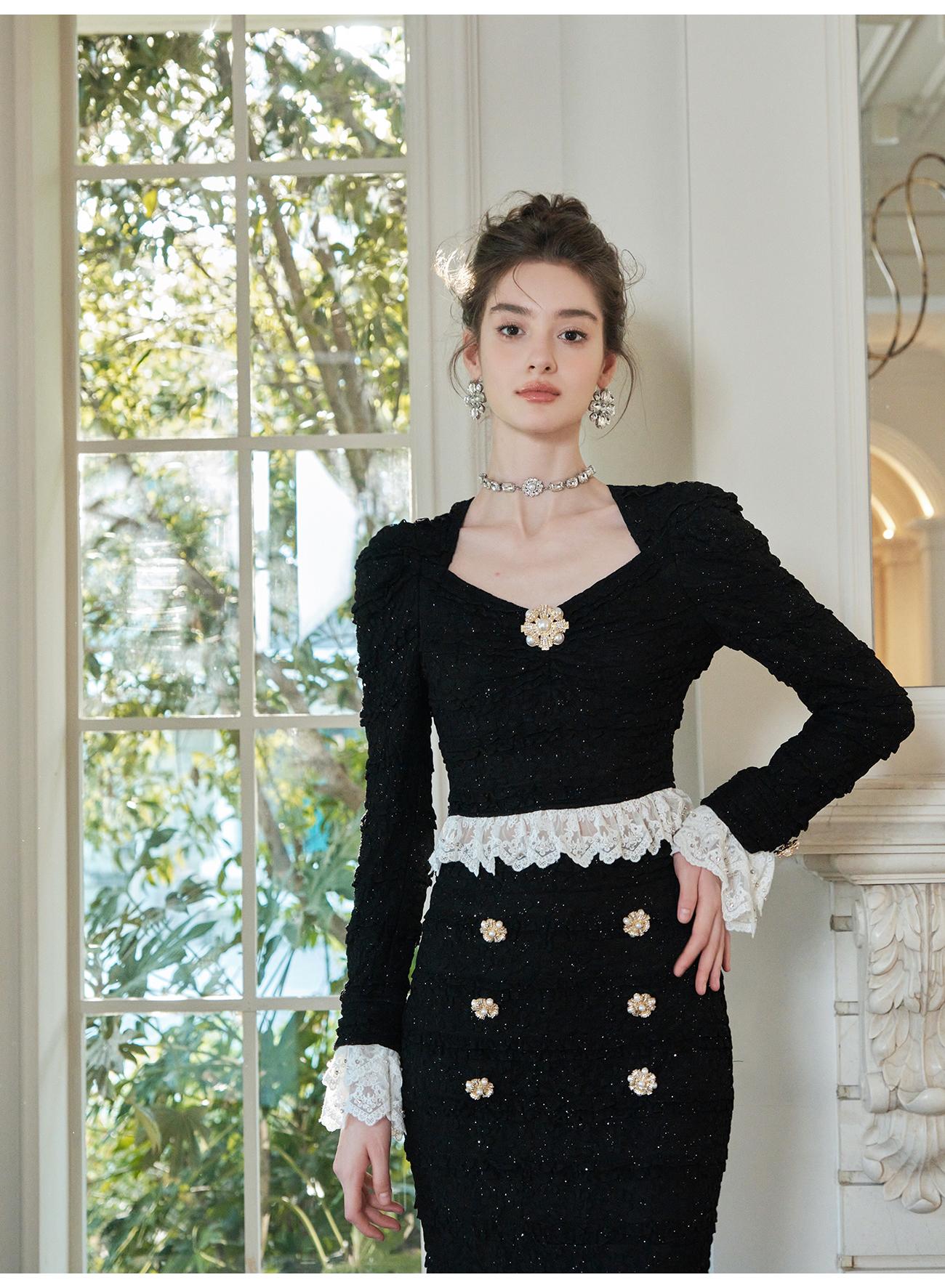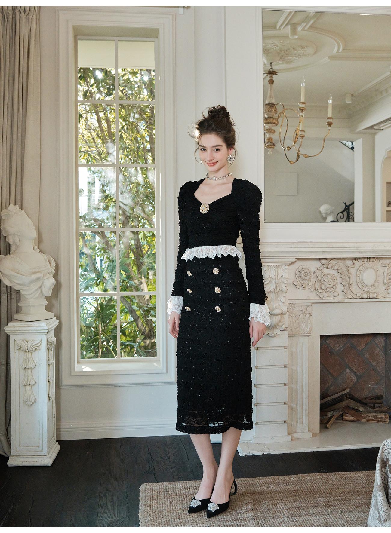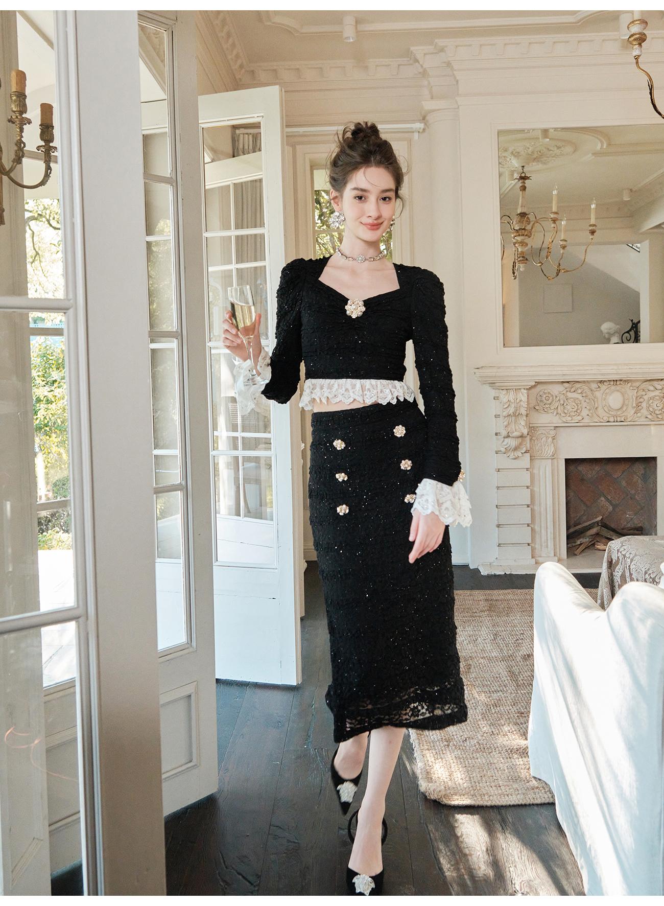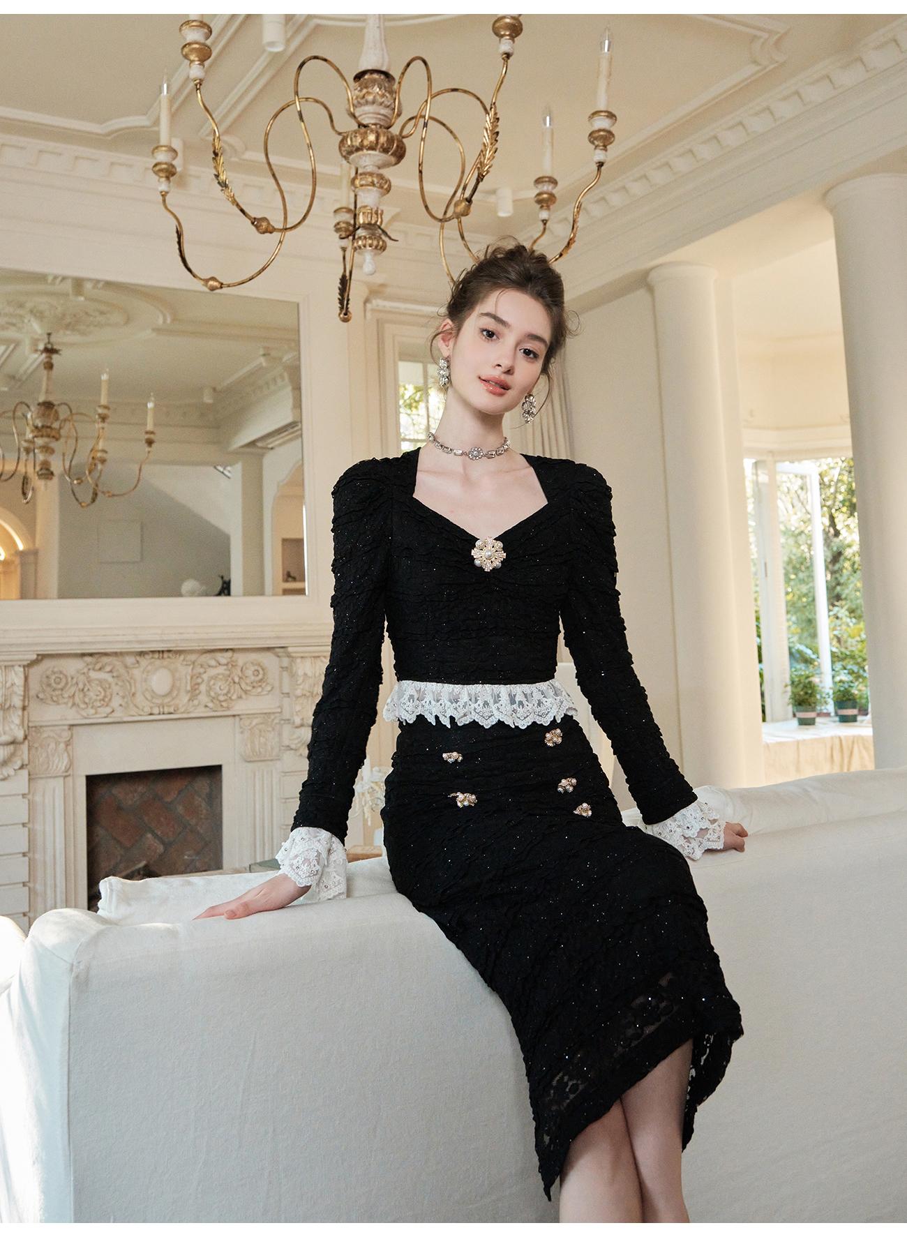 BeQueenStory【山茶舞曲】时髦宫廷风泡泡袖蕾丝秋冬修身显瘦套装裙