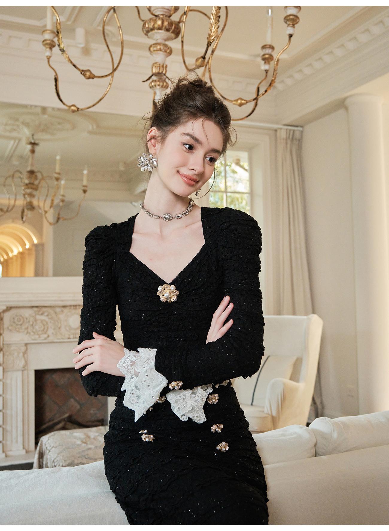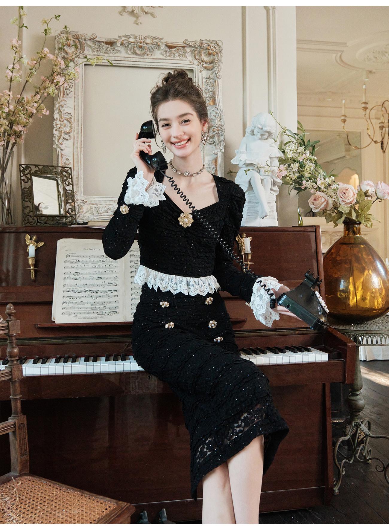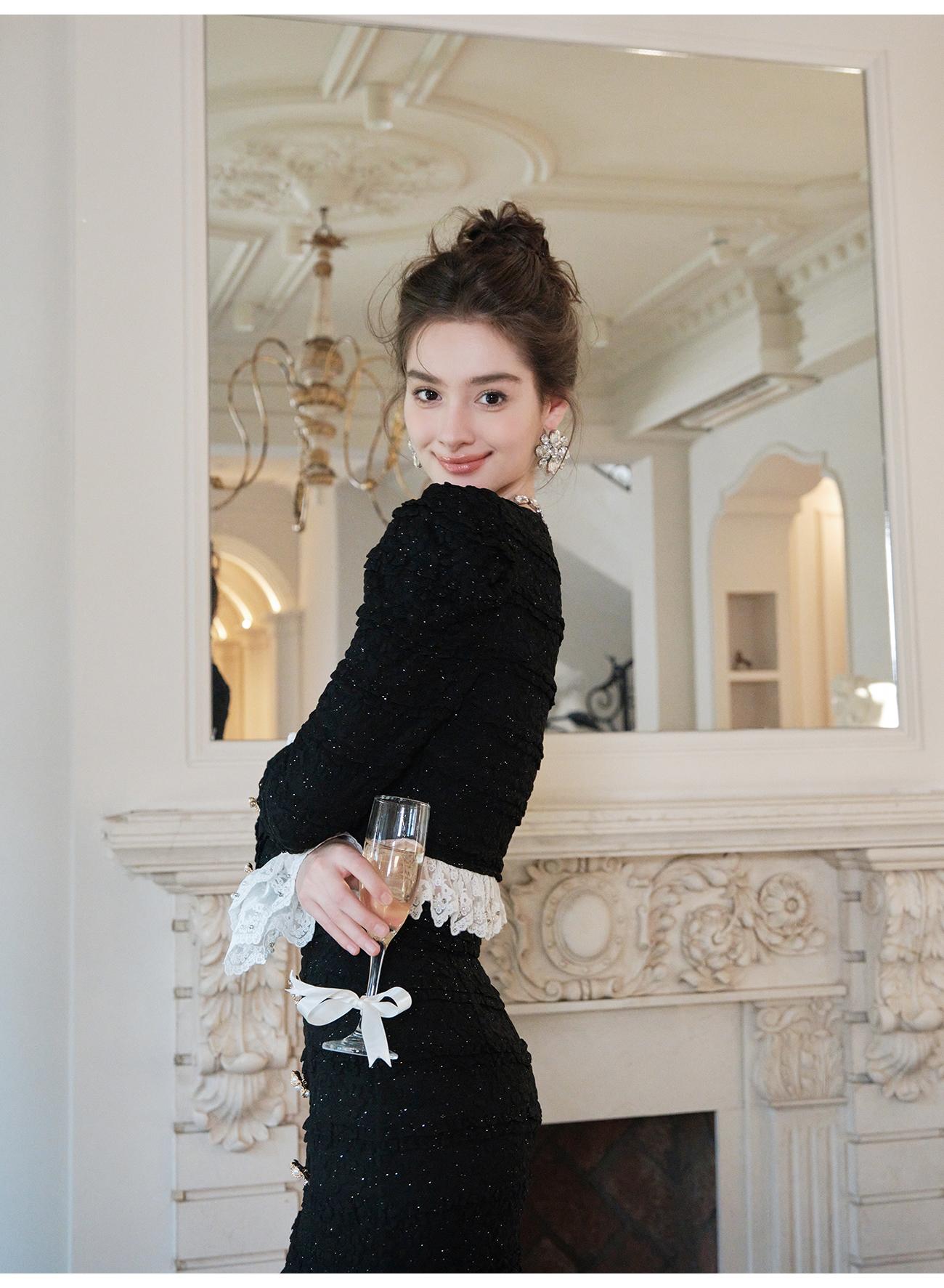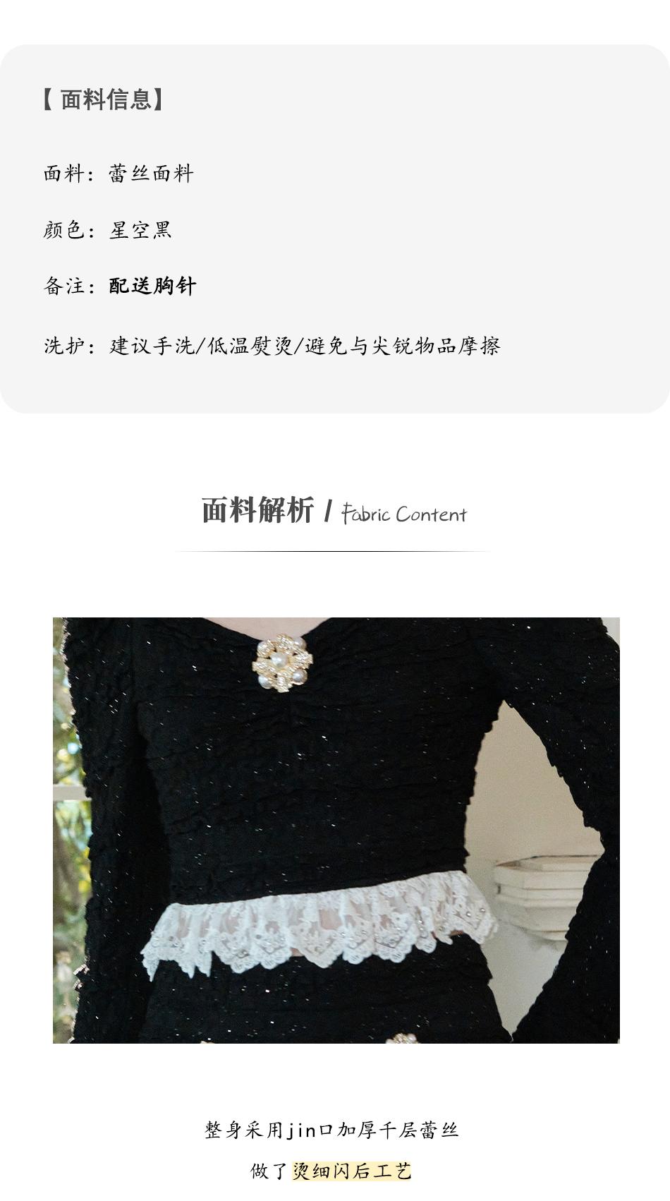 BeQueenStory【山茶舞曲】时髦宫廷风泡泡袖蕾丝秋冬修身显瘦套装裙