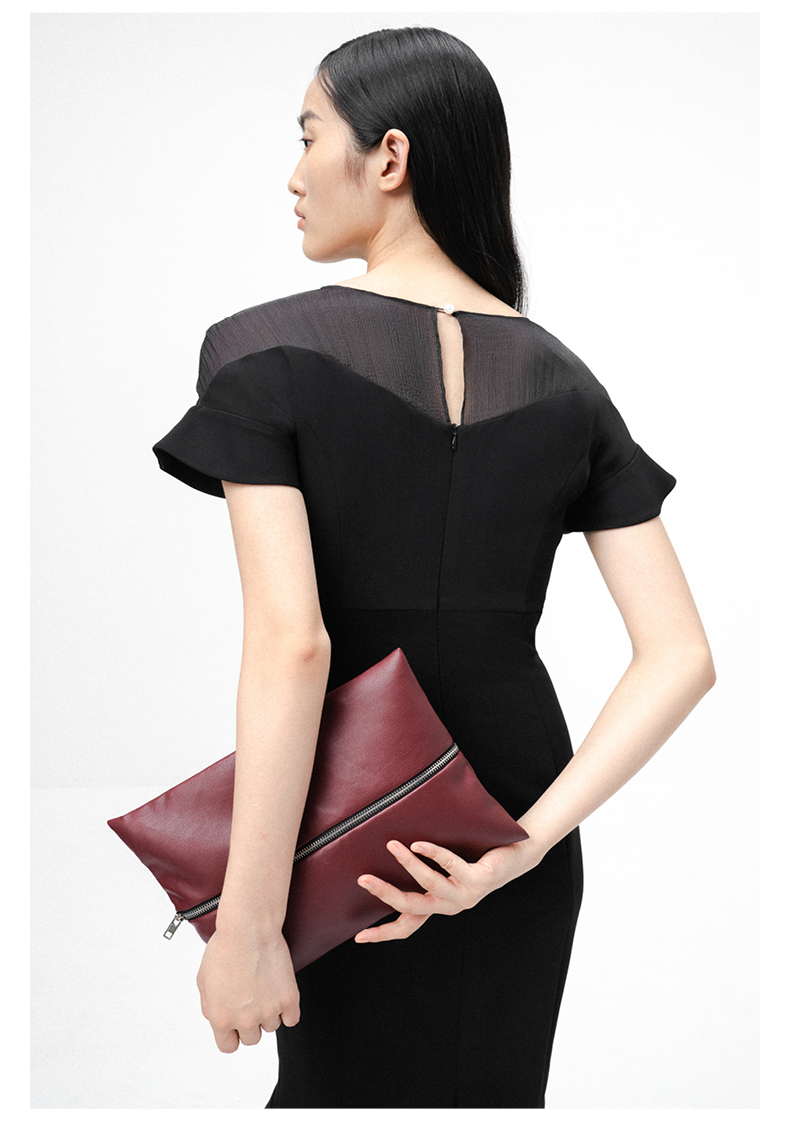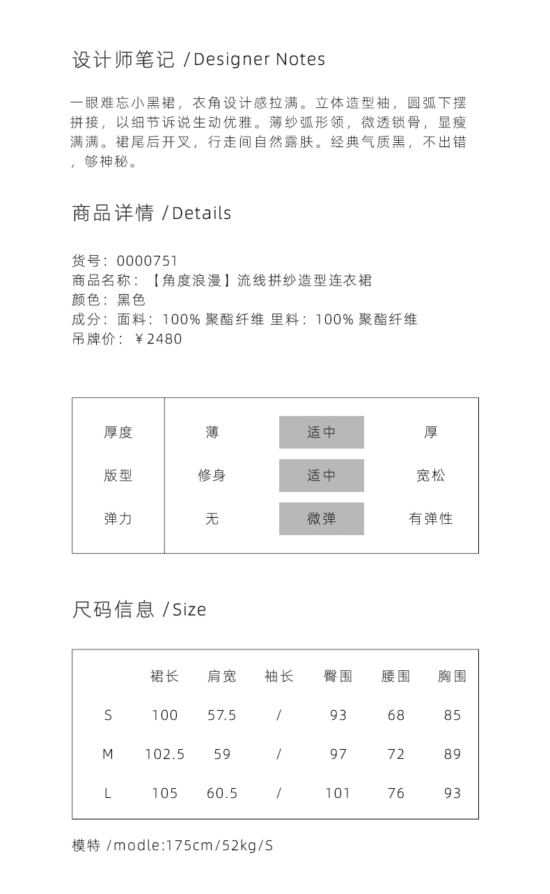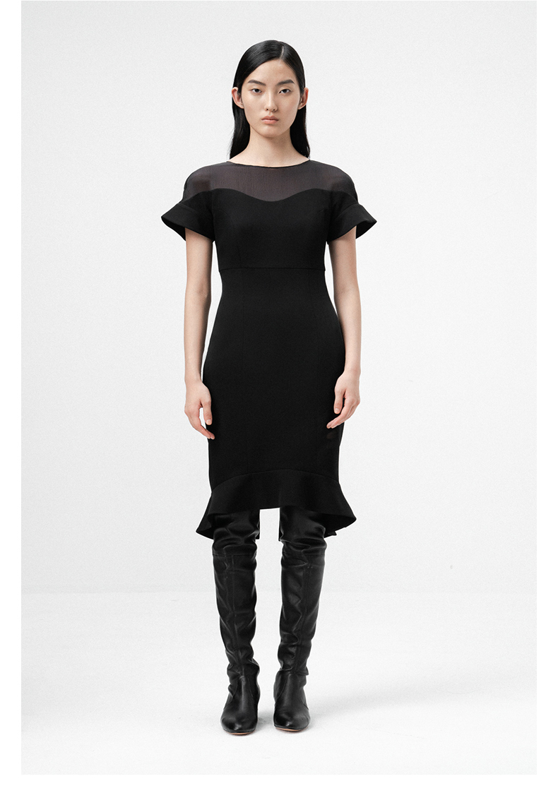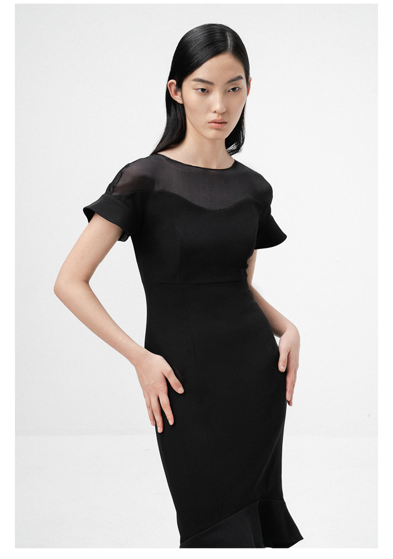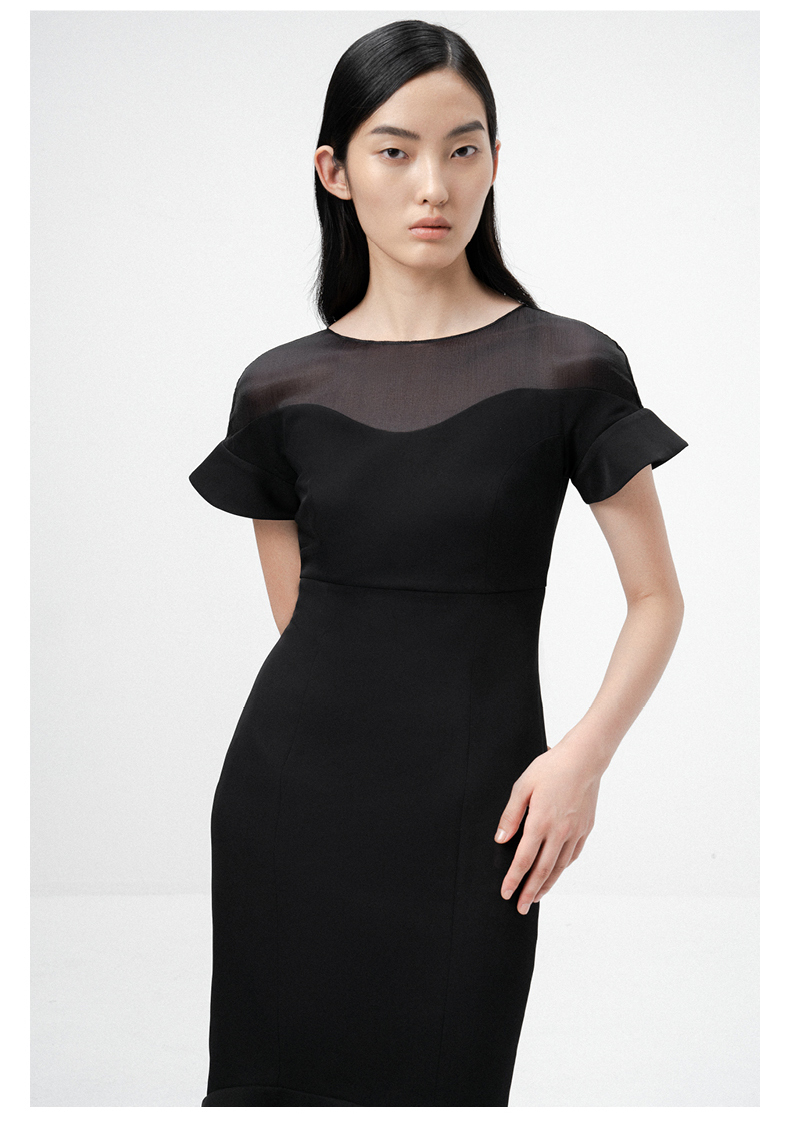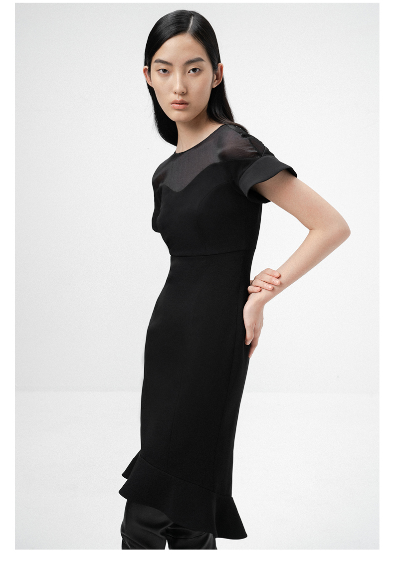 【角度浪漫】黑色流线拼纱造型袖角度圆弧下摆连衣裙/0000751