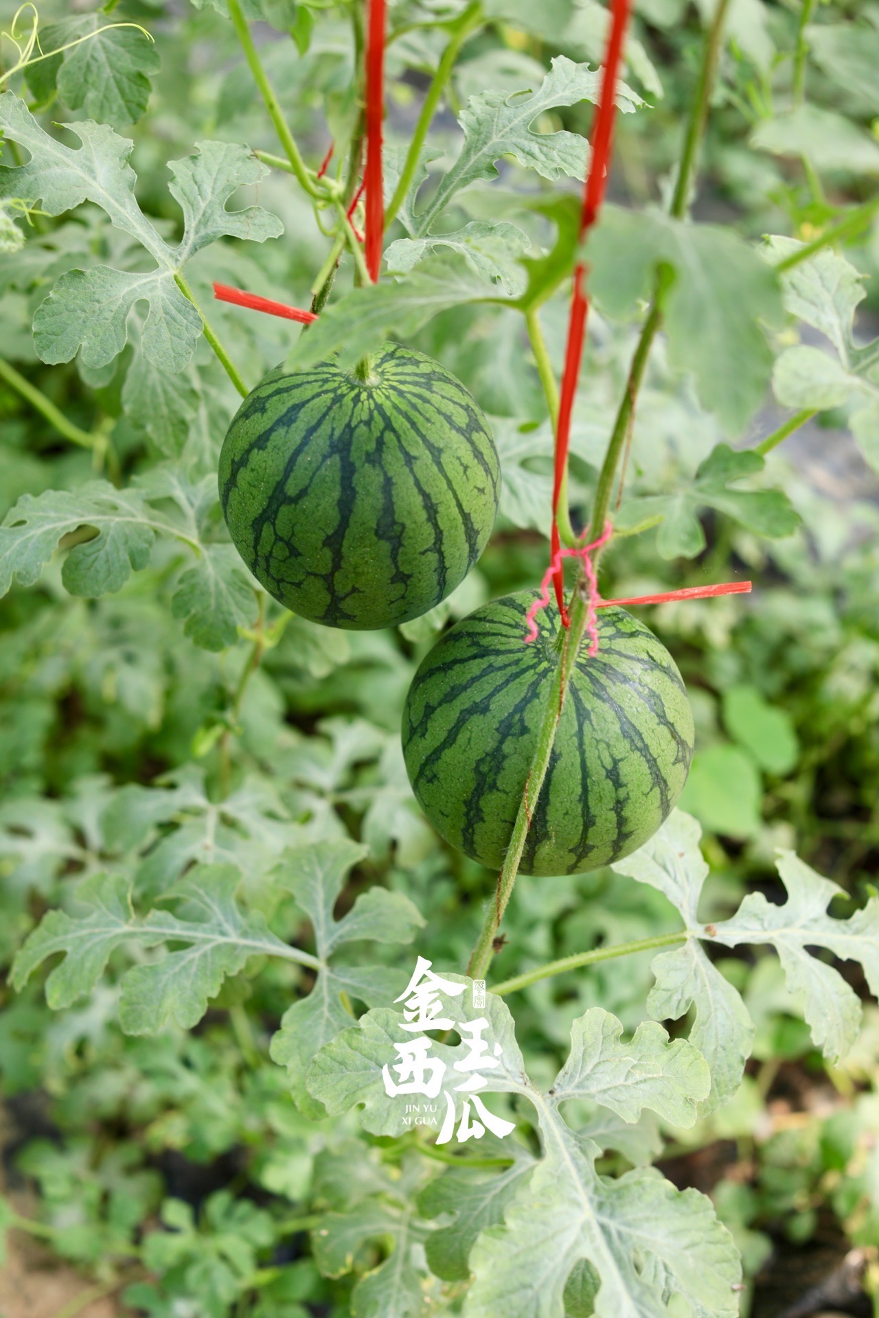 采用吊秧生长,保证了西瓜不与地面接触,360度采光,使得西瓜获取充足养分。