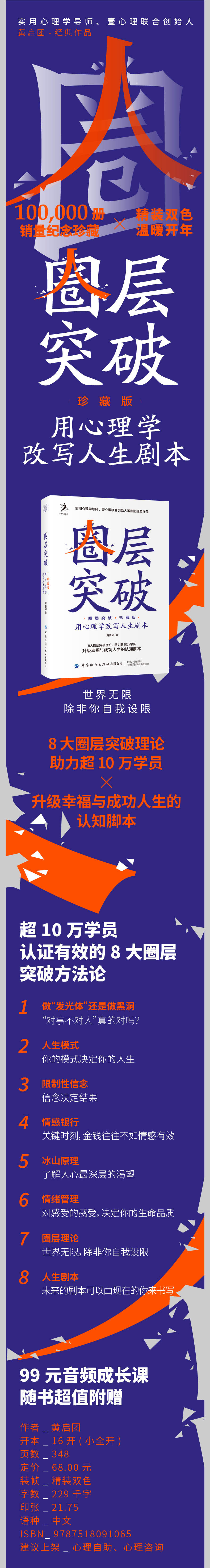 作者从业25年实践精华,实用心理学导师、心理用家黄启团用生命故事的方式娓娓道来,通过8大圈层突破理论(发光体理论、冰山原理、人生模式、限制性信念、情绪管理、情感银行、圈层理论、人生剧本),为当代深陷心灵困境的人提供书写生命精彩剧本的路径。