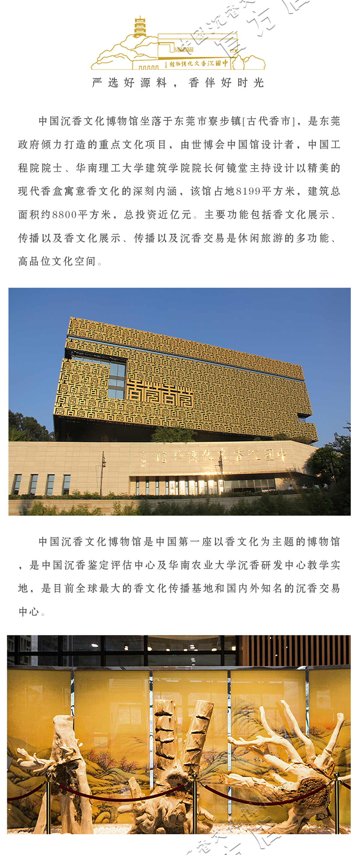 中国沉香文化博物馆坐落于古代[香市]东莞市寮步镇,是东莞政府倾力打造的重点文化项目,由世博会中国馆设计者,中国工程院院士、华南理工大学建筑学院院长何镜堂主持设计,以精美的现代[香盒]寓意香文化的深刻内