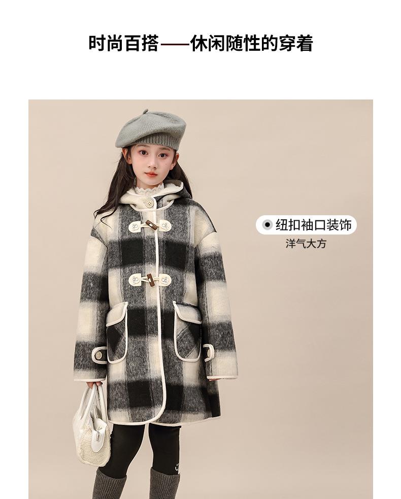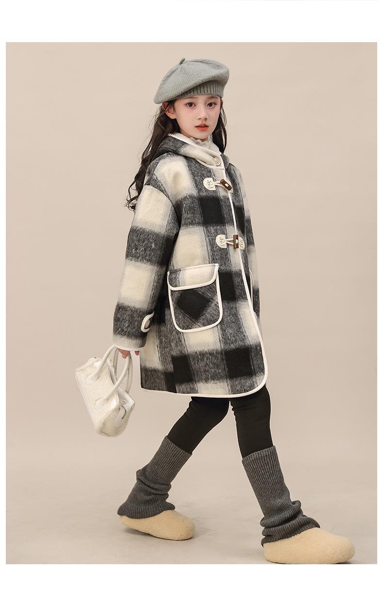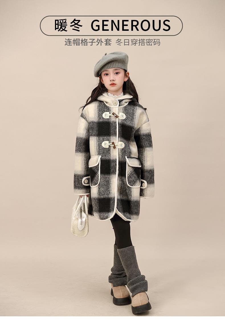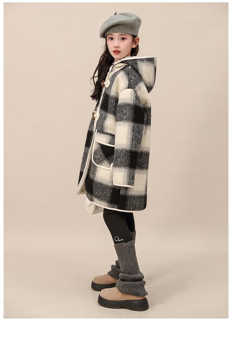 中大童黑色加厚2025新款冬季外套格子女童冬装中长款毛毛衣大衣