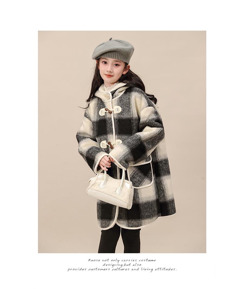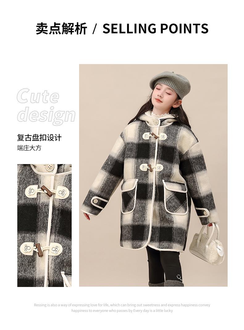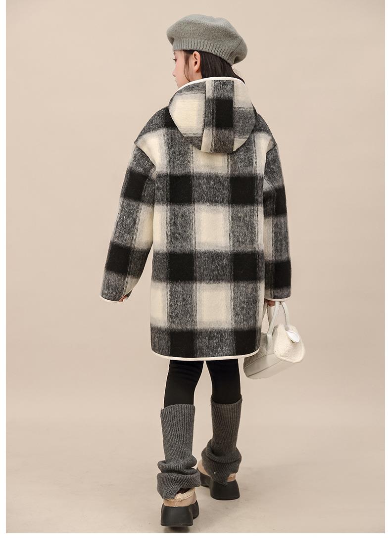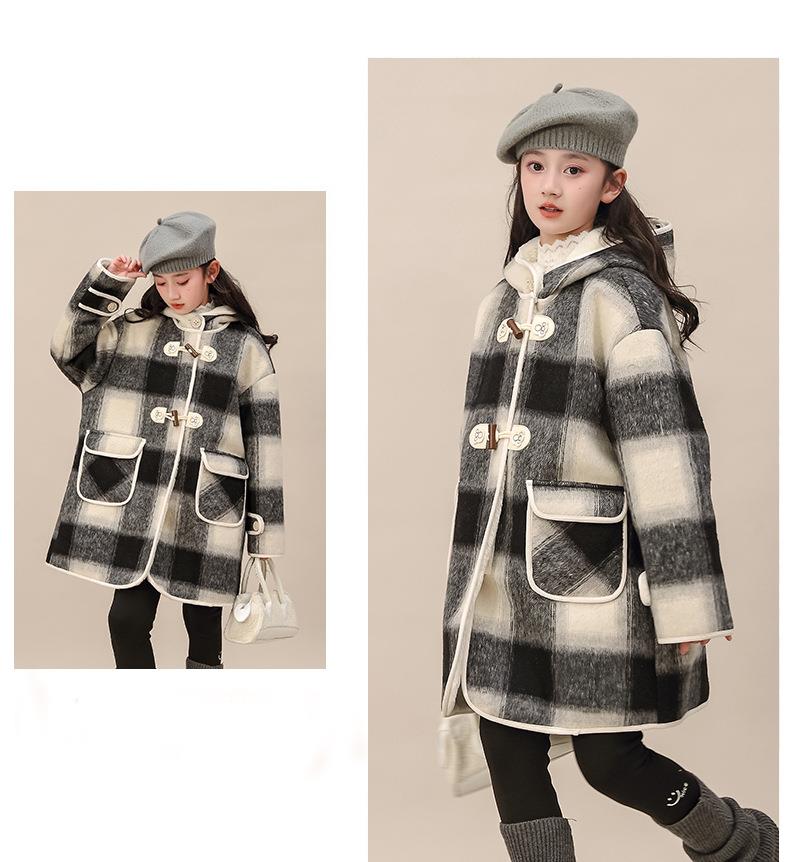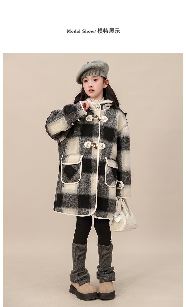 中大童黑色加厚2025新款冬季外套格子女童冬装中长款毛毛衣大衣