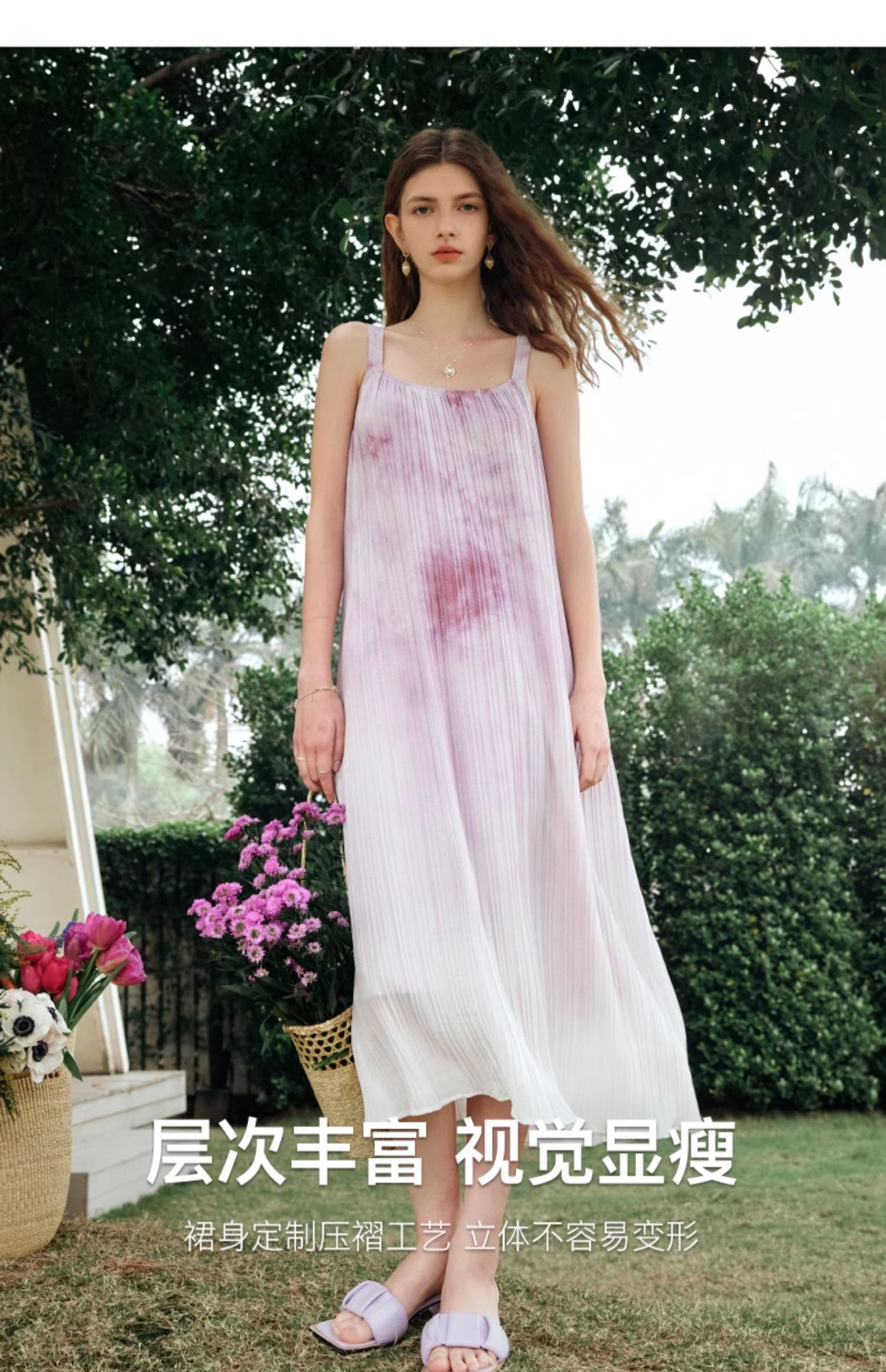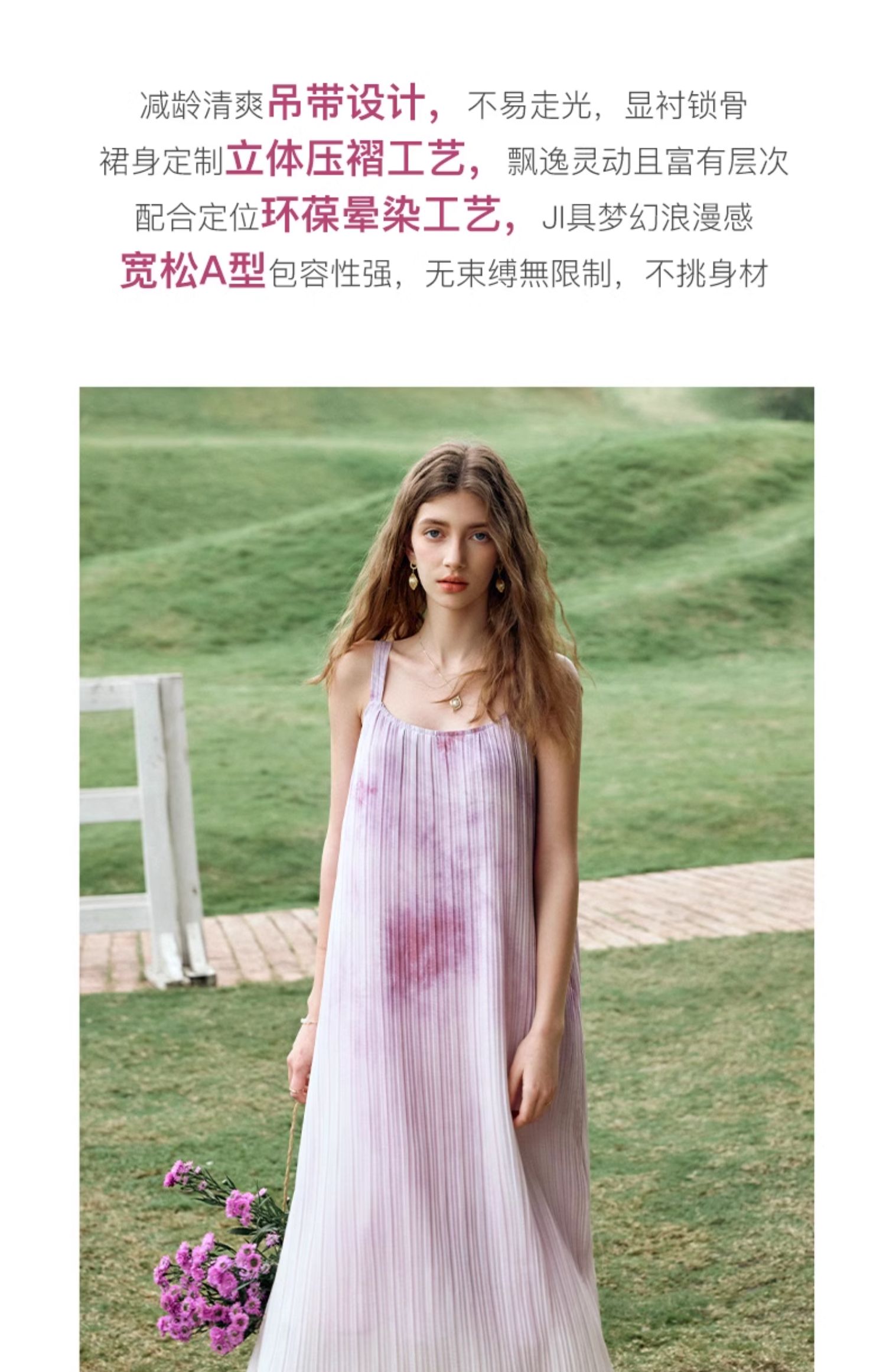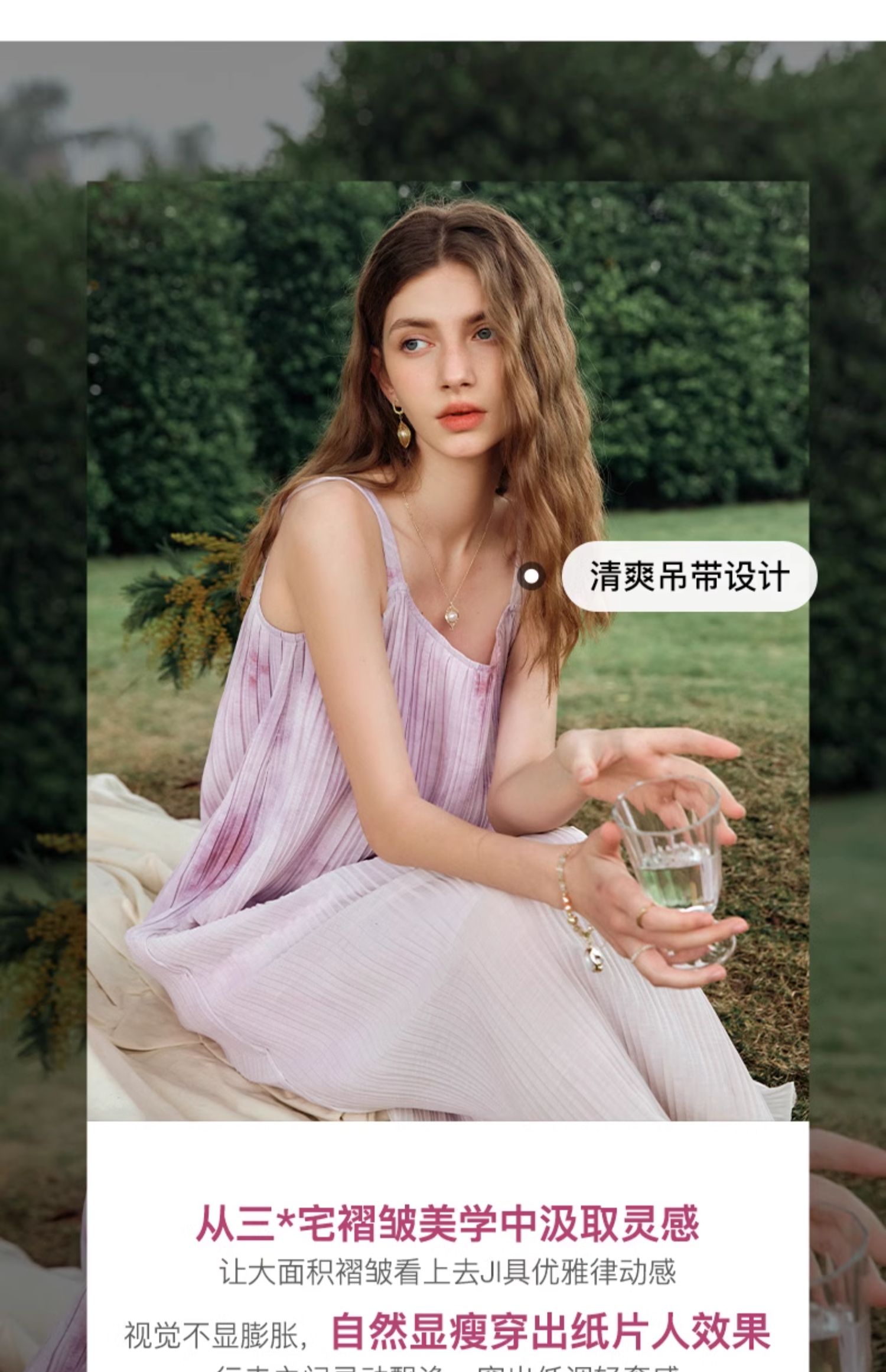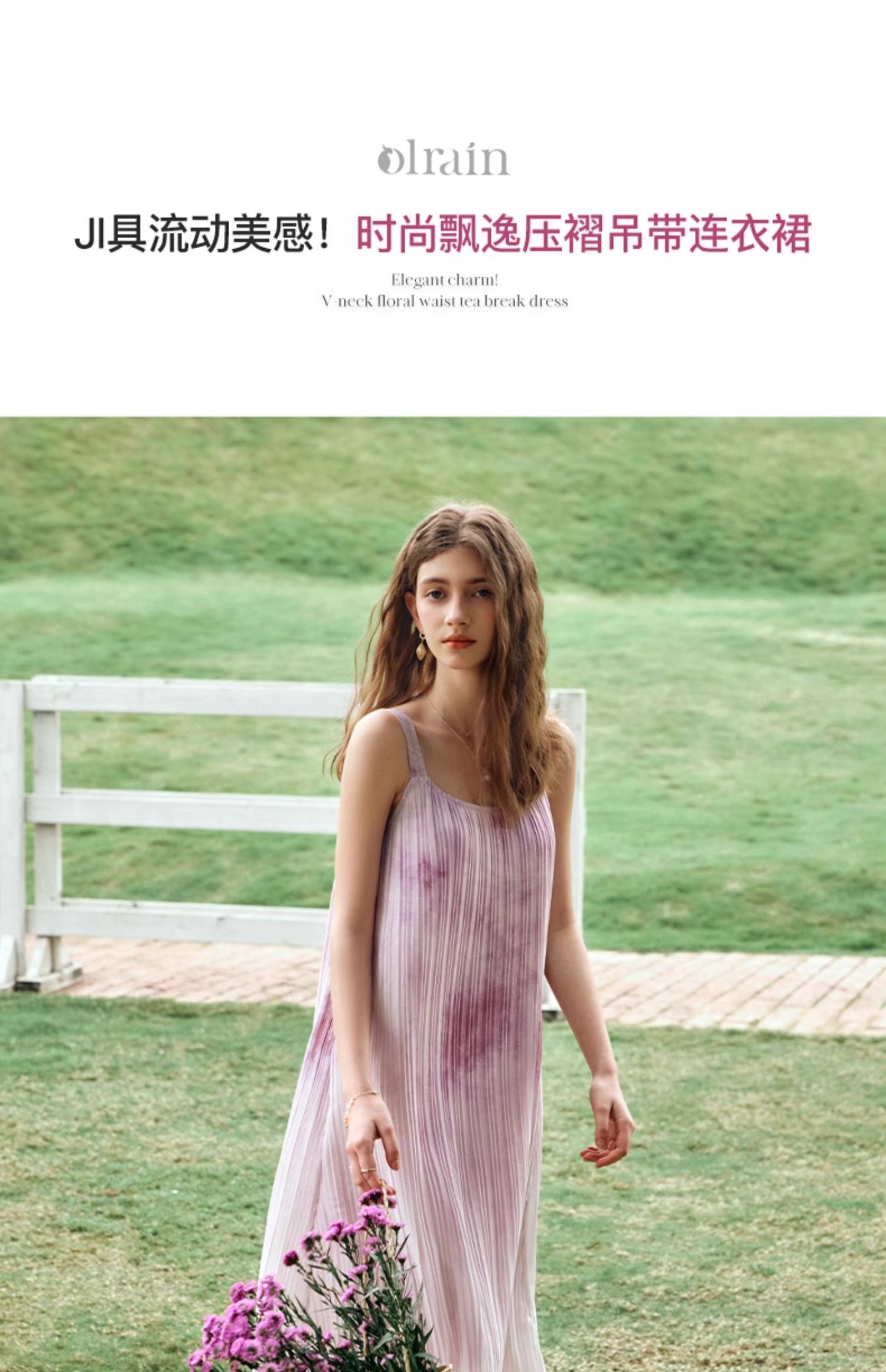 OLrain欧芮儿吊带连衣裙女夏季2024年新款时尚减龄度假风压褶长裙