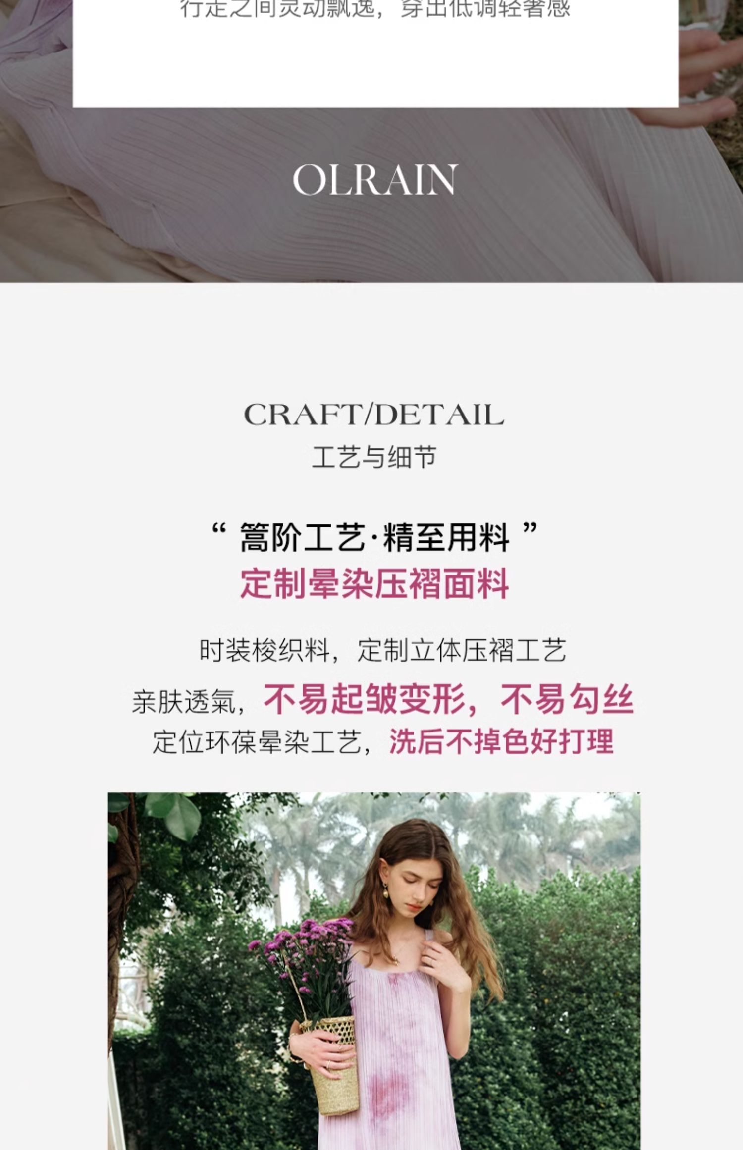 - “精致”是欧芮儿olrain品牌文化的核心,欧芮儿认为,精致的女人,不但要外在动人,更要内在迷人,内外兼修,有魅力、有气质、有内涵,自信而不自傲,优雅而不矫揉,自有万种风情而不轻浮,更不故作矜持。