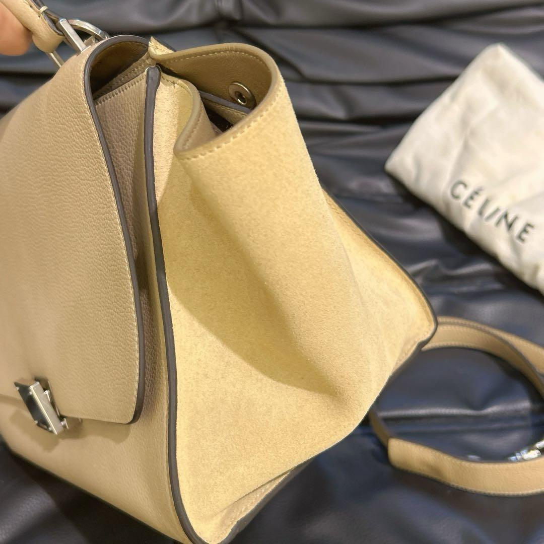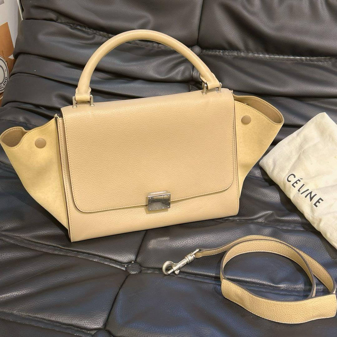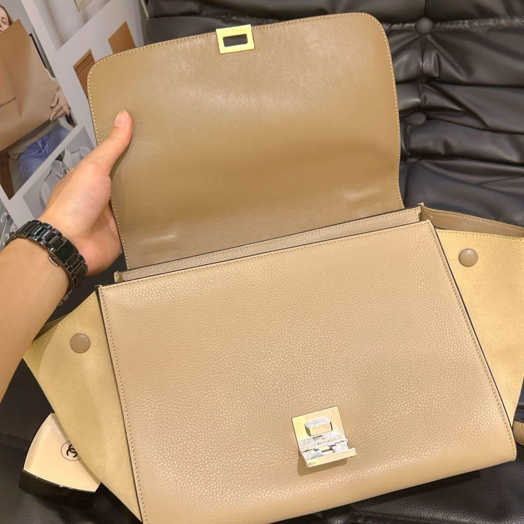 【商品詳情】正品二手 CELINE 小号 奶茶色 牛皮 trapeze 秋千包🎟️ 97新 27*22 配件:肩带 防尘袋。内包口两侧有小磨损 包型轻微使用感。简约时髦款