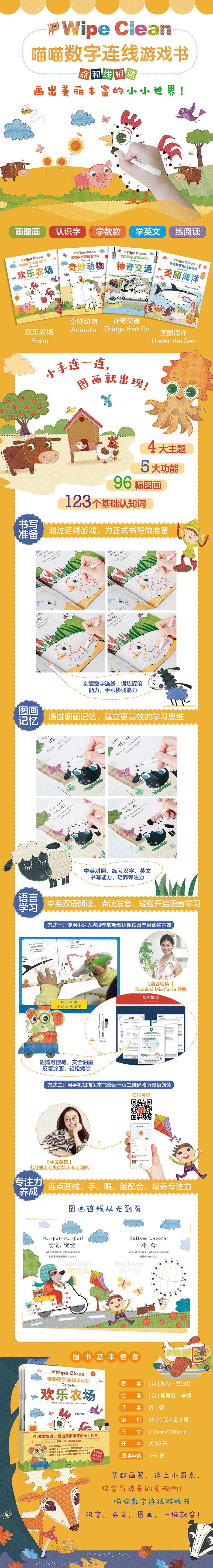 《喵喵数字连线游戏书》4册,包括四大经典认知主题:《奇妙动物》《美丽海洋》《神奇交通》和《欢乐农场》。中英双语,扫码可听,也可配合点读笔使用。跟着数字圆点轨迹连线,小朋友可以画出一幅漂亮的图画;书中有96幅可反复擦涂的图画,123个宝宝基础认知字词描红。这套多功能书写游戏书附赠可擦笔,连线画图,可反复使用。画图画、认识字、学数数,学英文。培养图画欣赏能力、专注能力,锻炼手眼协调能力,预备书写和阅读能力。小手连一连,图画就出现。汉字、英文、图画,一描就会!