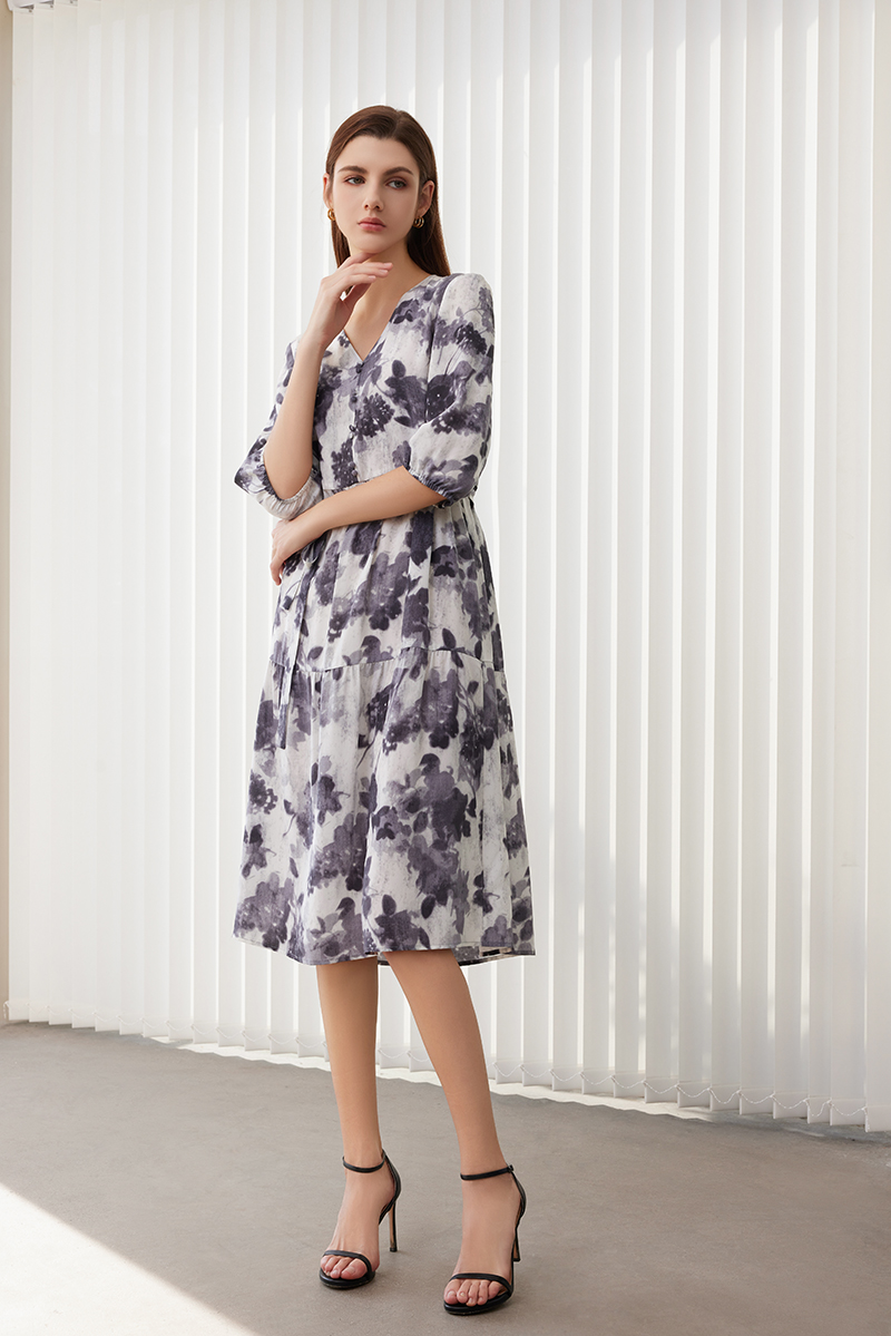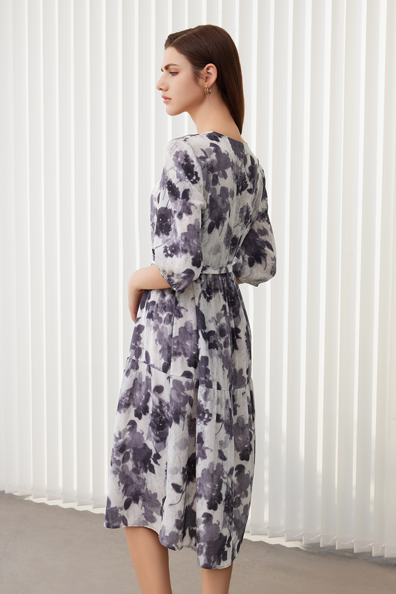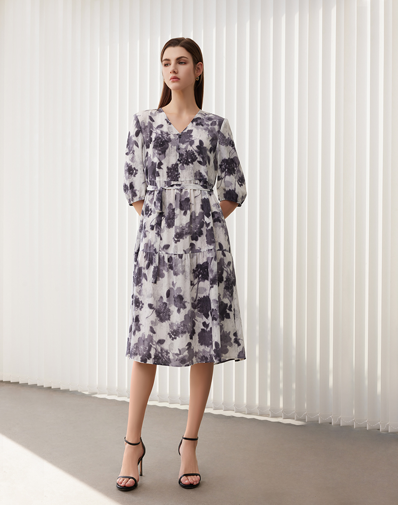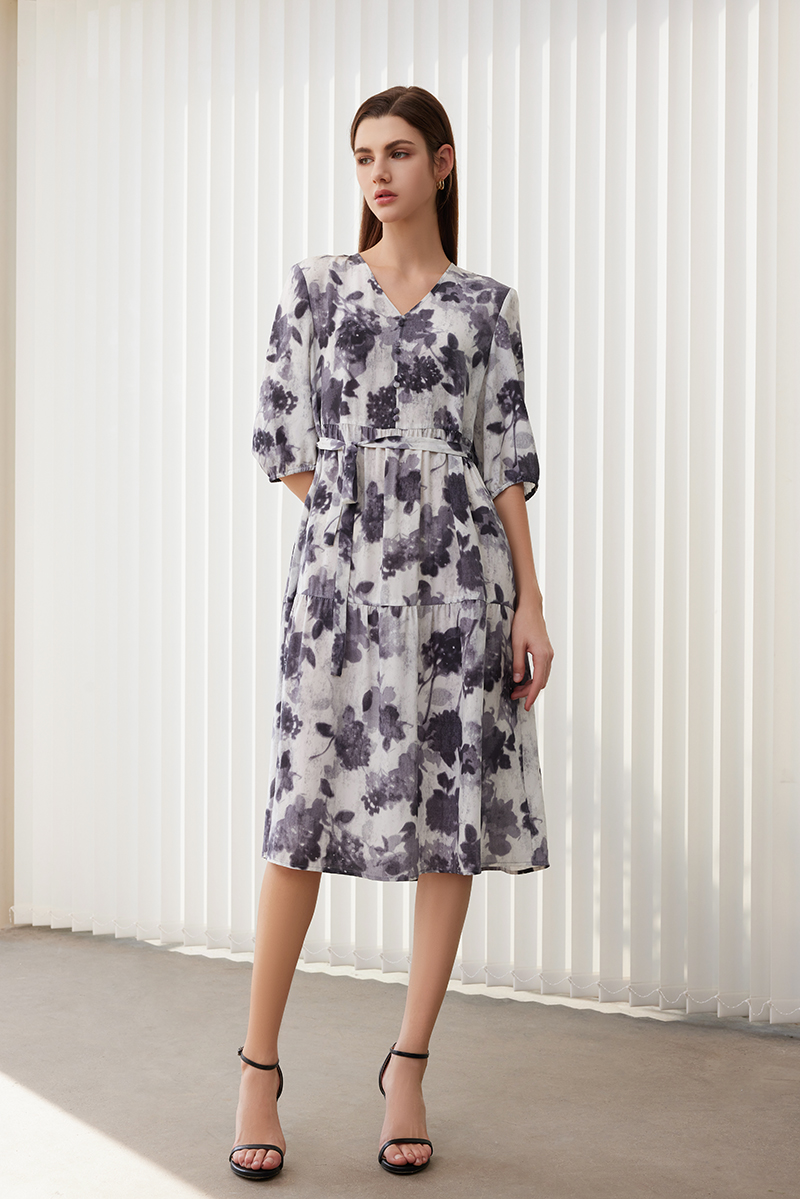 【系带拼接真丝连衣裙】24年春夏新品100%桑蚕丝V领系带连衣裙