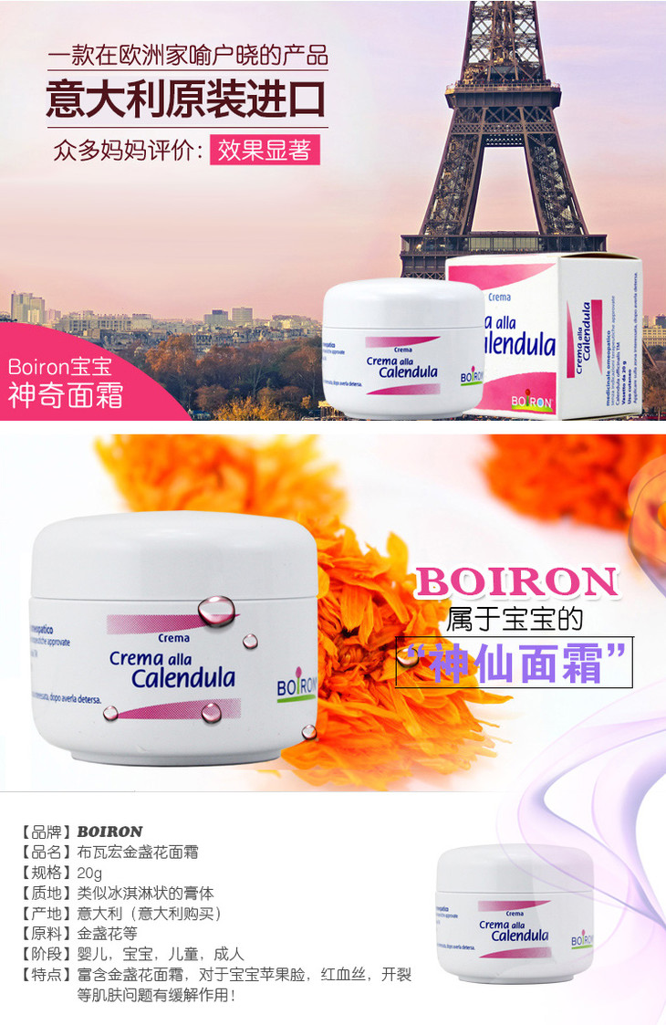 来自法国的品牌,意大利销售版,温和滋润,质地细腻,号称冰淇淋面霜,富含金盏花精华,让宝宝告别苹果脸,红血丝,开裂等!