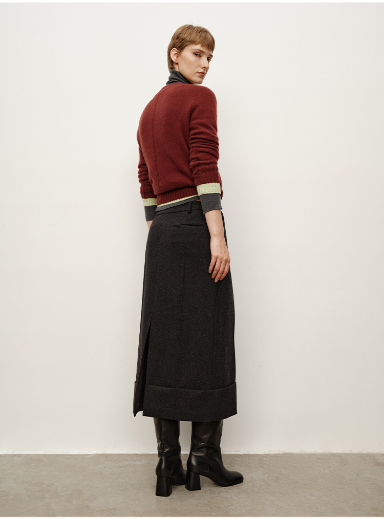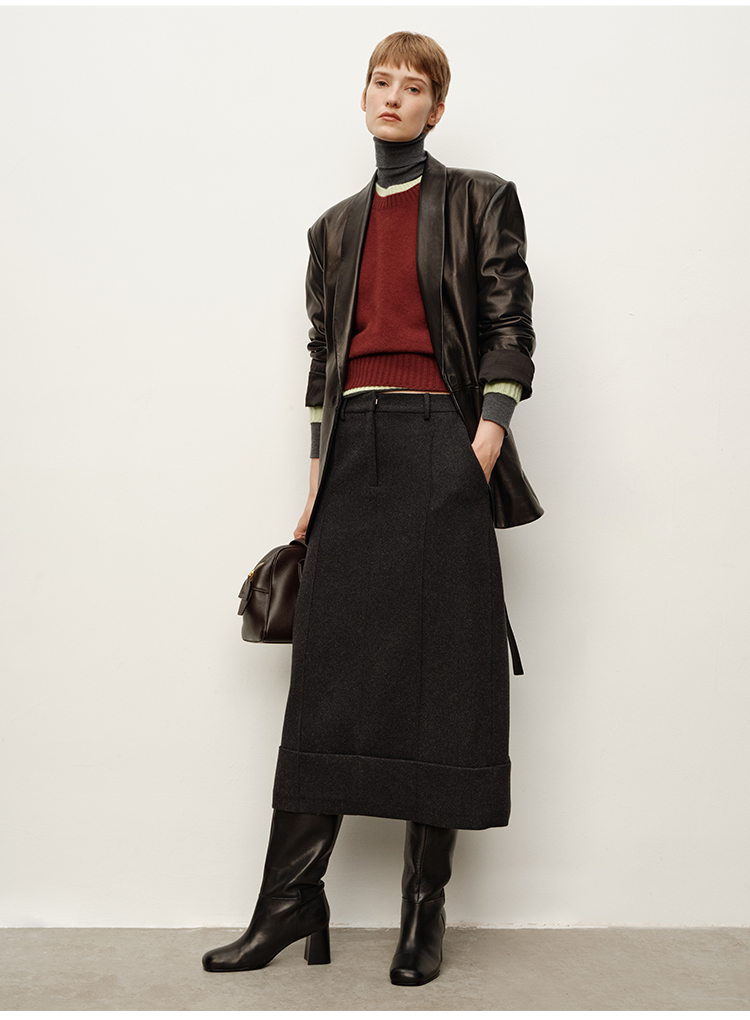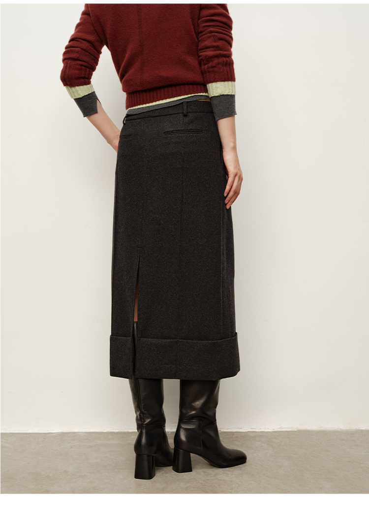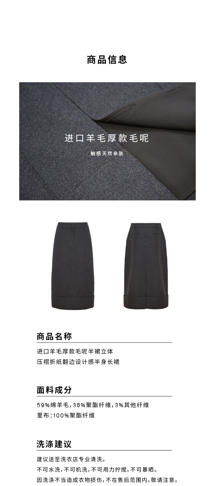 HIDEMI 进口羊毛厚款毛呢半裙立裁立体压褶折纸翻边设计感长裙