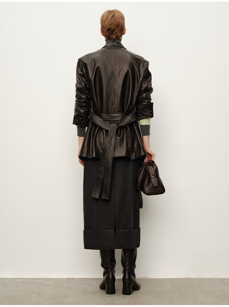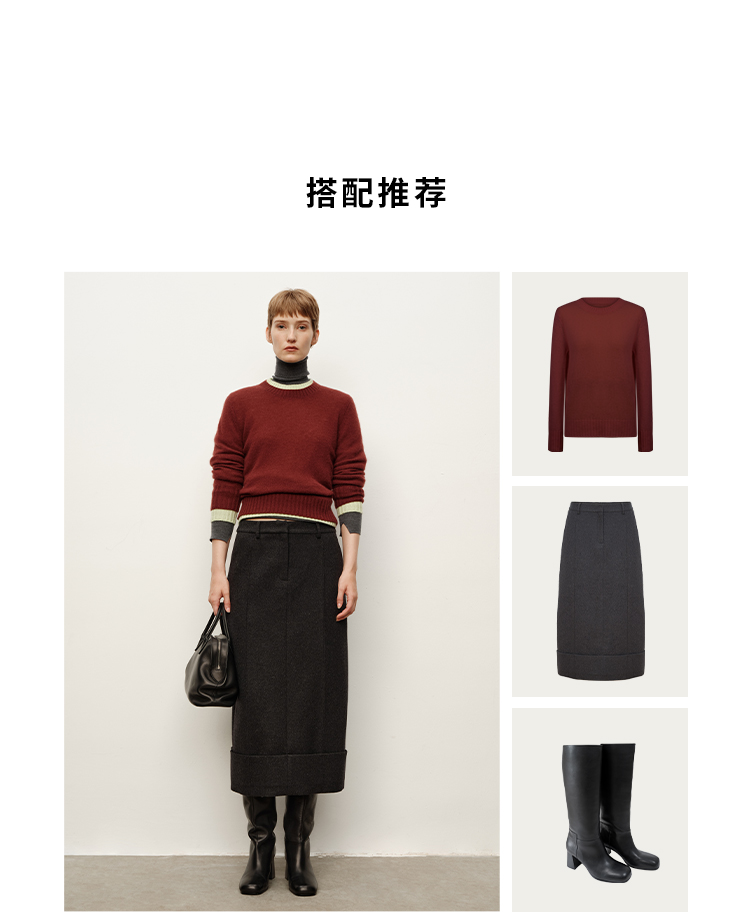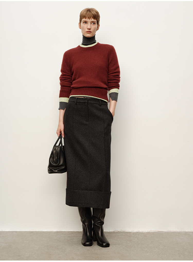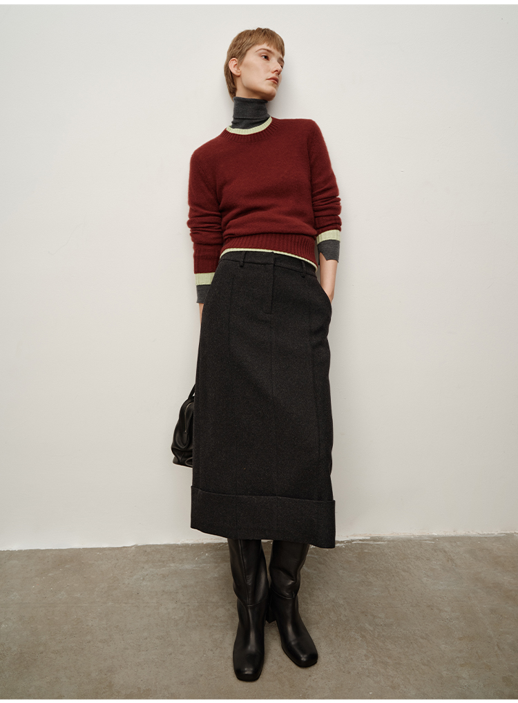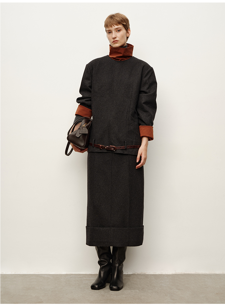 HIDEMI 进口羊毛厚款毛呢半裙立裁立体压褶折纸翻边设计感长裙