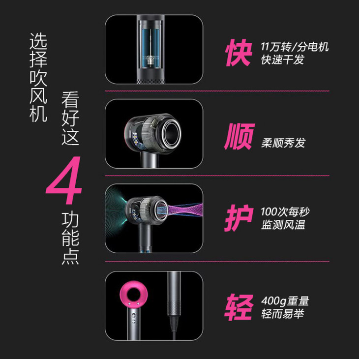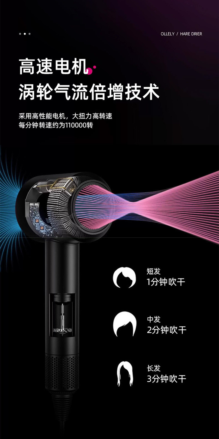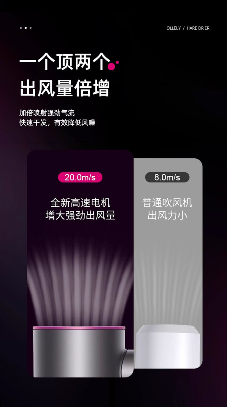 ✅每分钟的转速高达十一万次,比传统吹风机转速提升5.5倍 60米/秒的涵道气流倍增技术 模拟喷气式风机引擎优化风道,比传统风筒气流放大了四倍 有效缩短了发丝毛鳞片的张开时间 干发速度加倍快 省时 省事 省心 还养发
