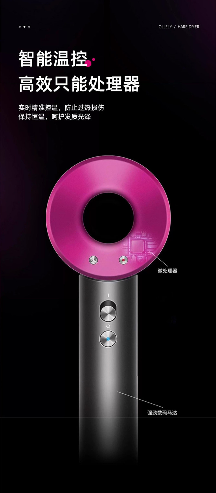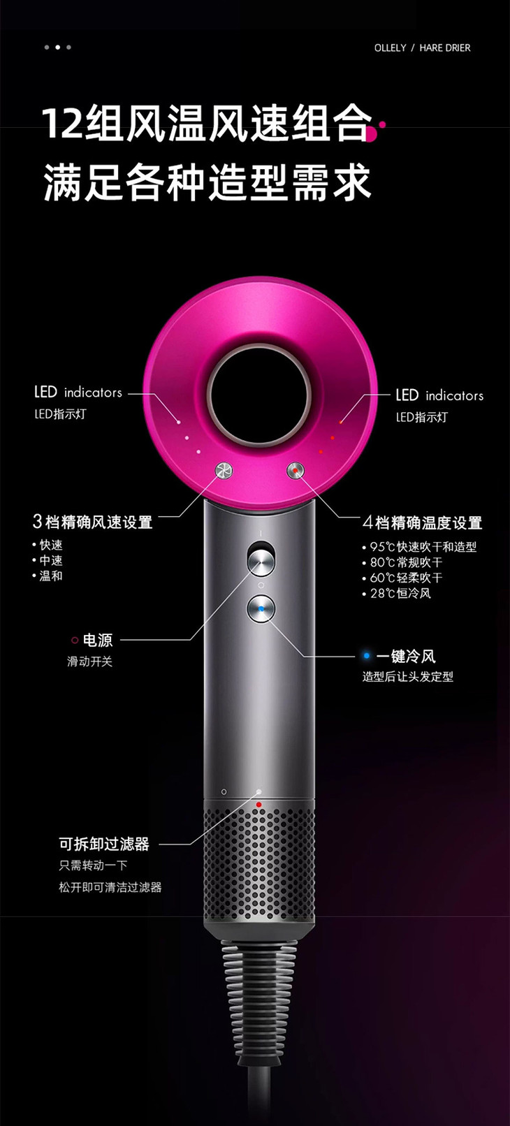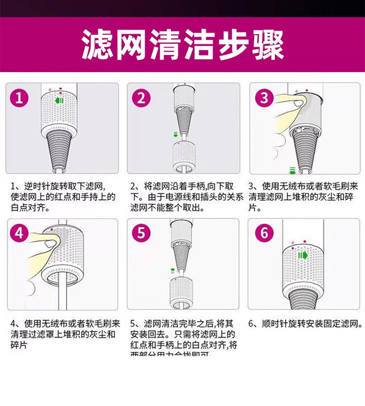 它和原版一样采用下沉式进风口设计 涡轮增压式改变进风设置 手柄尾部进风聚集式输风 内置滤网可以放置头发和灰尘堆积 便于清洁 长发纷飞也再不缠绕不卡头,这点很重要!!