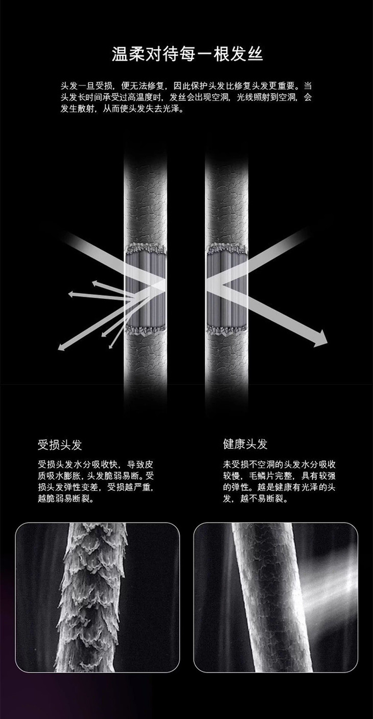 头发的本质是蛋白质,高温下就会开始变性 一直保持着高温的吹发就会造成发质损伤 让毛鳞片炸开,让头发失去光泽 老式吹风机全都有“高温烘干”这个弊端 所以日常吹干头发最好保持的是恒温低温 这对我们养成绸缎发质有本质上的效用