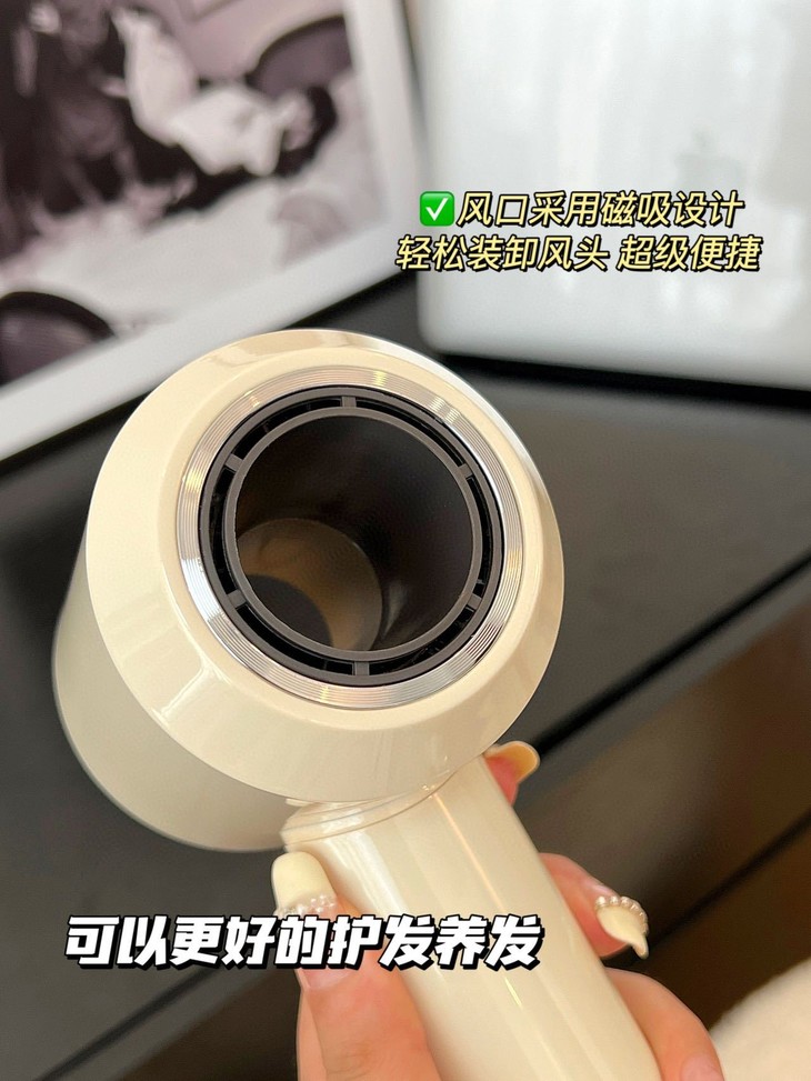 除此之外,这把高速吹风机还把电机藏在了手柄里 这样一来,重量集中在手柄处,握吹风机的手感也会很稳定 举吹风机不再像举锤子一样,头重脚轻 吹发的体验感从哪看都是好 💥手柄尾部的滤网罩也是磁吸的可以轻松卸下清理灰尘