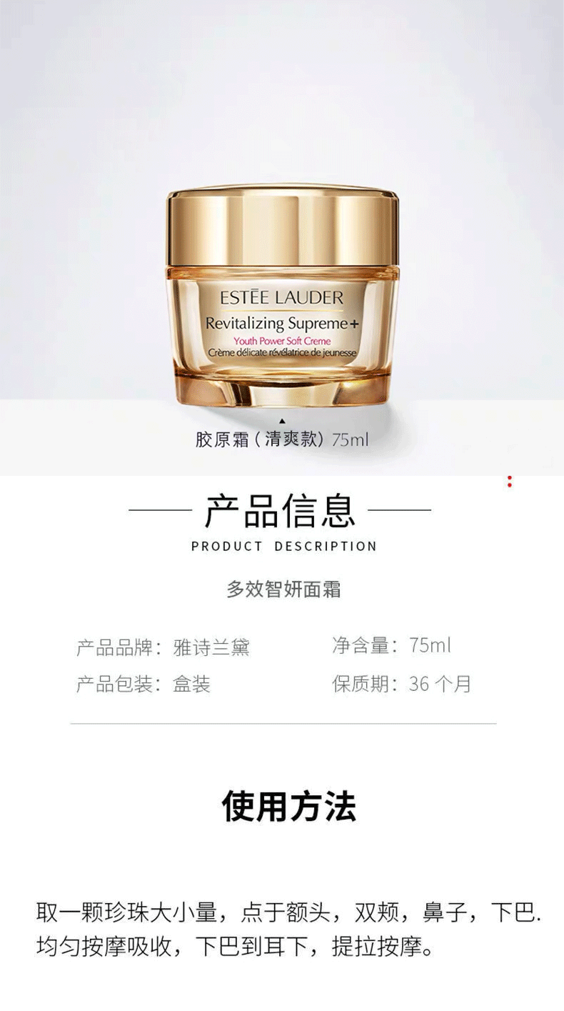 【品牌】雅诗兰黛 【商品名称】:Estee Lauder雅诗兰黛第二代智妍面霜75ML(清爽/滋润) 【规格】:清爽面霜75ml 滋润面霜75ml 【产地】:法国(以实际收到的批次为准) 【有效期】: 【保质期】:3年 【包装方式】:单独盒装 【版本】:国际版 【快递】:不接受指定快递 【运费标准】:全国包邮,新疆西藏不发货 【发货地】:义乌 【发货时效】:72小时 【售后政策】:下单后不支持7天无理由退换货,故不支持您的如下退货退款申请:快递一直未到/多拍/拍错不想要不喜欢效果不好/拒收。) 一旦发货 税费自动扣除,产生的税费和退回产生的运费需要客户承担 |
