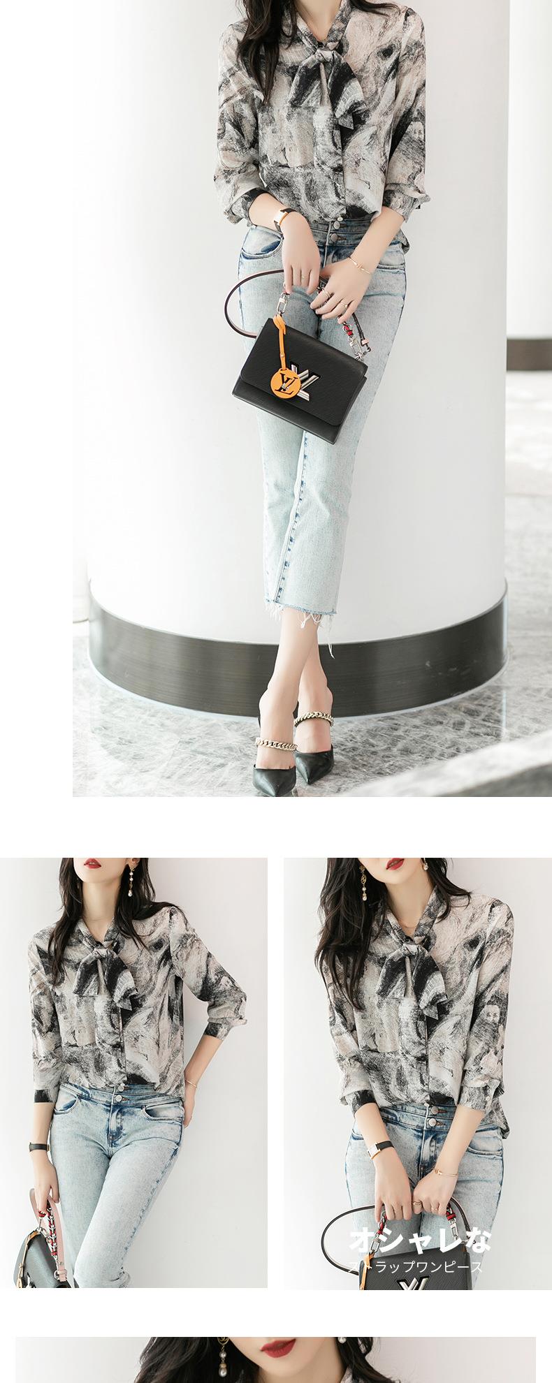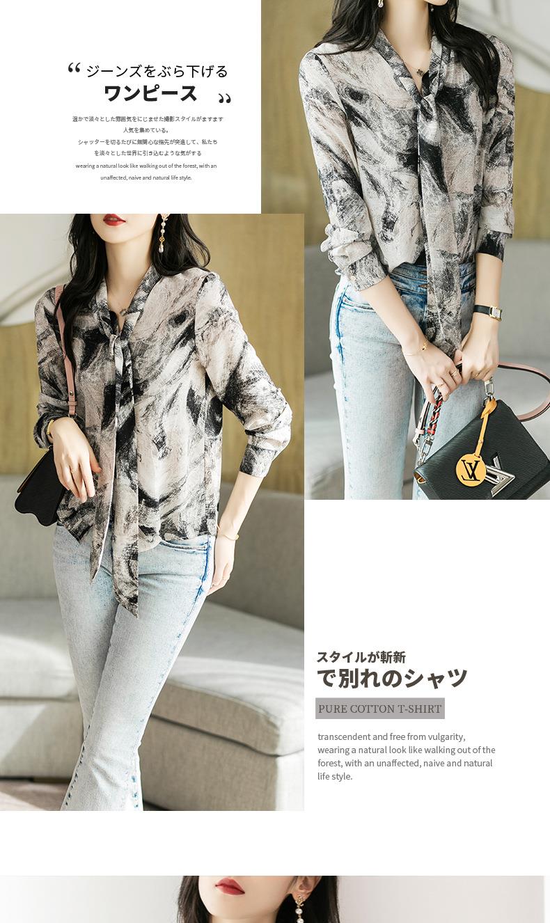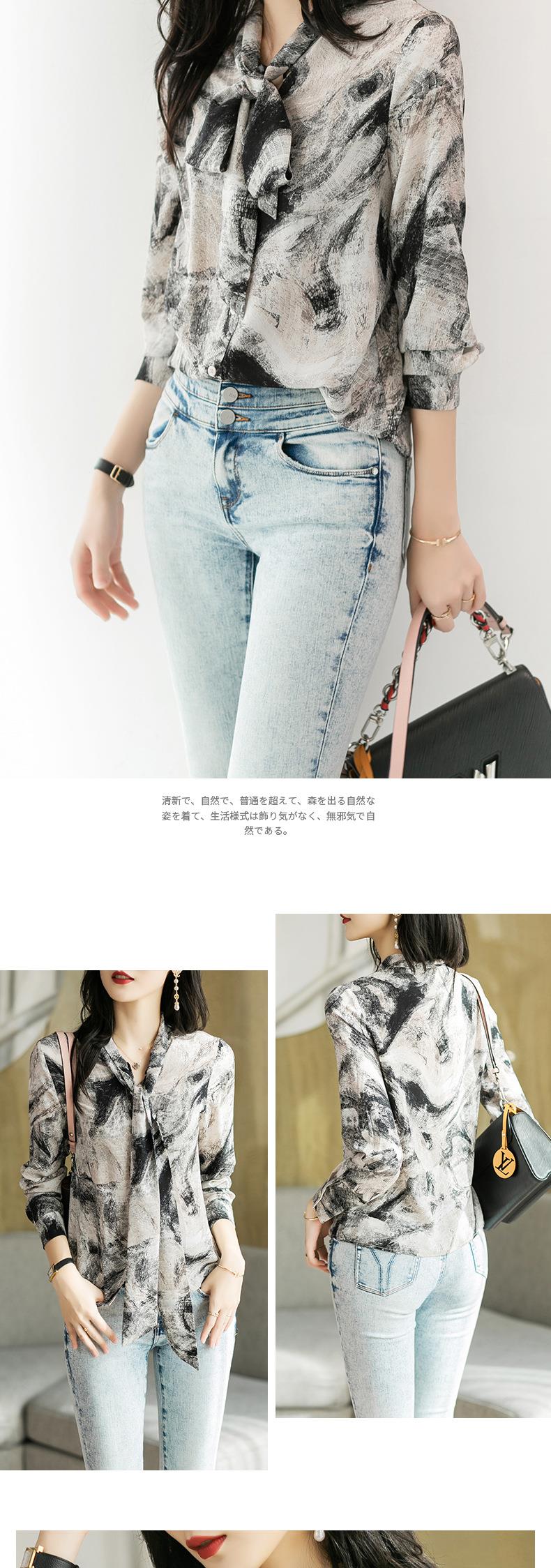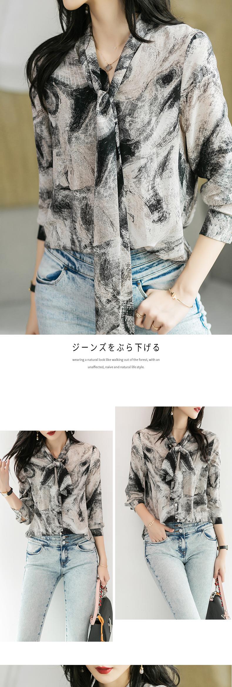 港风2023秋装新款雪纺印花衬衫女长袖系带女士衬衣1890