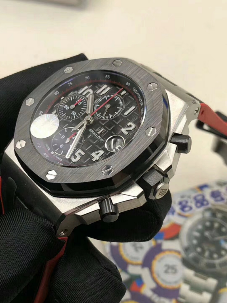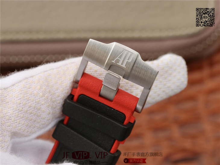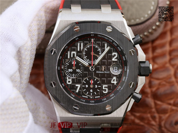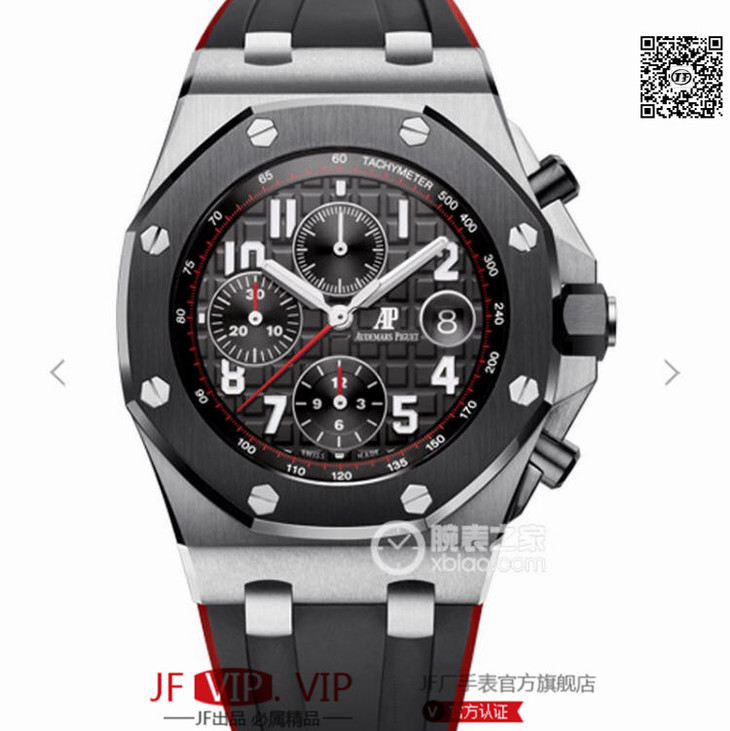 JF 爱彼2018新款皇家橡树26470,钢壳陶瓷圈新品.直径42毫米!陶瓷把头陶瓷按的,搭载订制版12H计时3126机芯,特制的黑红橡胶带。