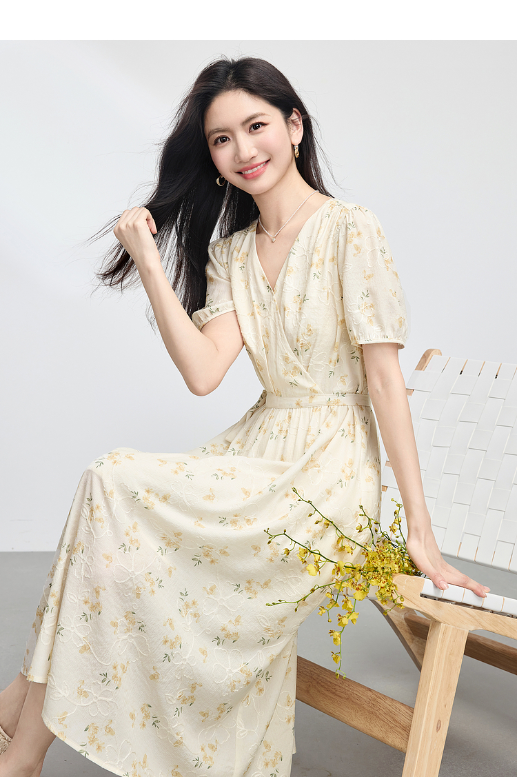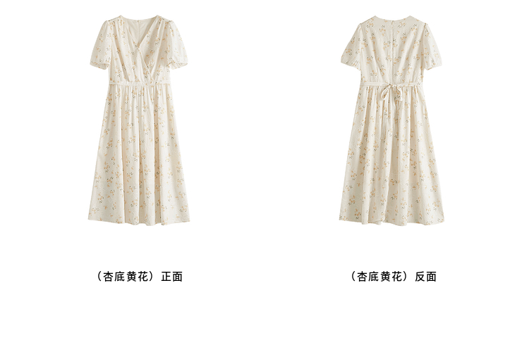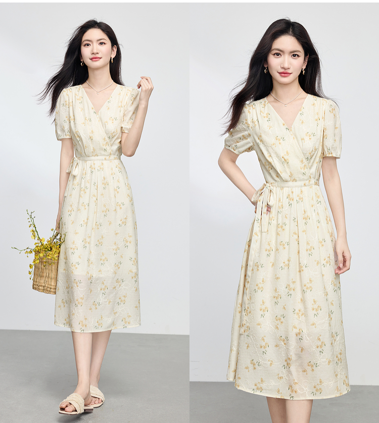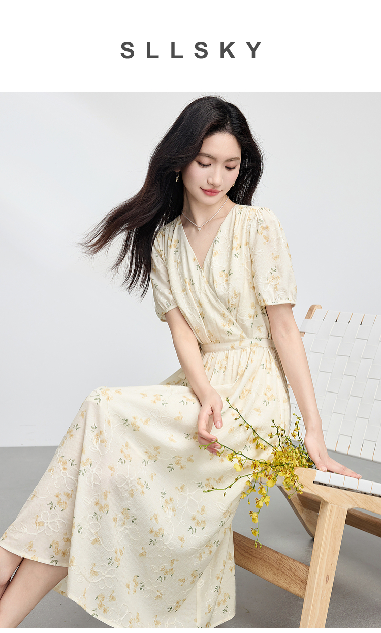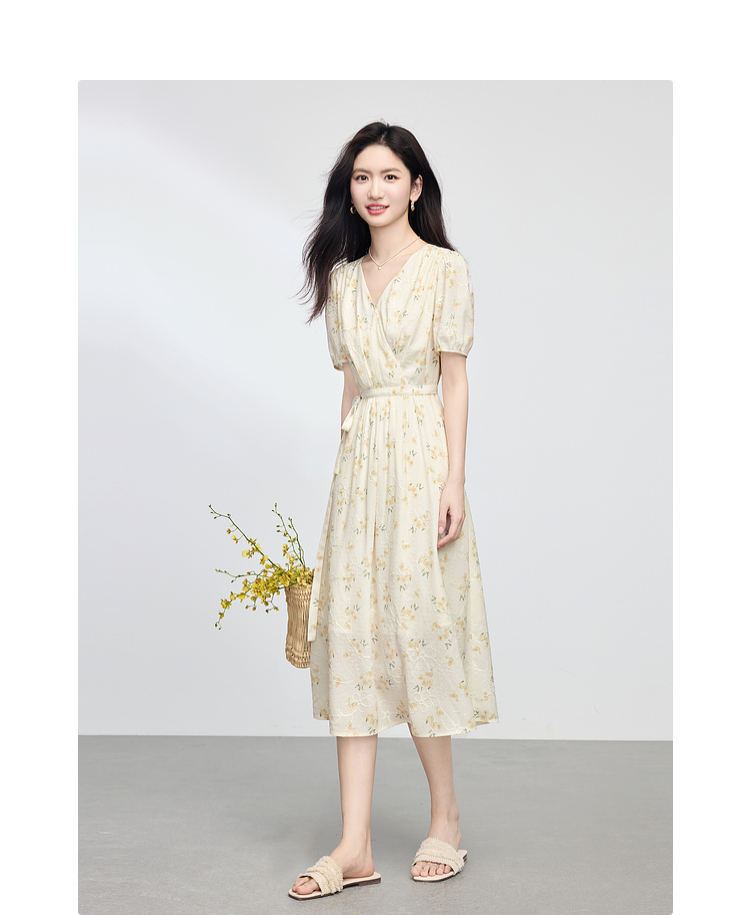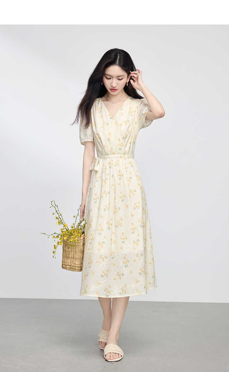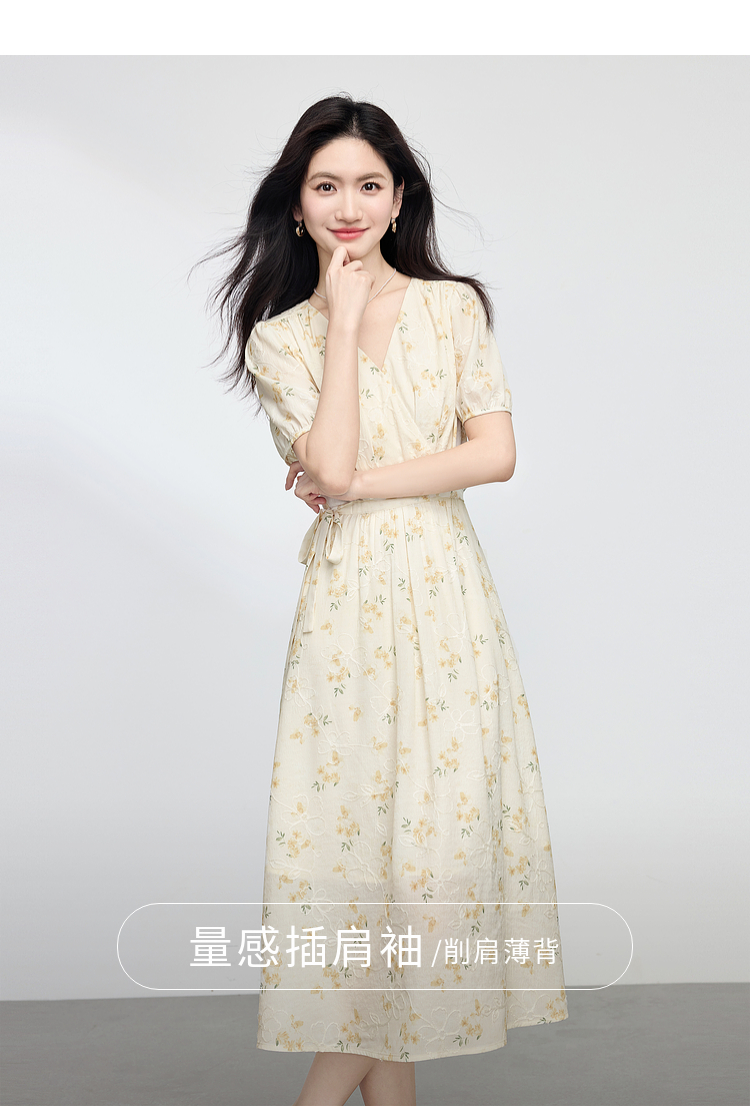 熙世界黄色碎花连衣裙女2025年夏季新款法式收腰V领茶歇绝美裙子