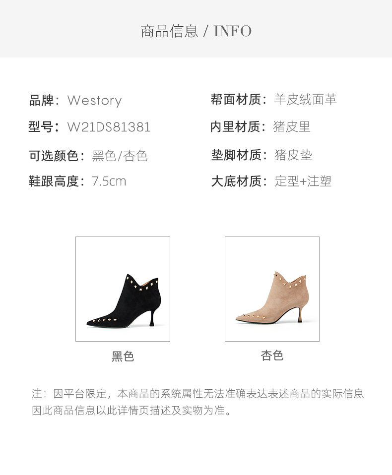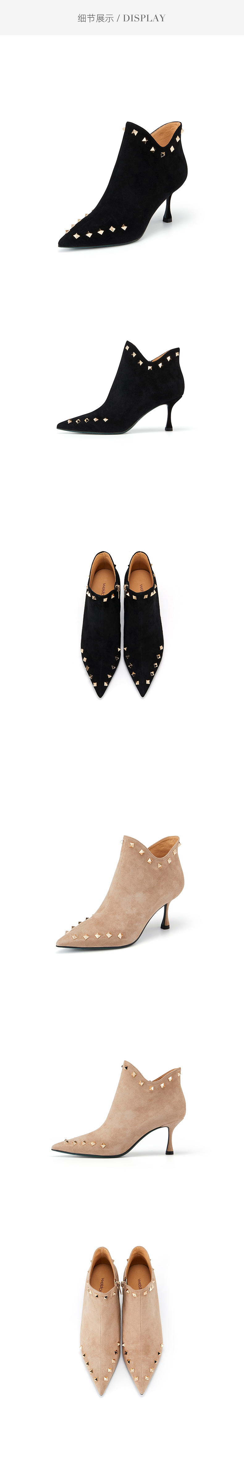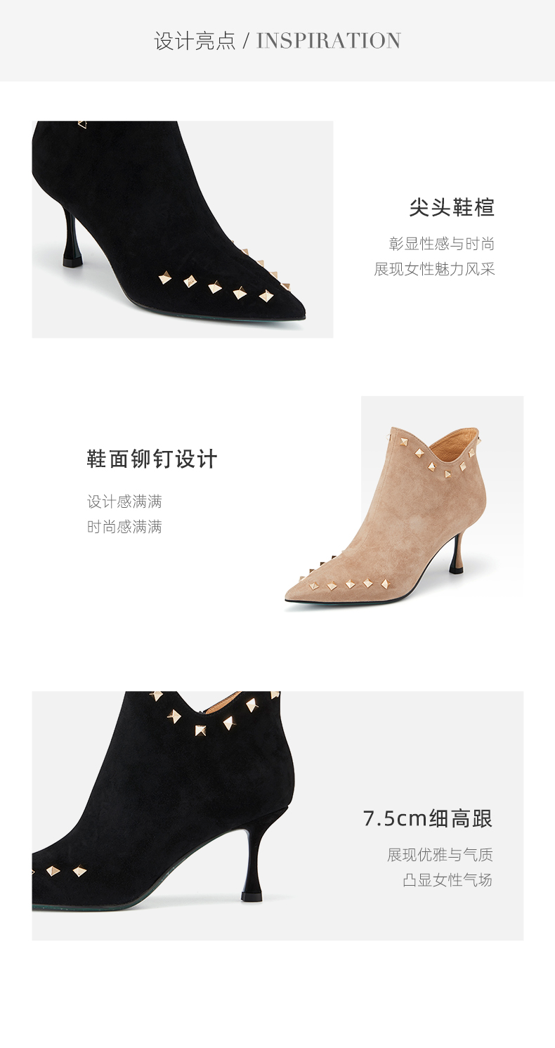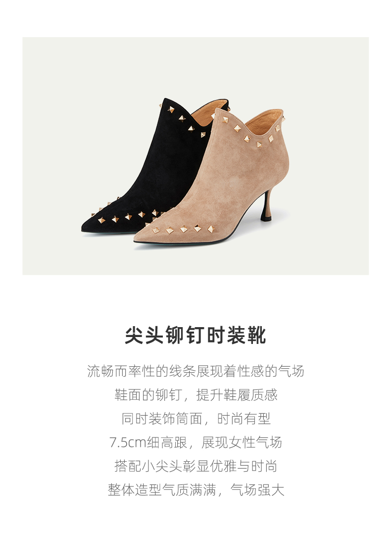 westory2021秋冬新品绒面时装靴铆钉短筒尖头女靴W21DS81381