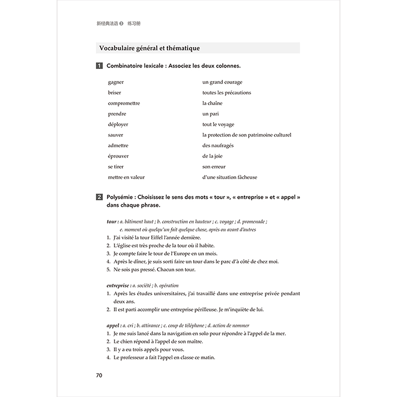 《新经典法语3练习册》是《新经典法语3学生用书》的配套练习手册,内容与学生用书同步,根据学生用书的安排,共分为4个单元,14课。每课一练,巩固课上所学的语法点和语言点。练习题型新颖,听说读写译能力训练并重,在有限的课堂时间之外,更加注重听说训练,以期达到以测促练、以练促学的目标。通过丰富多样的训练习题辅助学生真正把语言基本功训练落到实处。