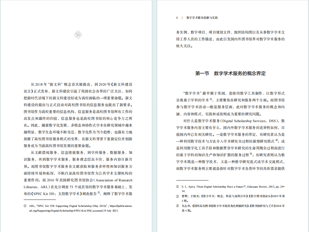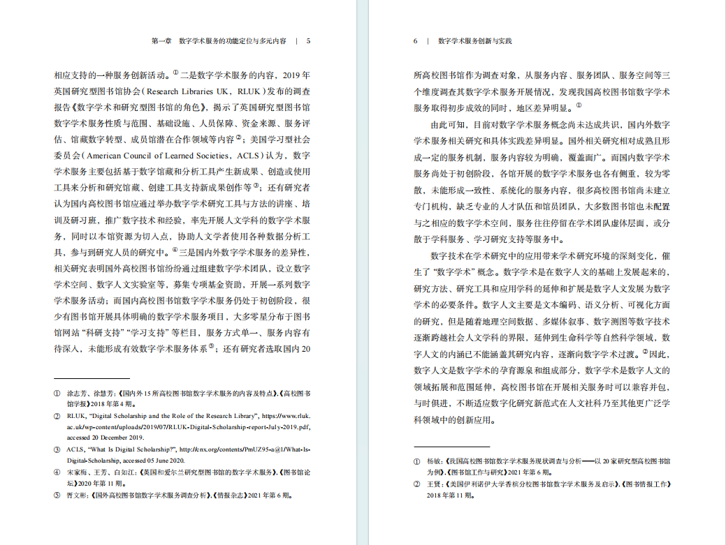 数字学术服务是一种新型的、促进和支持数字环境下学术研究的服务范式,其核心是高校图书馆充分运用各类数据资源、数字技术工具和方法等优势,面向学术研究全过程,融入科研流程的各个环节,提供嵌入式、系统化、全方位的服务,引导并支撑各个学科领域的研究者应用数字方法工具、开展跨学科研究、推动学术跨界分享交流、促进数字化学术成果发布或产品转化。