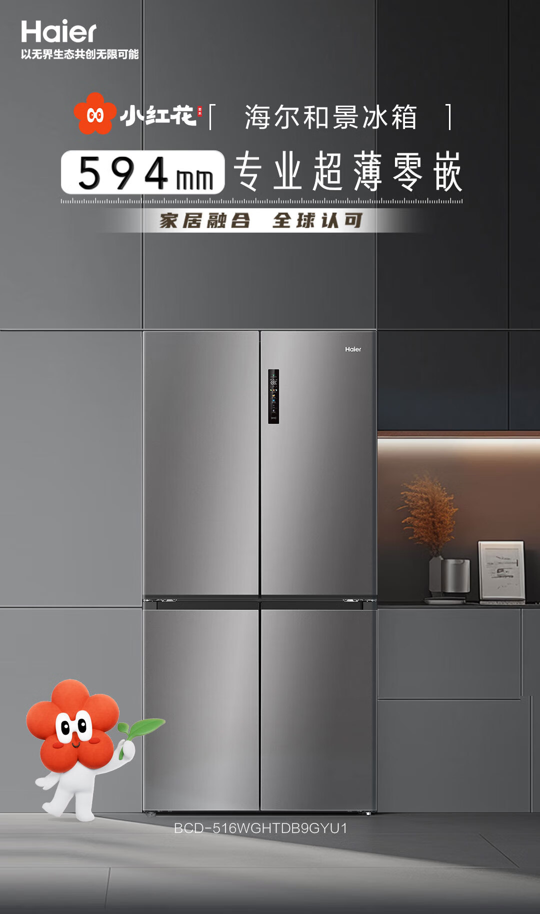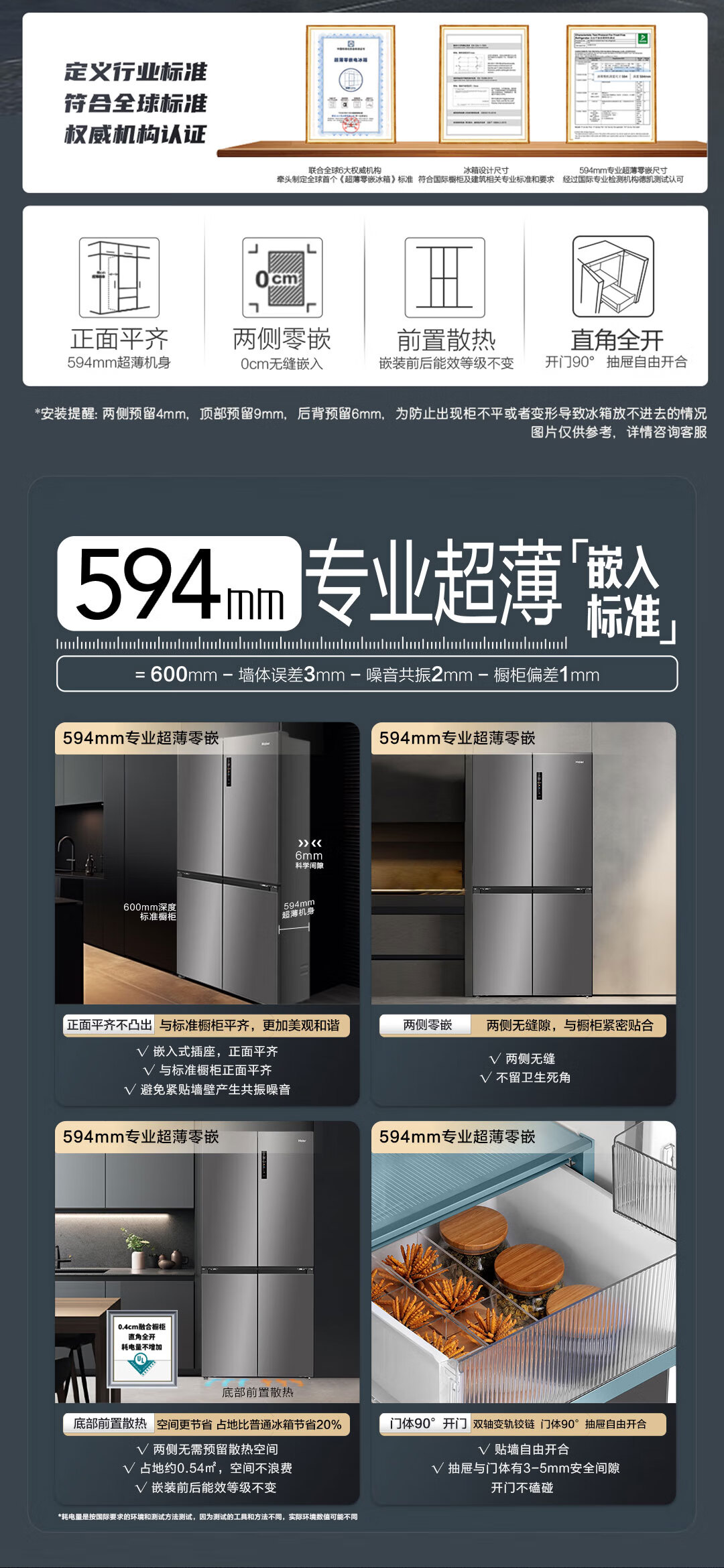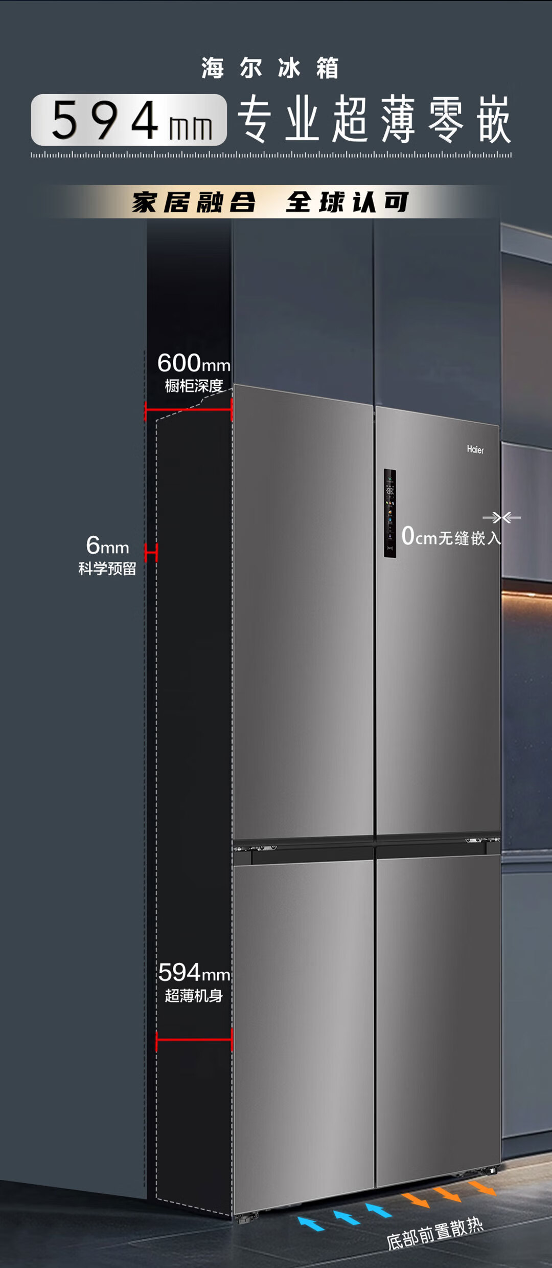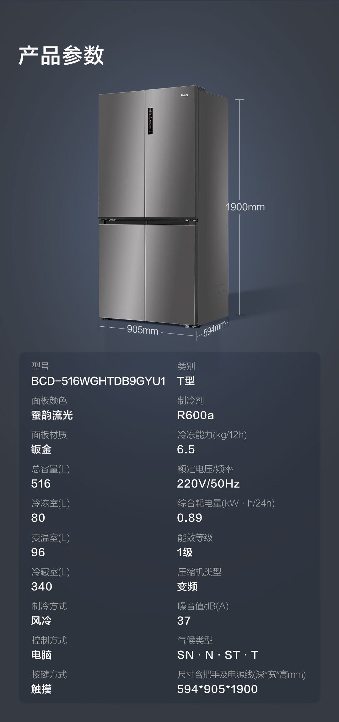 海尔(Haier)516升594mm专业超薄零嵌十字T型四开门电冰箱嵌一级能效BCD-516WGHTDB9GYU1博卡灰