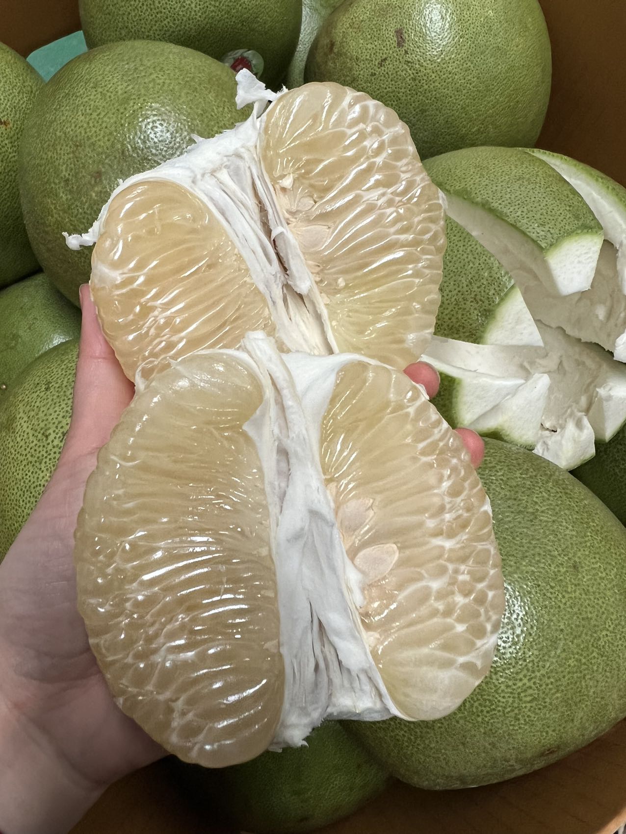 这种青柚最大的特点,味道清甜,果肉多汁,在嘴里能清晰的感到果肉的脆嫩滑爽又颗粒分明;一口咬下去果汁就会biubiu的喷开来,脆嫩嫩的果肉就像是一颗颗装满水的气球那样啪啪啪炸开。扎实而饱满,果香萦绕每个齿间,带着柚子特有的清苦,回味却甘甜。