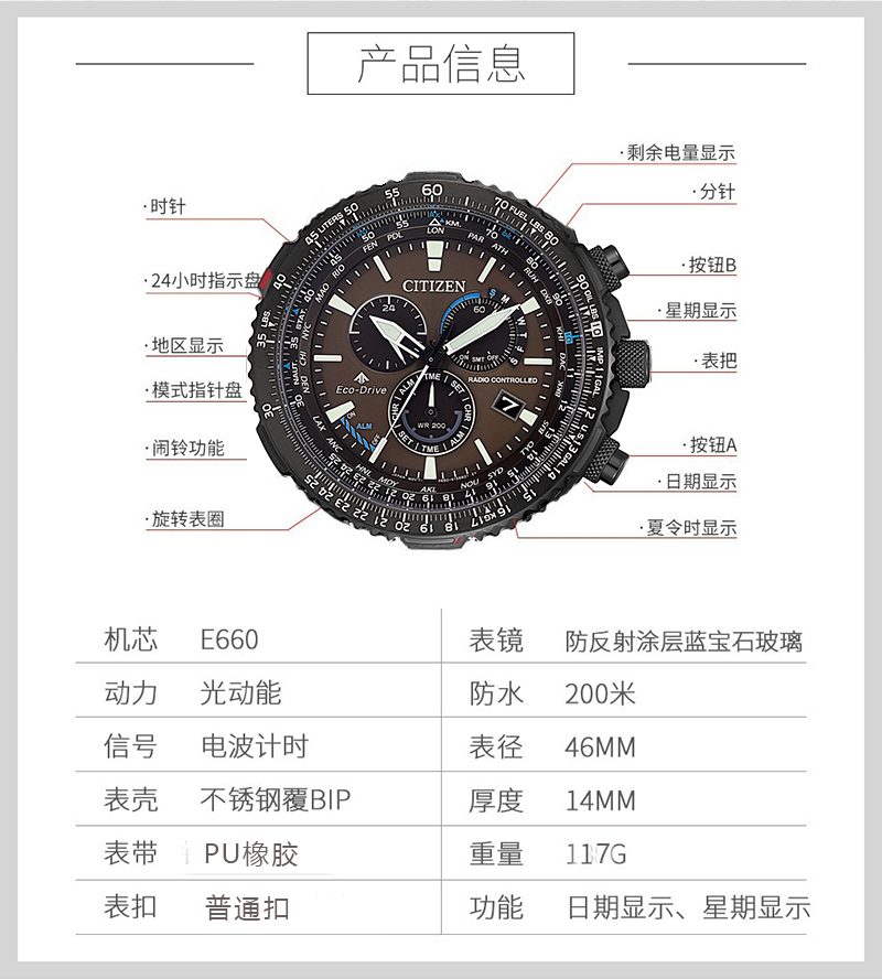 西铁城(CITIZEN)光动能多局电波男表空中之鹰系列JY8085-81E