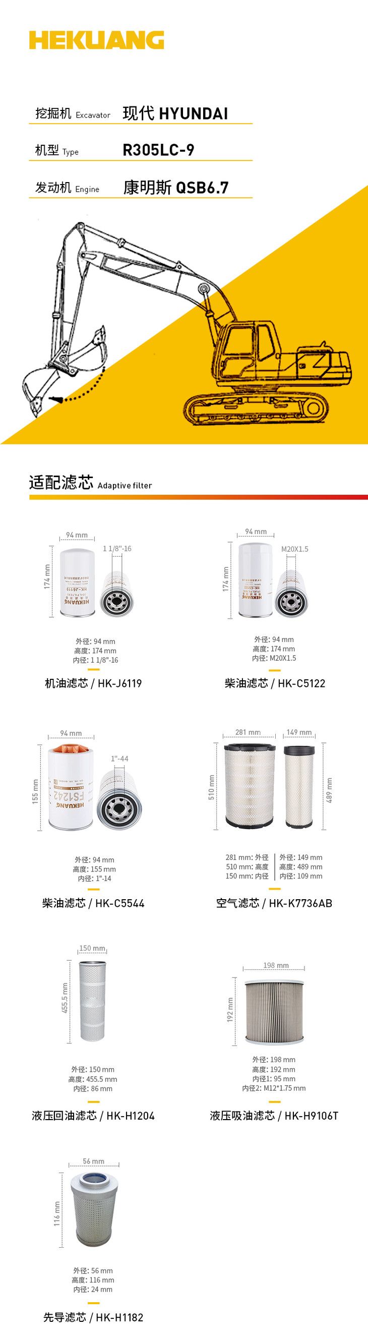 现代R305LC-9(康明斯QSB6.7)挖掘机滤芯 机油柴油空气滤芯 液压油先导滤芯