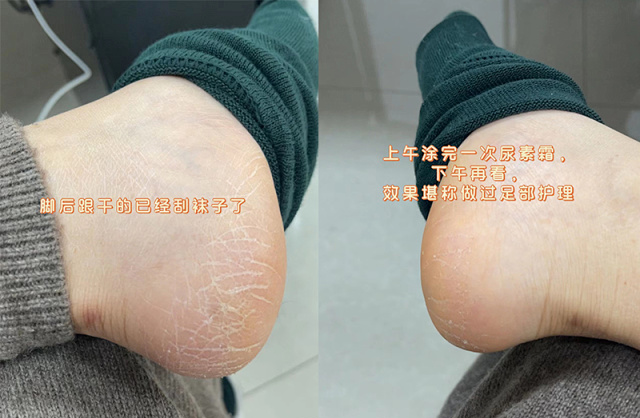之前我两只干裂的脚后跟效果对比,没有涂尿素霜的脚已经干裂的刮袜子了,特别粗糙;