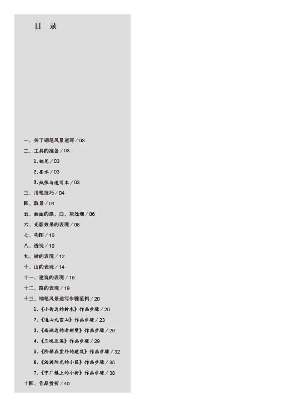 《钢笔风景速写》主要介绍了钢笔风景写生的工具、作画程序、作画技法,各种类型的景物如树、建筑物、路面等的具体画法。全书用形象的插图解读文字,并配以200幅左右的钢笔风景速写示范作品,图文并茂,便于读者对钢笔风景速写的直观了解和学习。