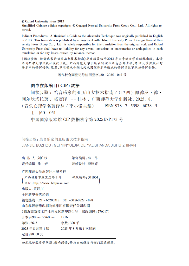 本书基于亚历山大的技术,从理论和实践的角度为音乐表演者提供了解决实际练习和舞台表演问题的方法和新思路。作者从身体和心理的角度出发,结合人体科学、心理学、运动学等多种思维,使音乐表演者了解自己的身体,帮助表演者缓解在练习和表演中由于身心失调引起的紧张和疲劳,发现并改进不良和无效的练习习惯,同时觉察及克服行为与思想模式中的惯性思维,进而正确使用自己的身体,获得身心和谐的表演体验。书中的洞见让我们开始重新思考身体与乐器的关系,对于培养健康与全面发展的专业音乐人才有着重大意义。