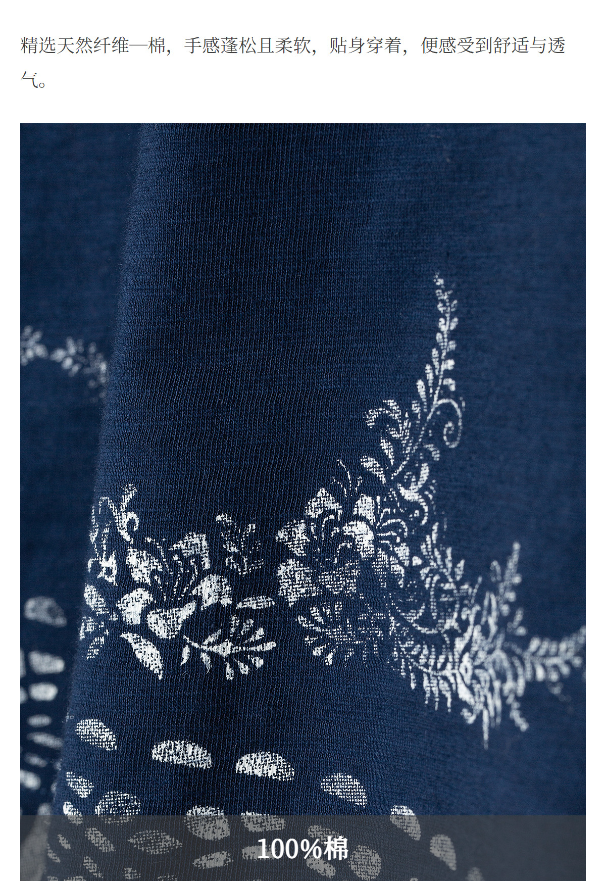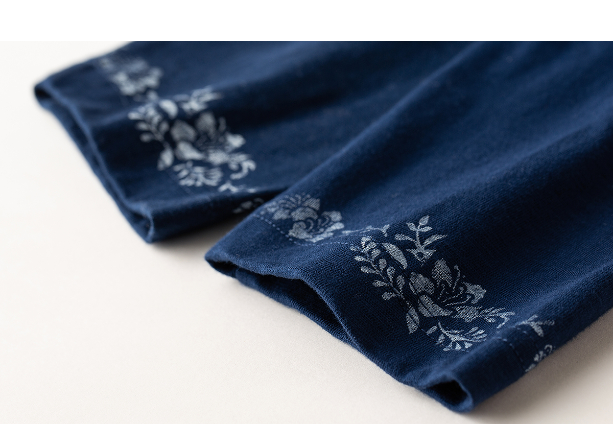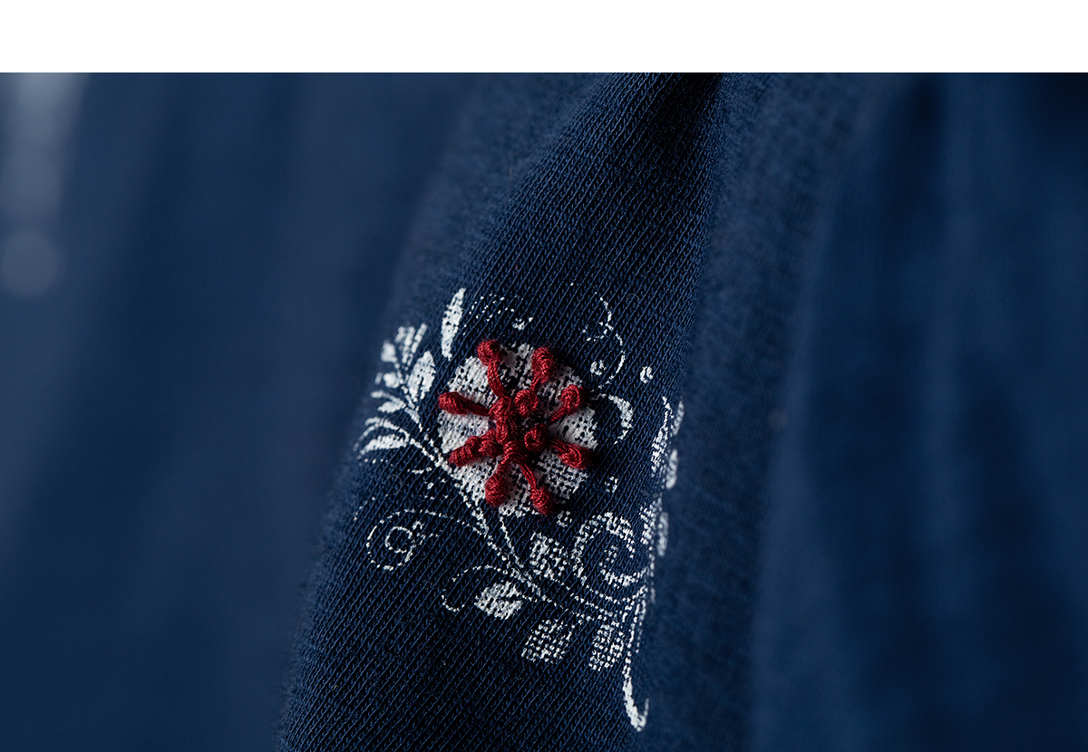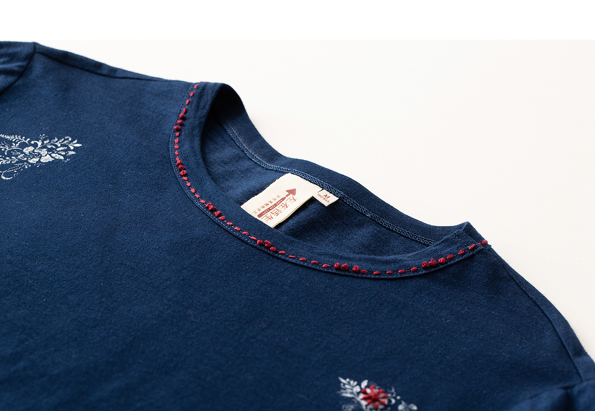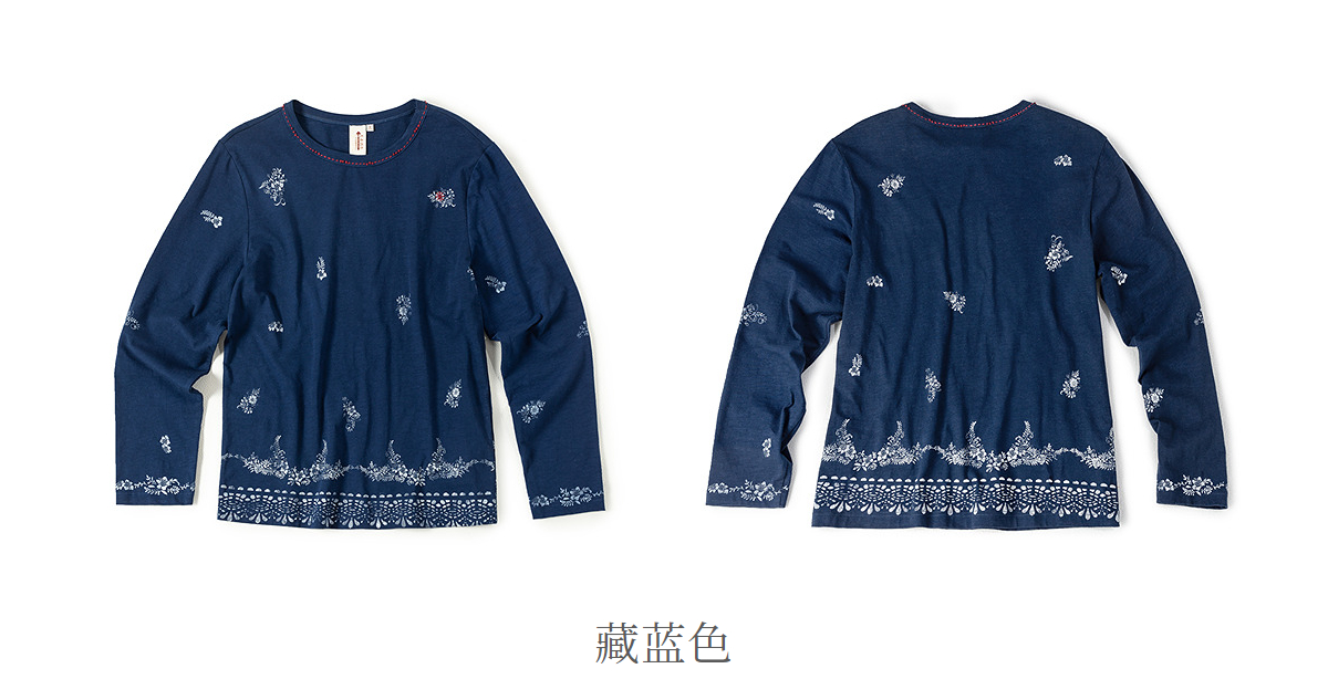 【林栖设计小店】手工打籽|纯棉藏青色优雅印花2026春新款复古长袖T恤1961159