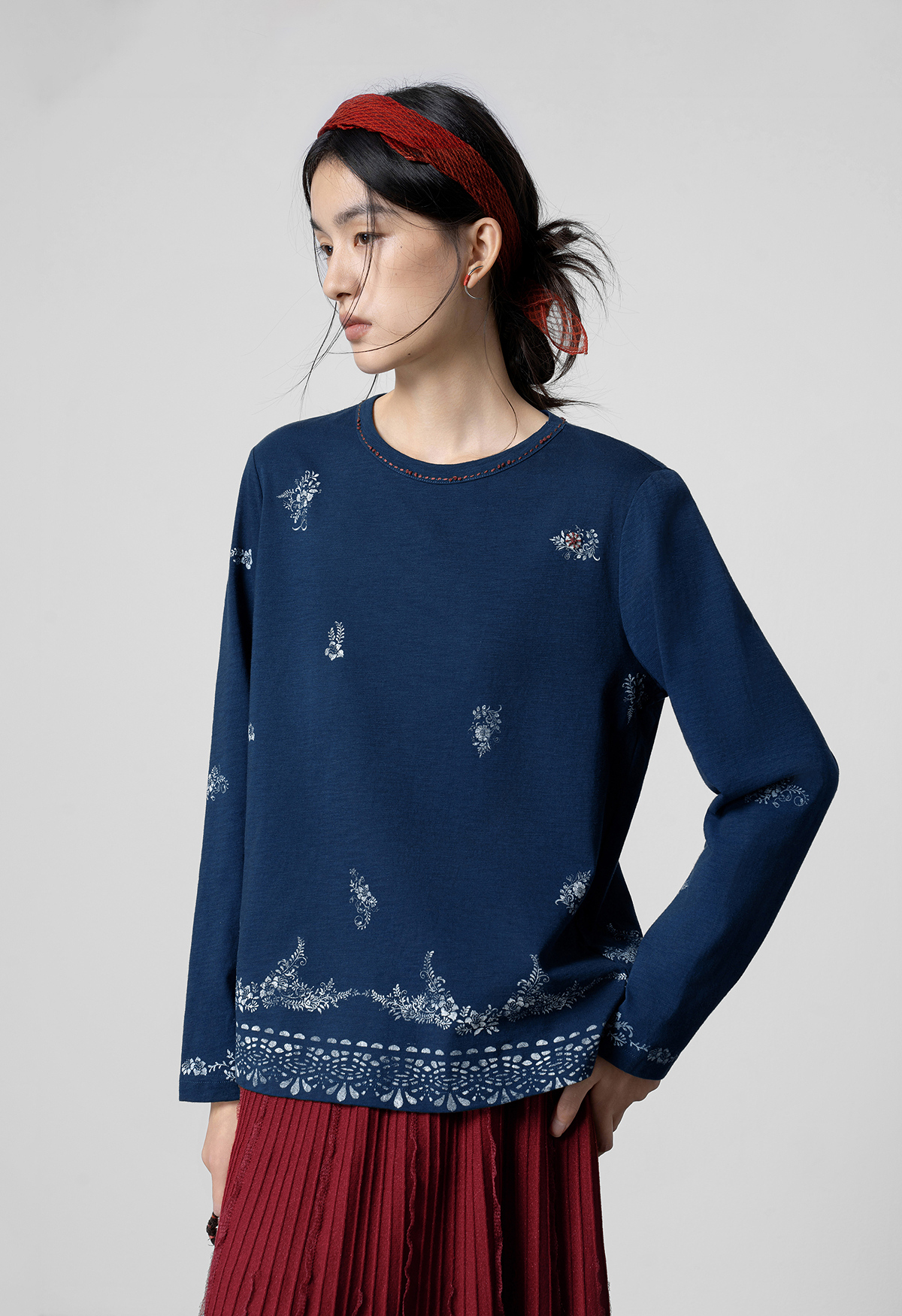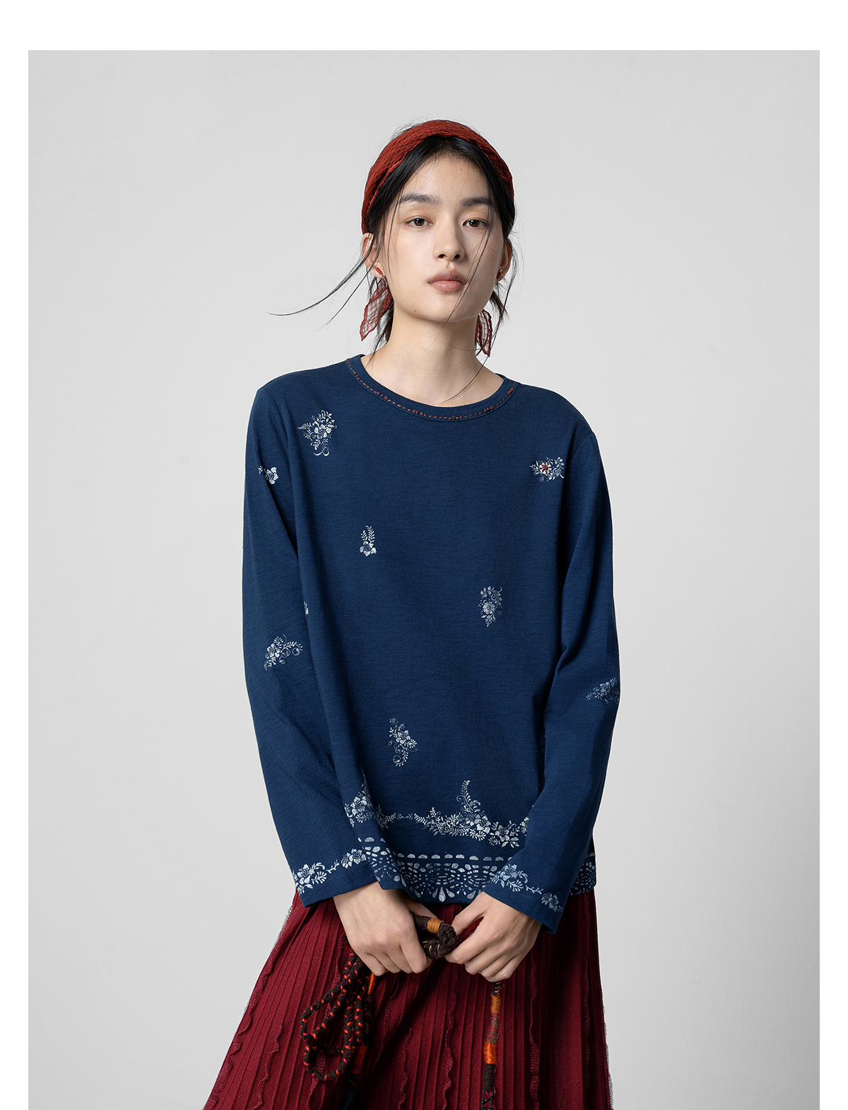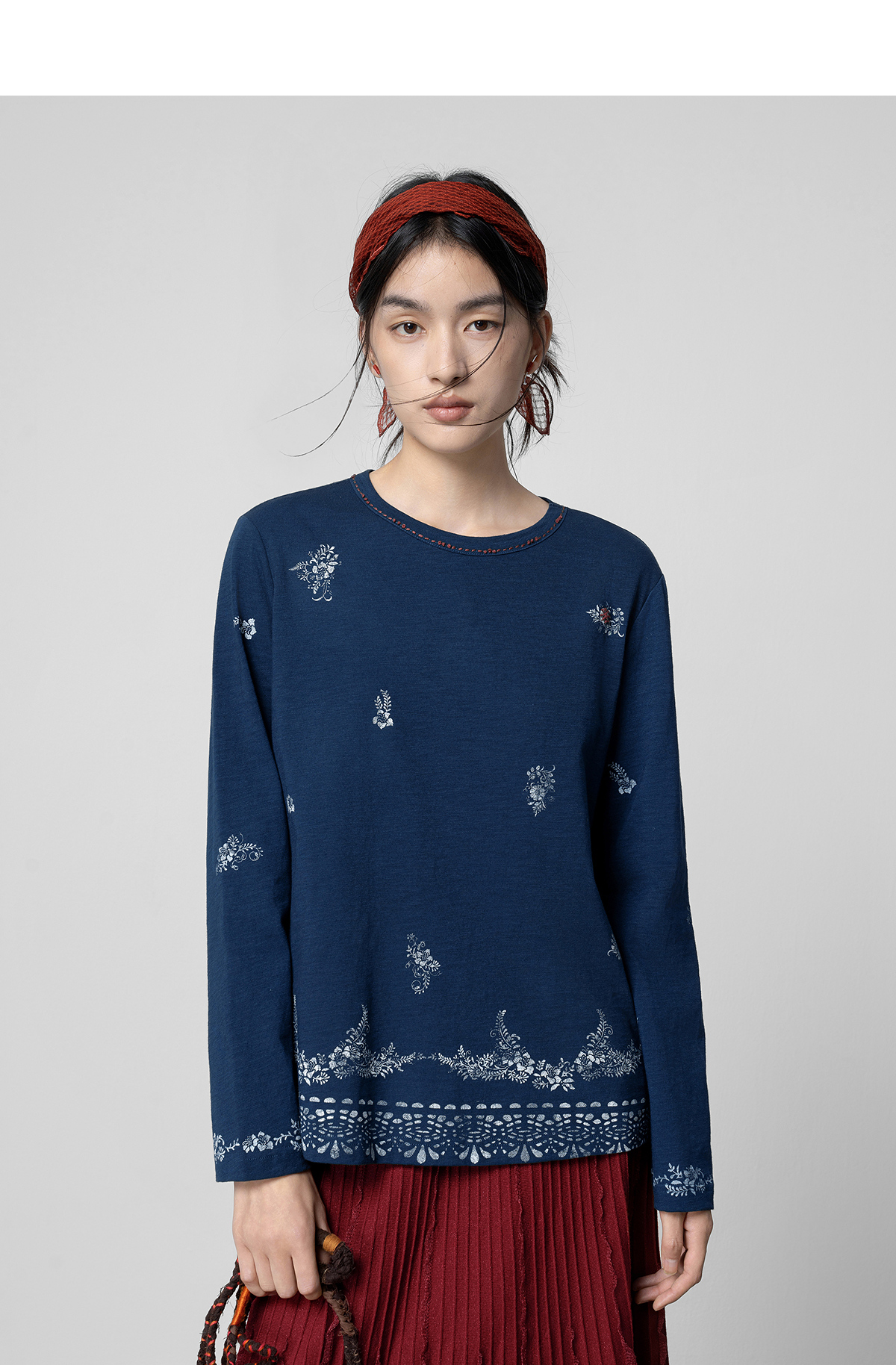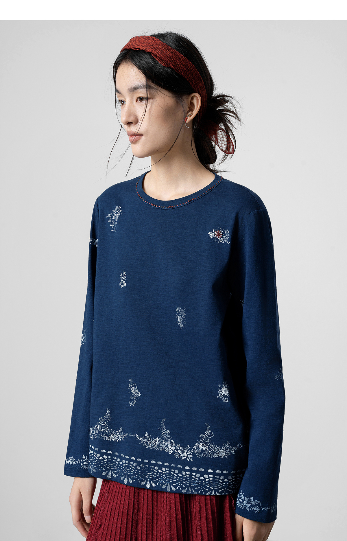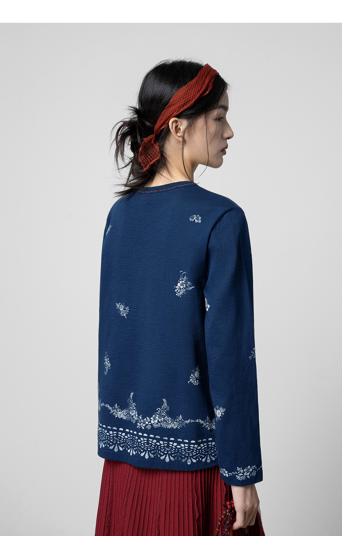 【林栖设计小店】手工打籽|纯棉藏青色优雅印花2026春新款复古长袖T恤1961159